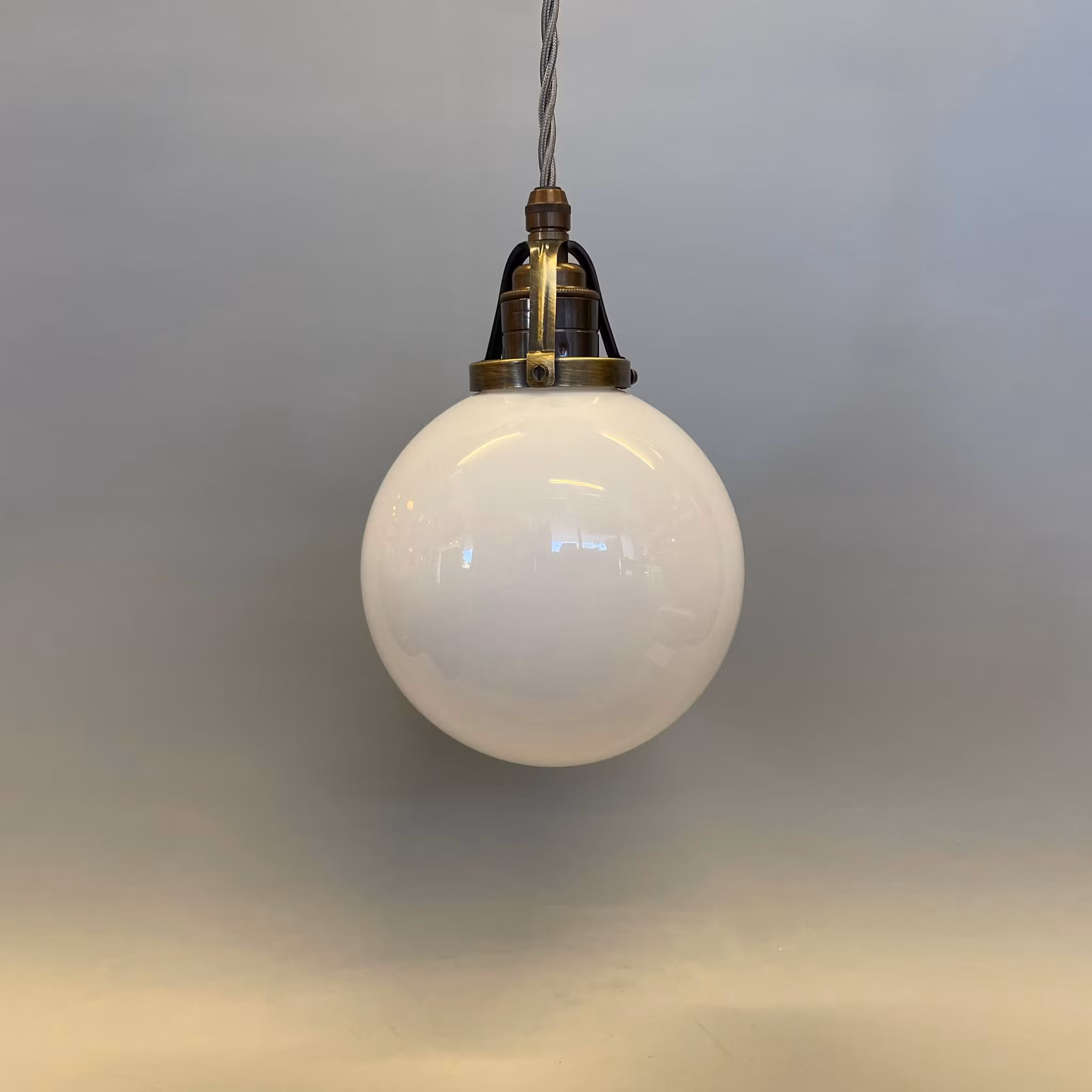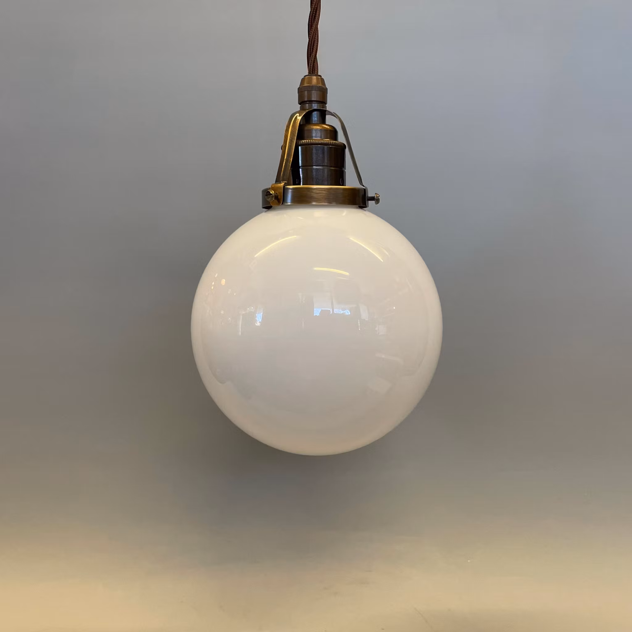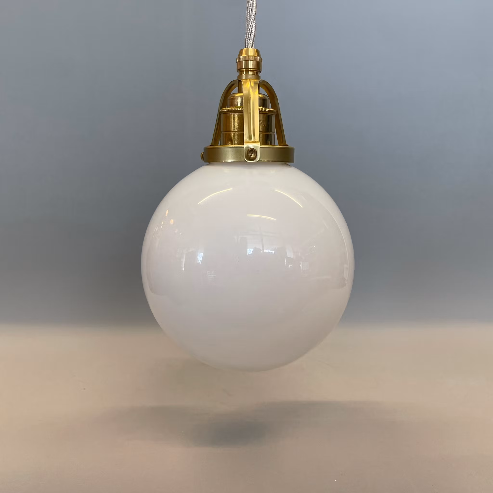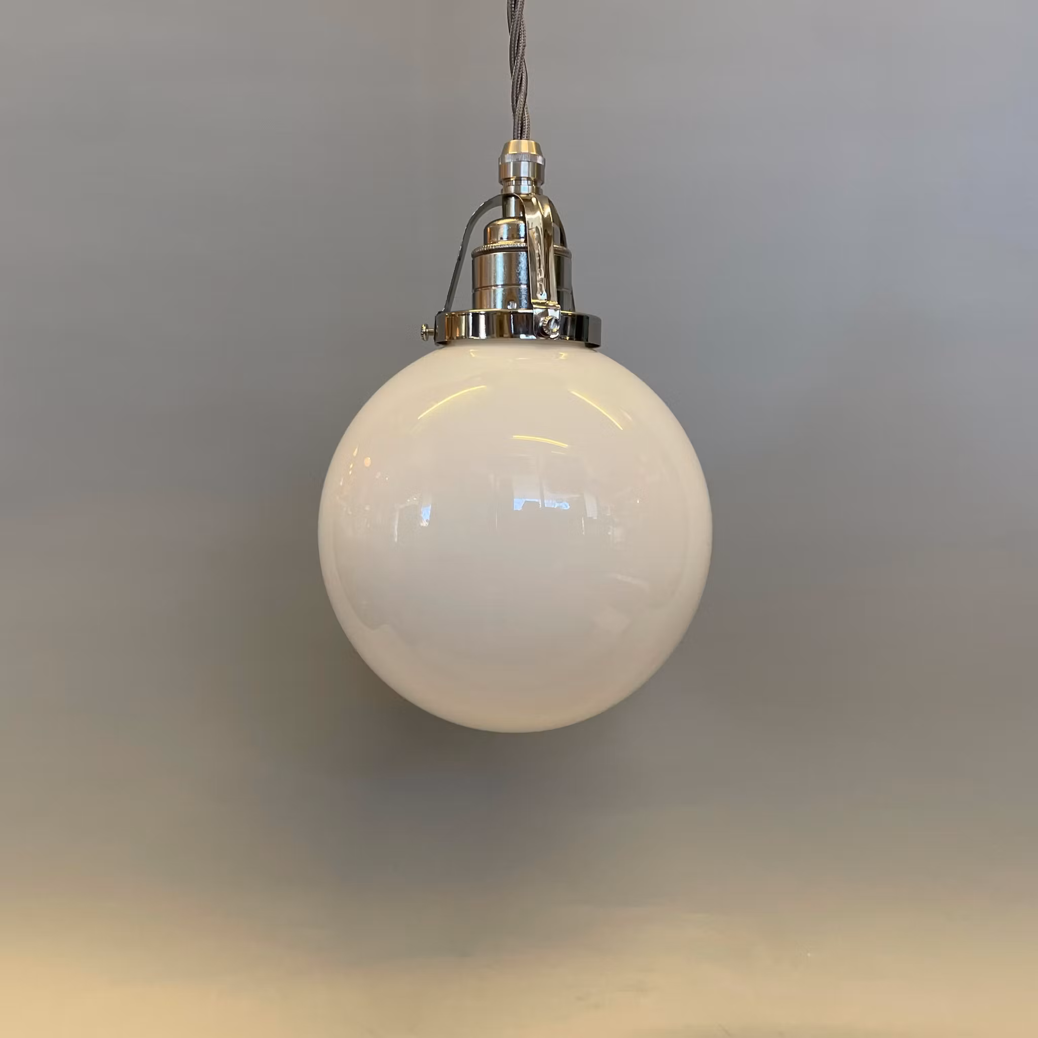 En riktig klassiker. Snygg opalvit klotkupa i glas med olika typer av upphäng att välja på. 15 cm i diameter. Tänk på att du behöver välja en aningen smalare typ av glödlampskropp för att den ska få plats igenom hålet i kragen.