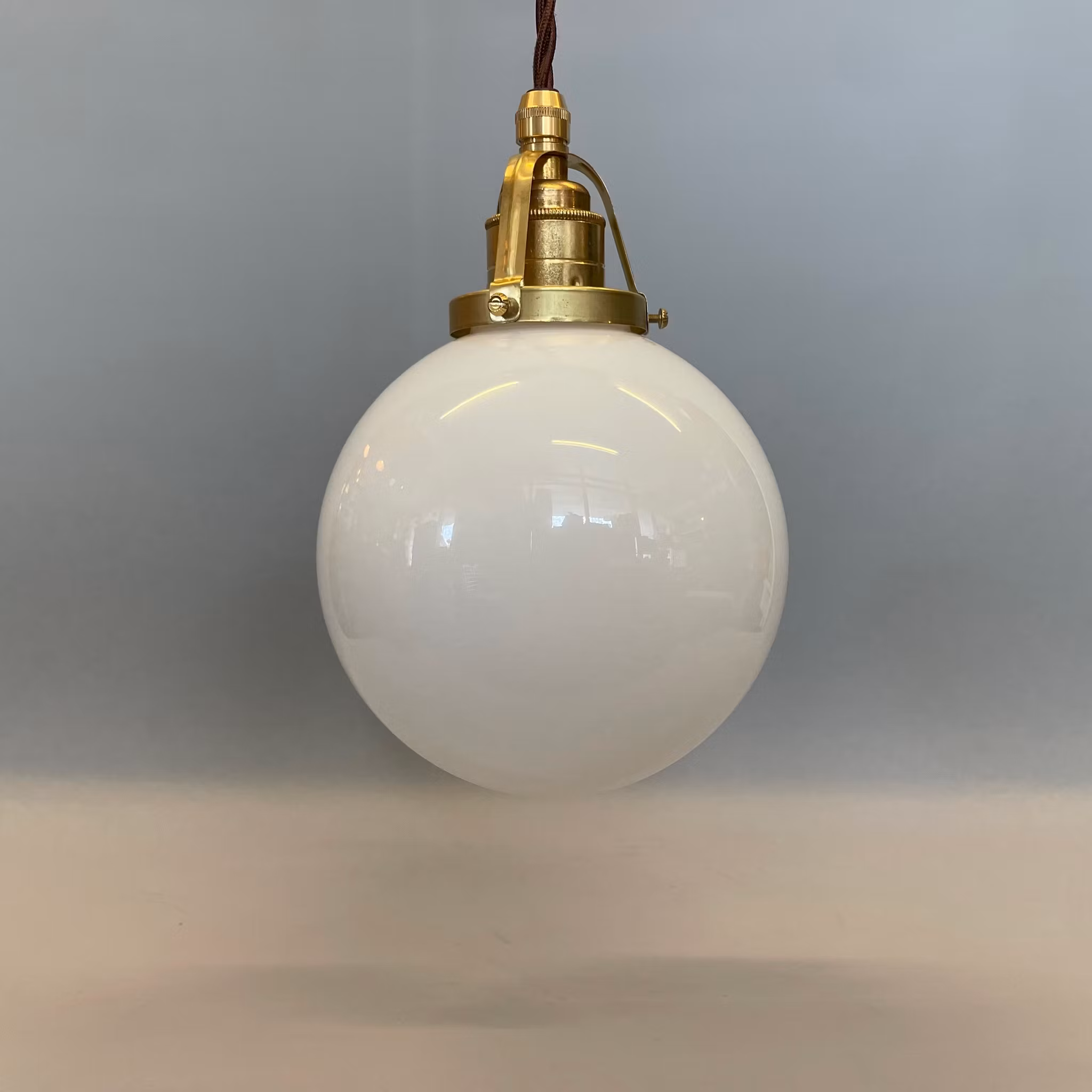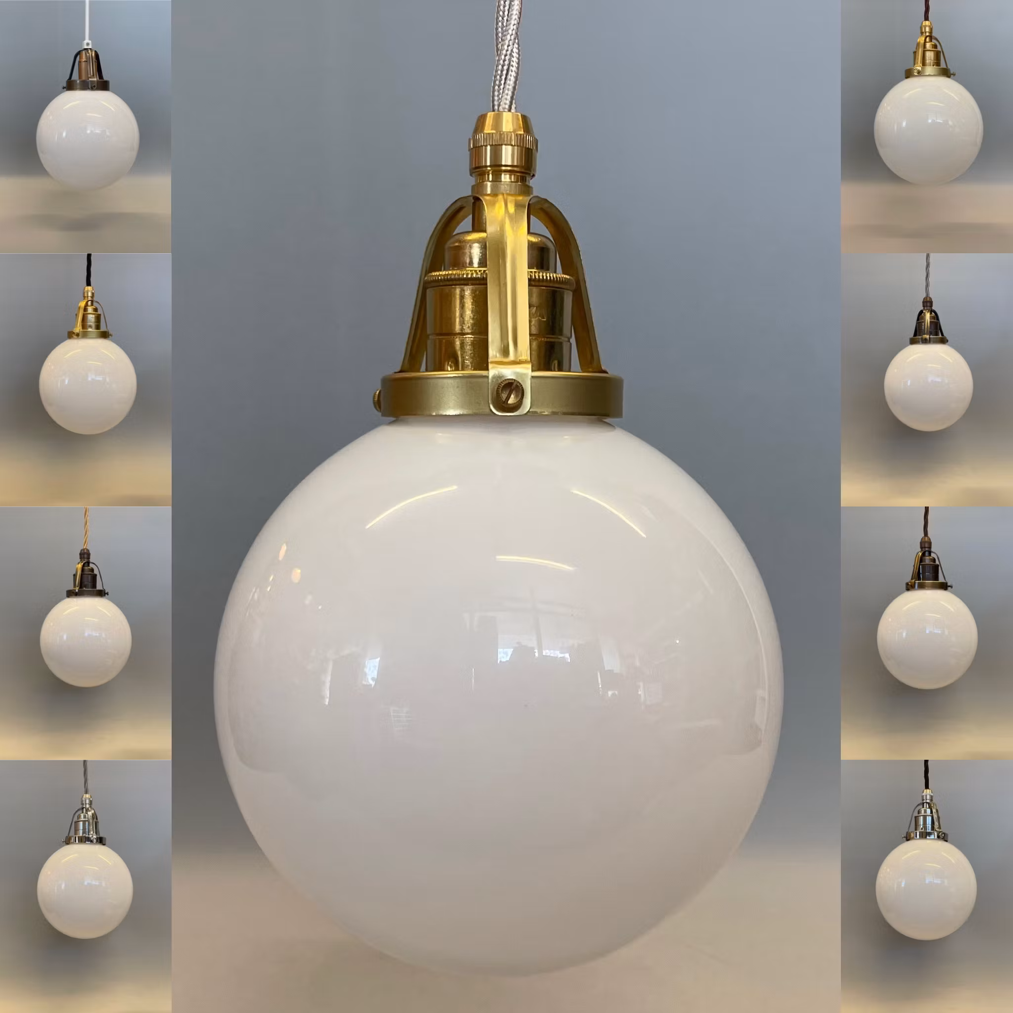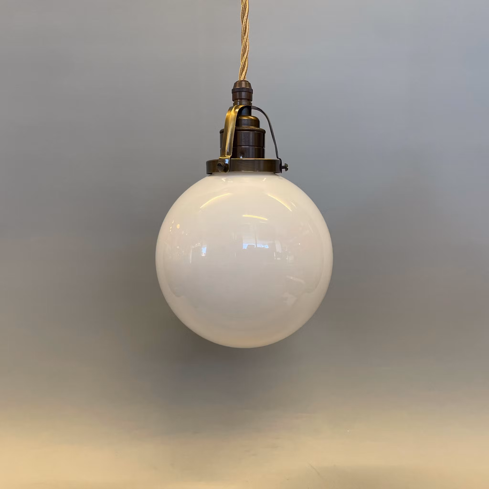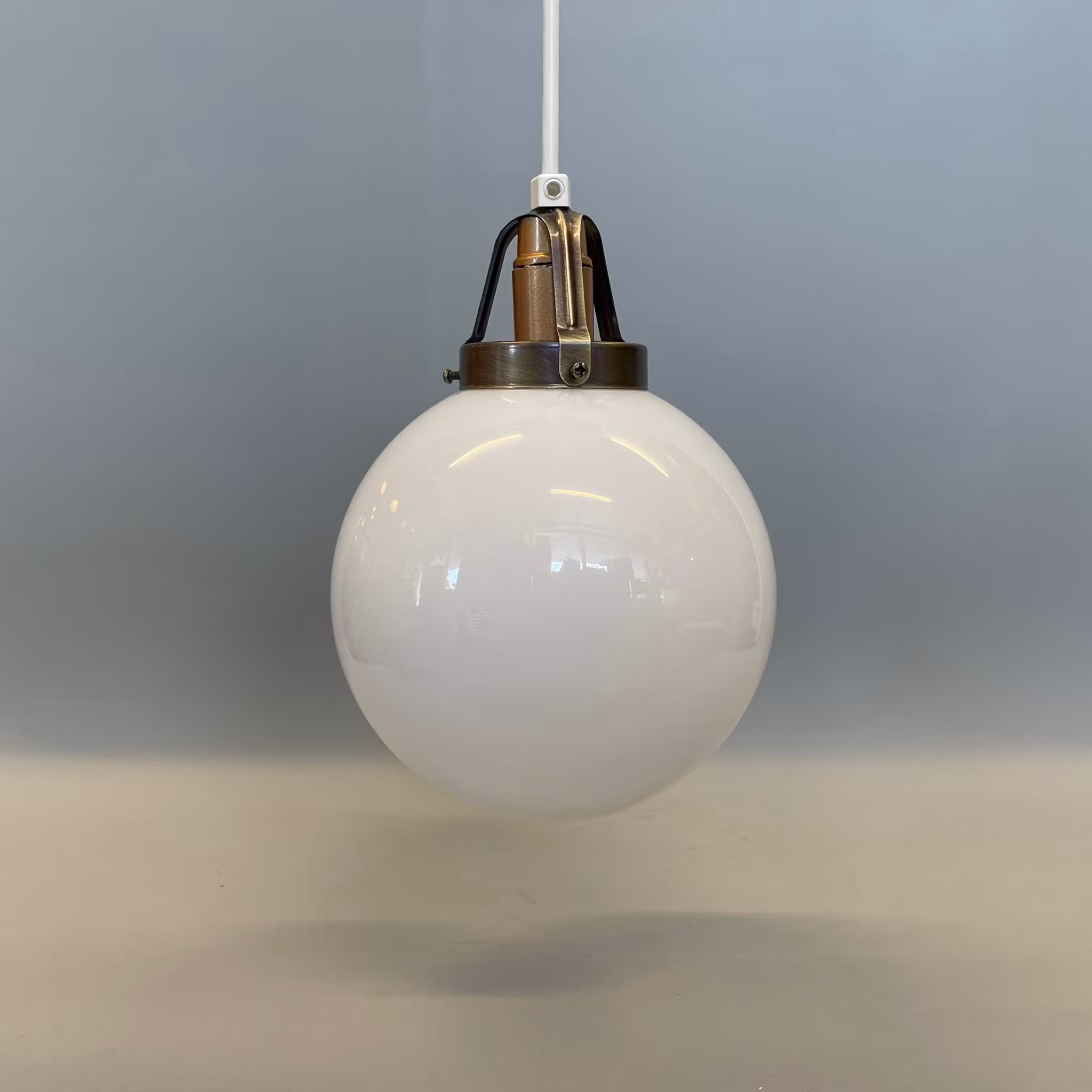 En riktig klassiker. Snygg opalvit klotkupa i glas med olika typer av upphäng att välja på. 15 cm i diameter. Tänk på att du behöver välja en aningen smalare typ av glödlampskropp för att den ska få plats igenom hålet i kragen.