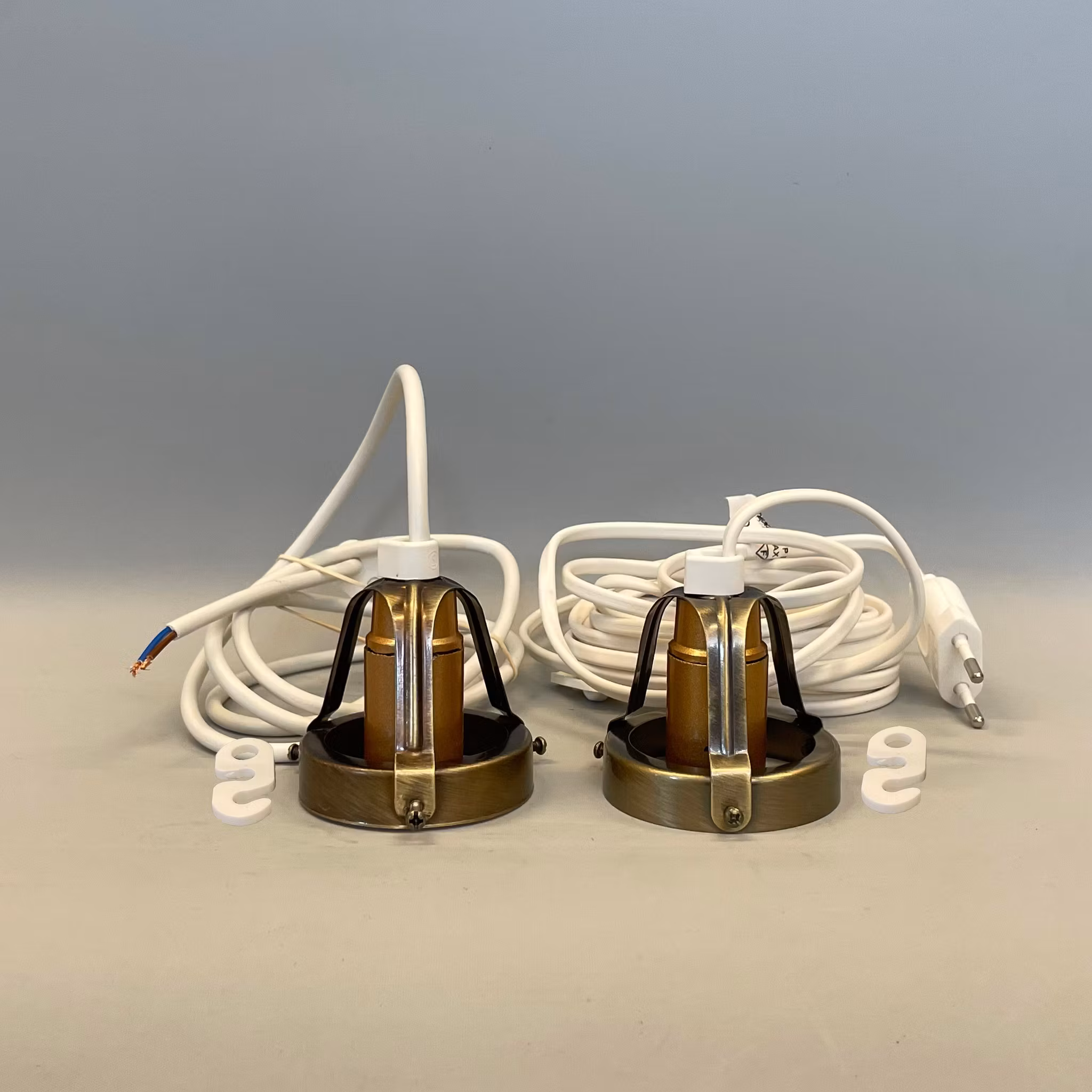 1) Det enklaste är i vit dubbelisolerad plast med ett metallfäste för lampskärmen i antikpatinerad metall. Här kan ni välja mellan 130 cm med klippt kabel (för att själva montera valfri kontakt) eller 390 cm med europakontakt för vägguttag.