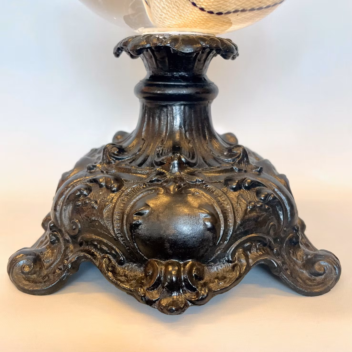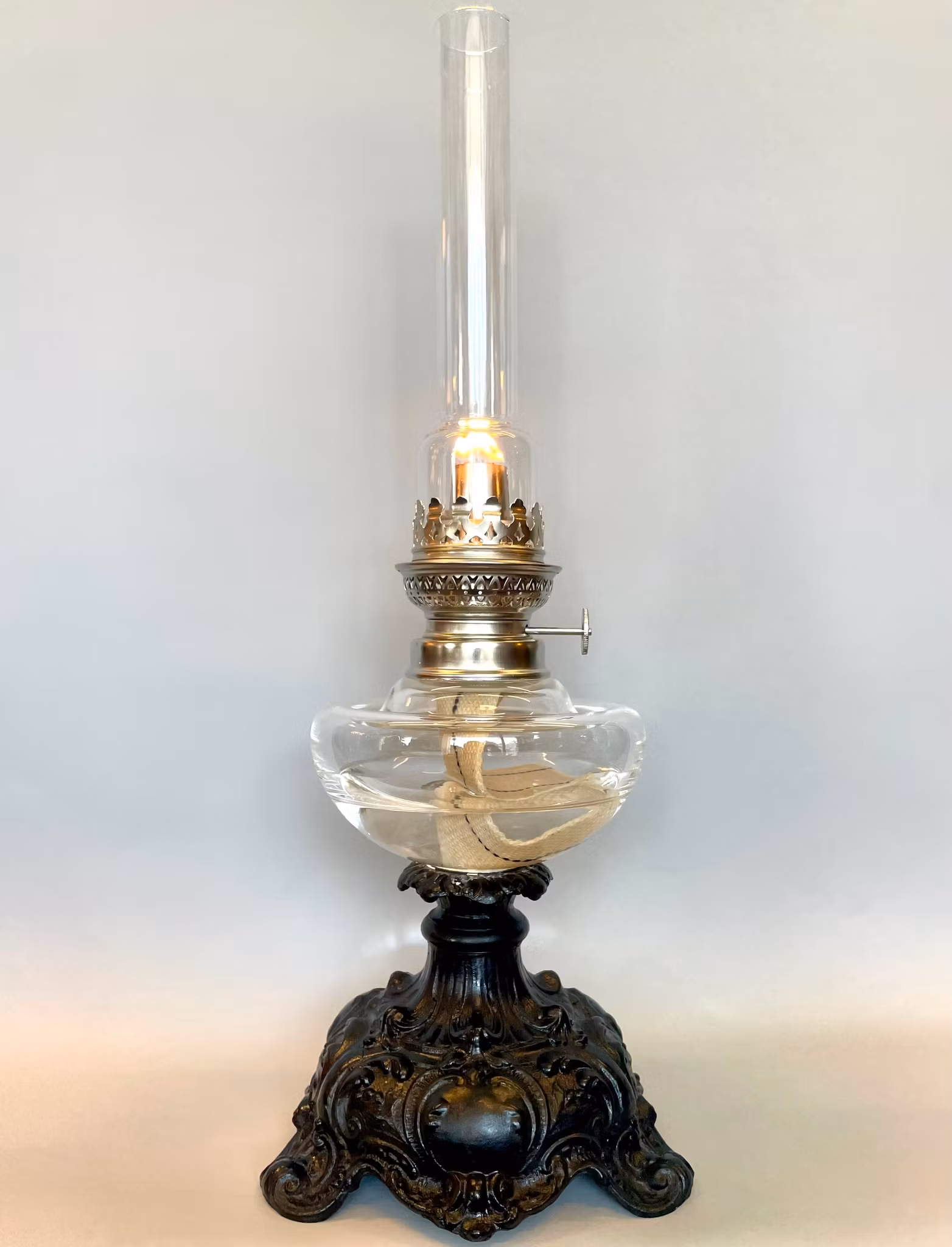 En klassisk mindre bordsfotogenlampa med snyggt oljehus i klart glas och lampfot i svartmålat zinkgjutgods.