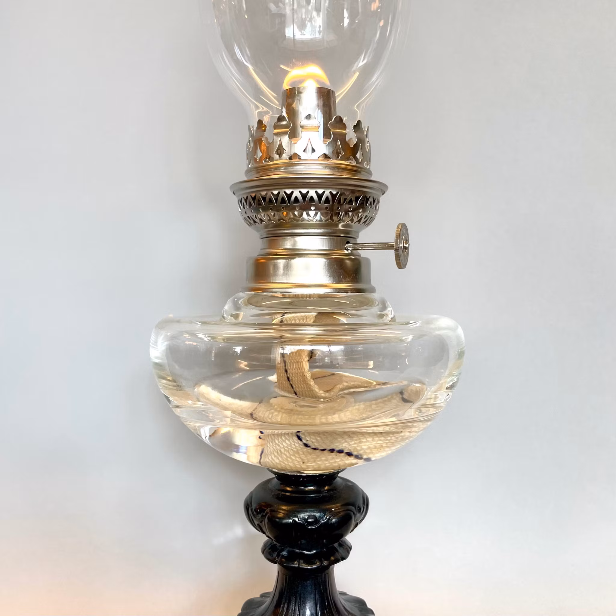 En klassisk mindre bordsfotogenlampa med snyggt oljehus i klart glas och lampfot i svartmålat zinkgjutgods.