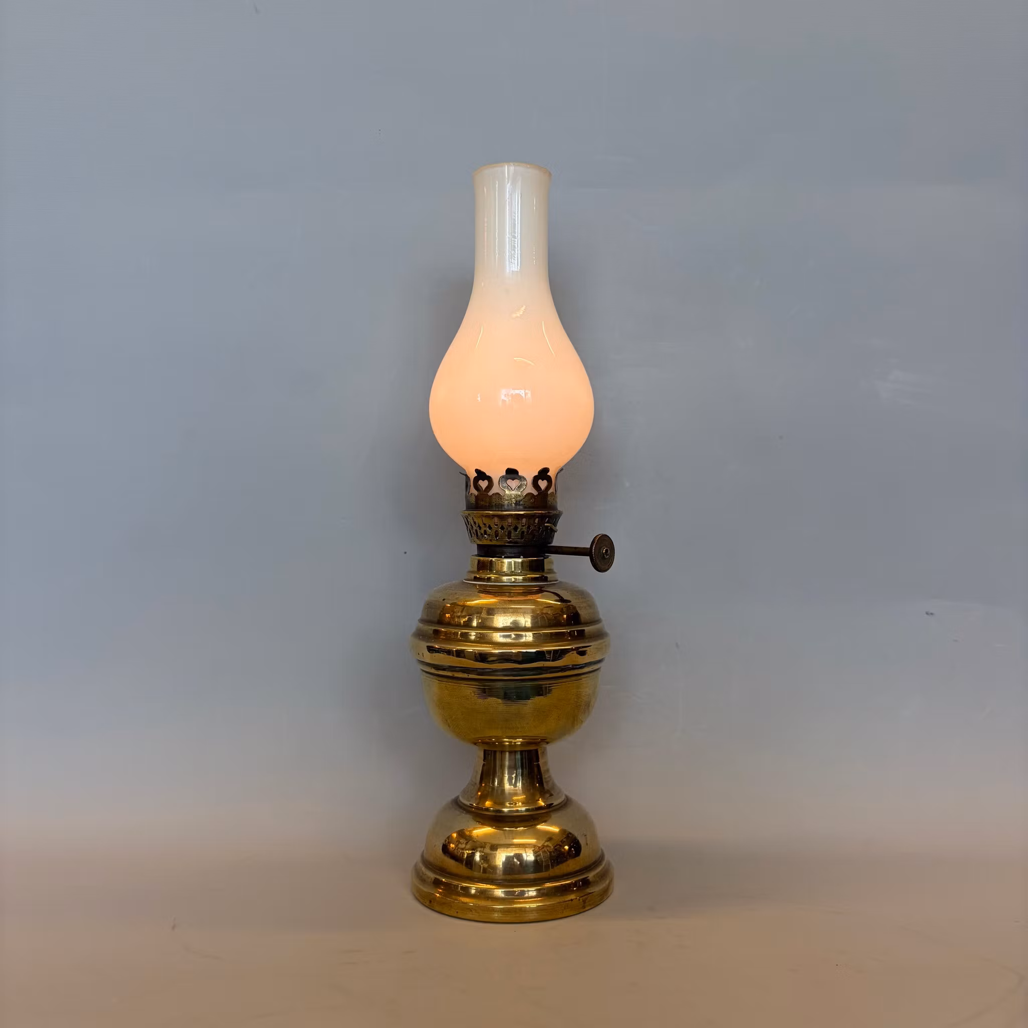 En näpen liten fotogenlampa med oljehus i mässing och en 3''' flatbrännare med opalvitt glas. Foten är tung.