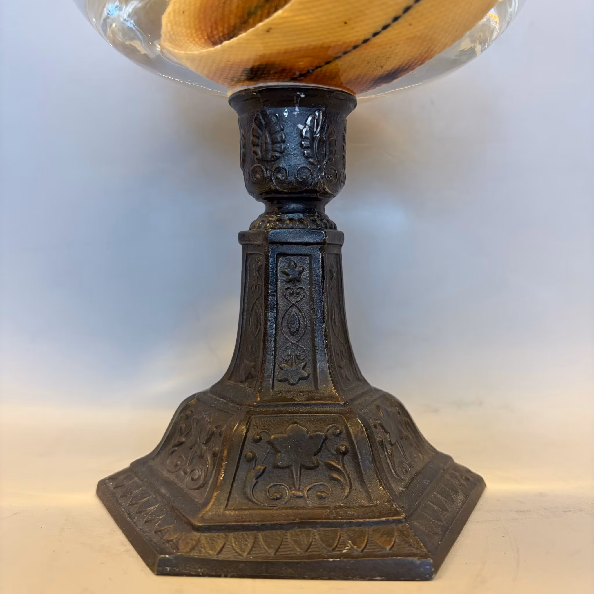 En klassisk mindre bordsfotogenlampa med oljehus i glas och ny lampfot.