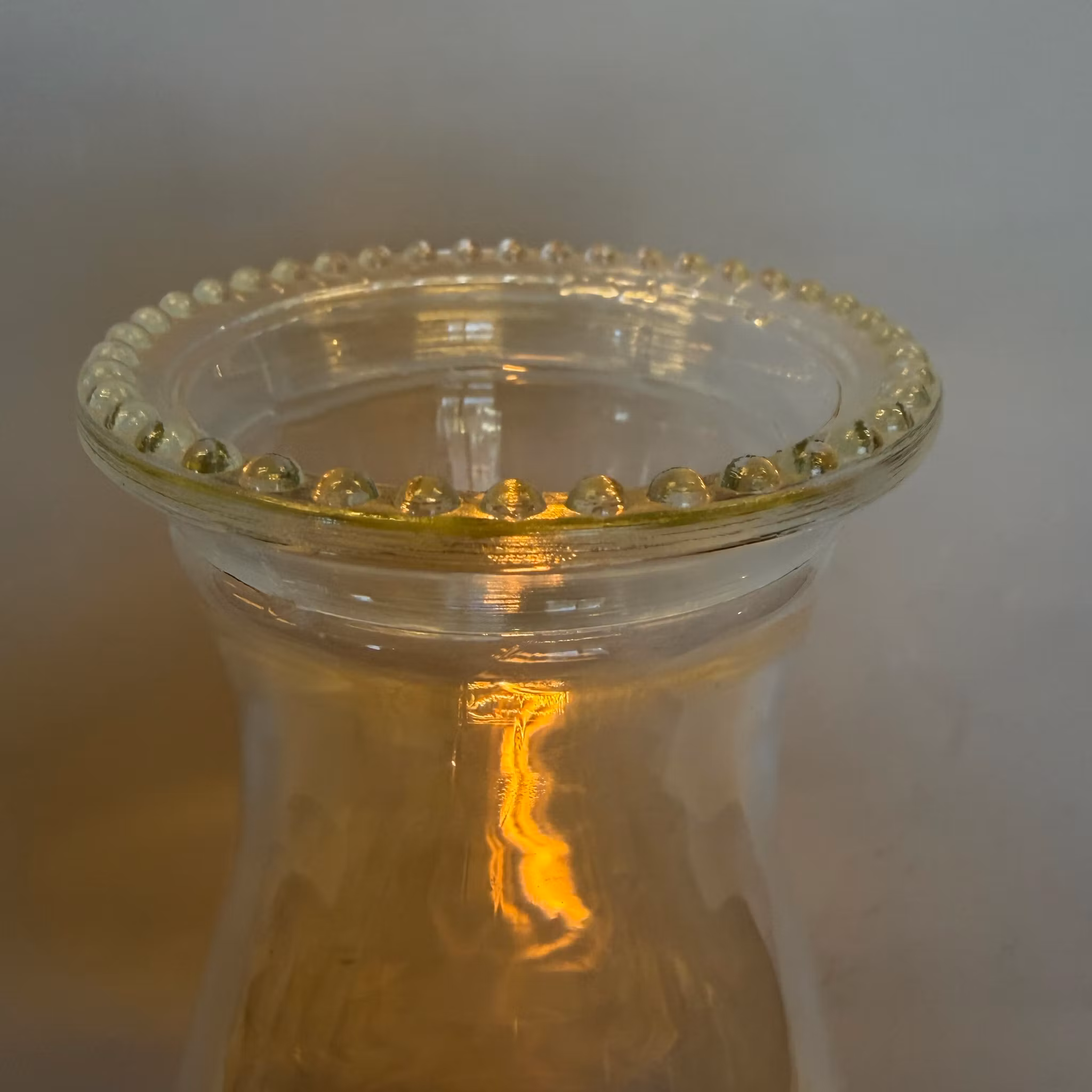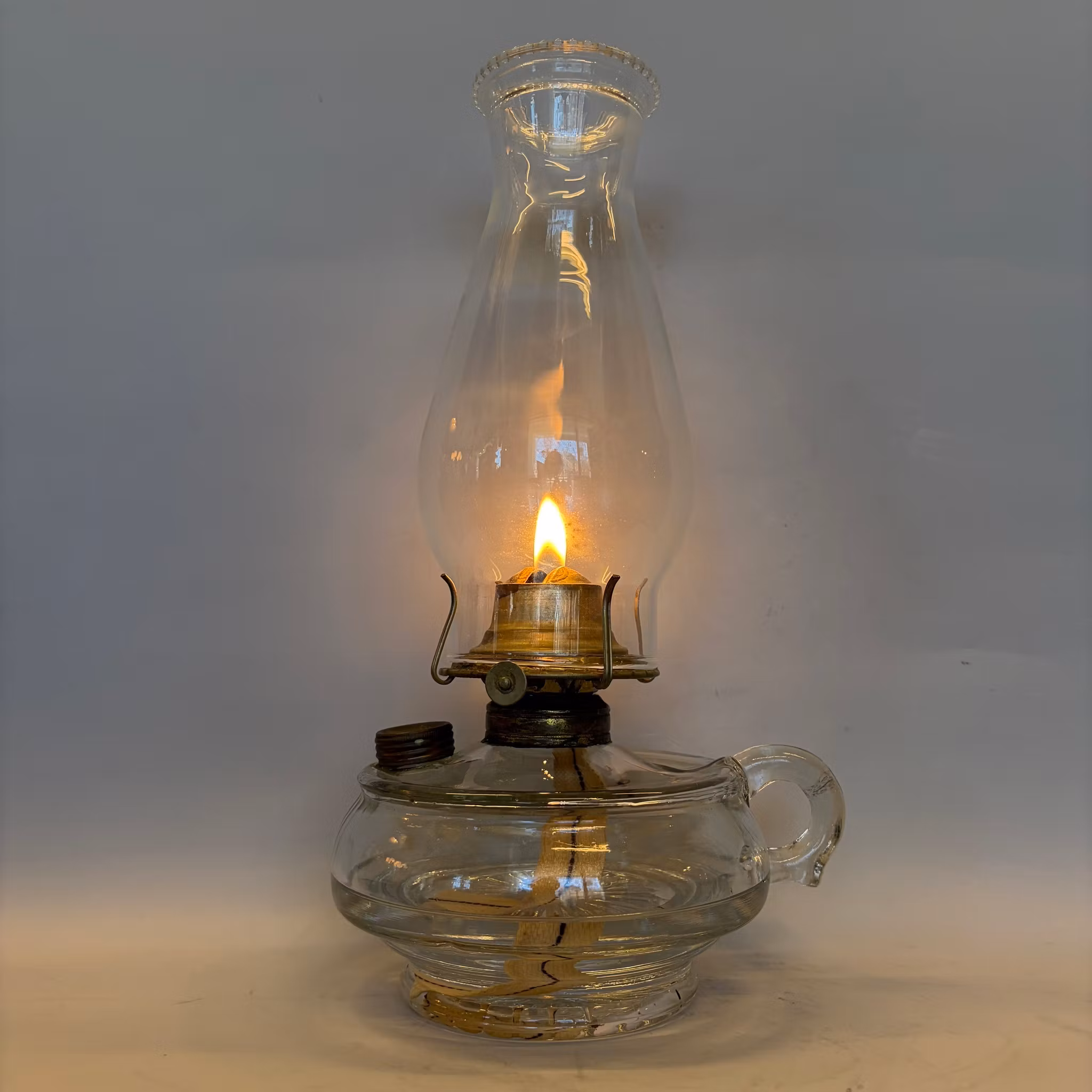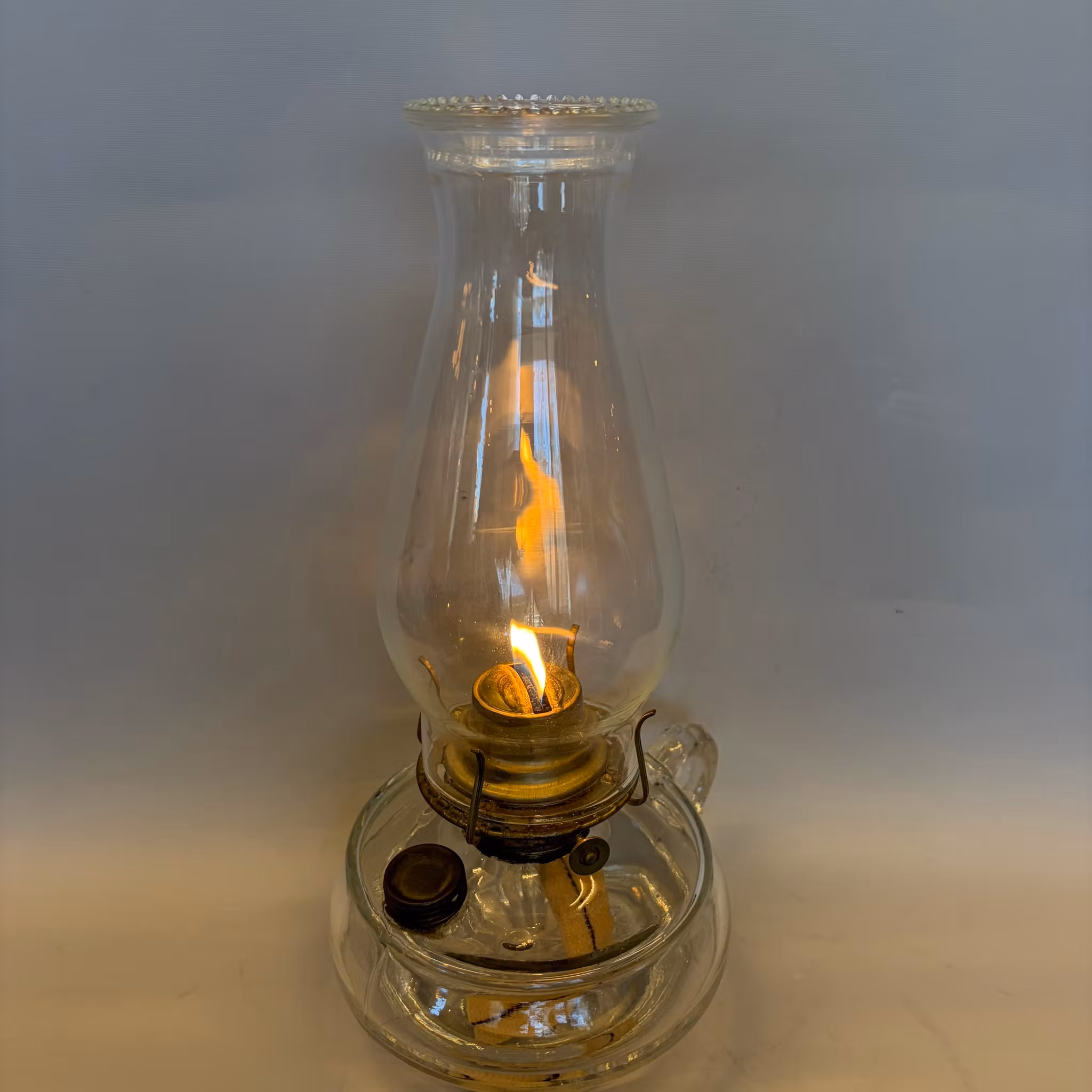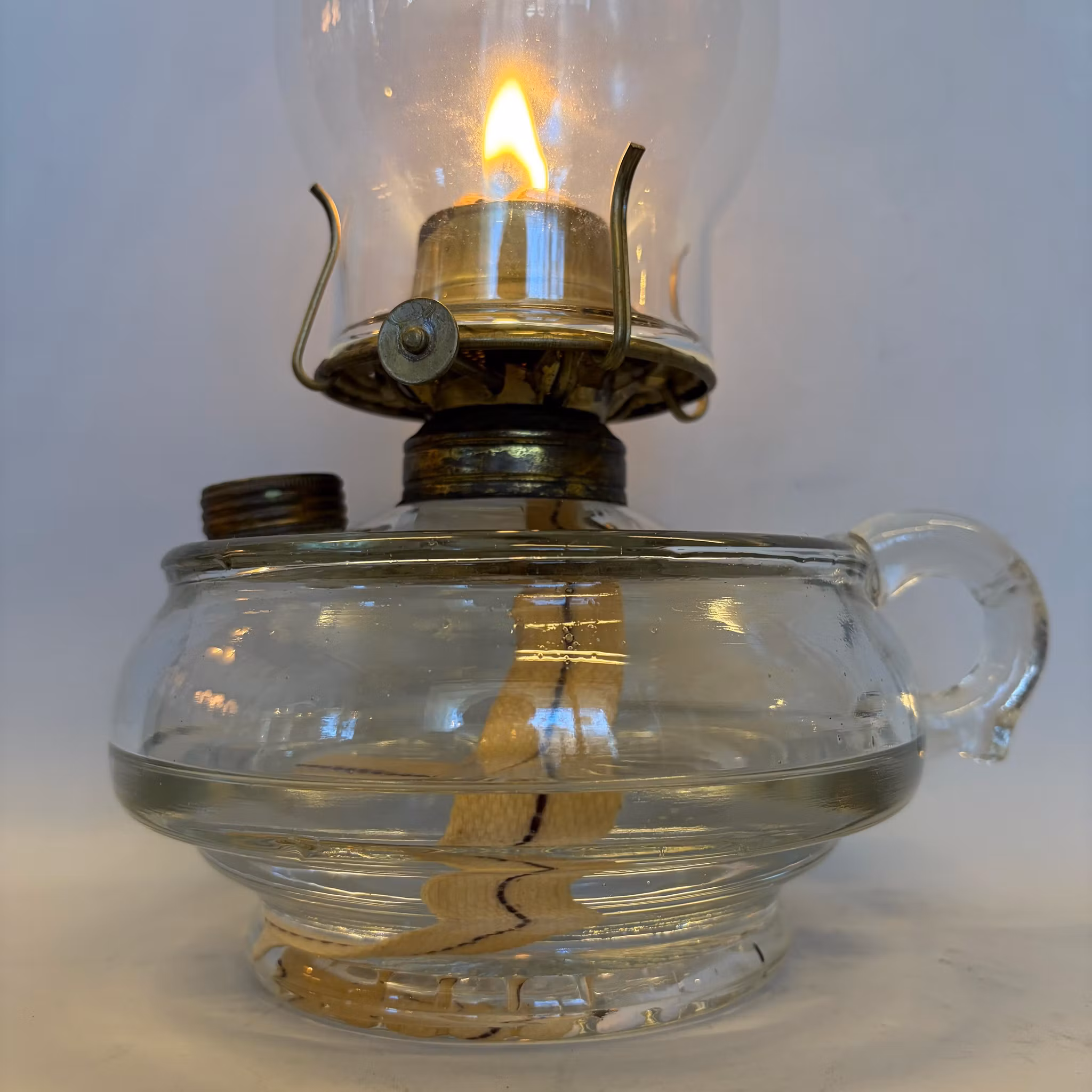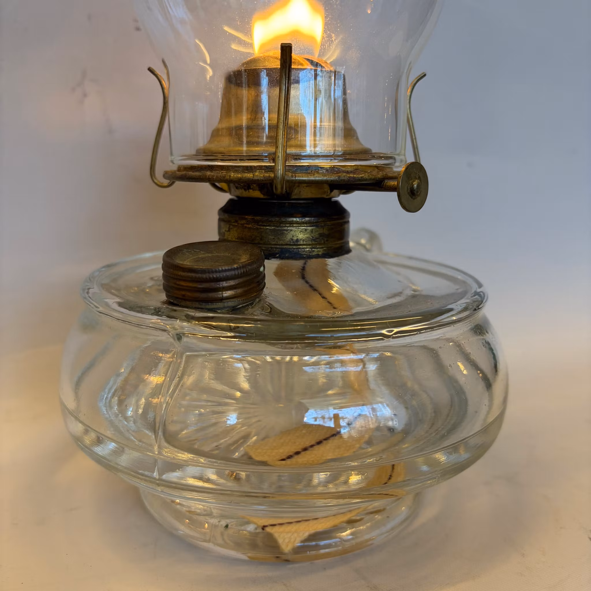 En väldigt elegant liten fotogenlampa med oljehus i glas och ett handtag. Den har en vacker lotusbrännare och ett tanklock.