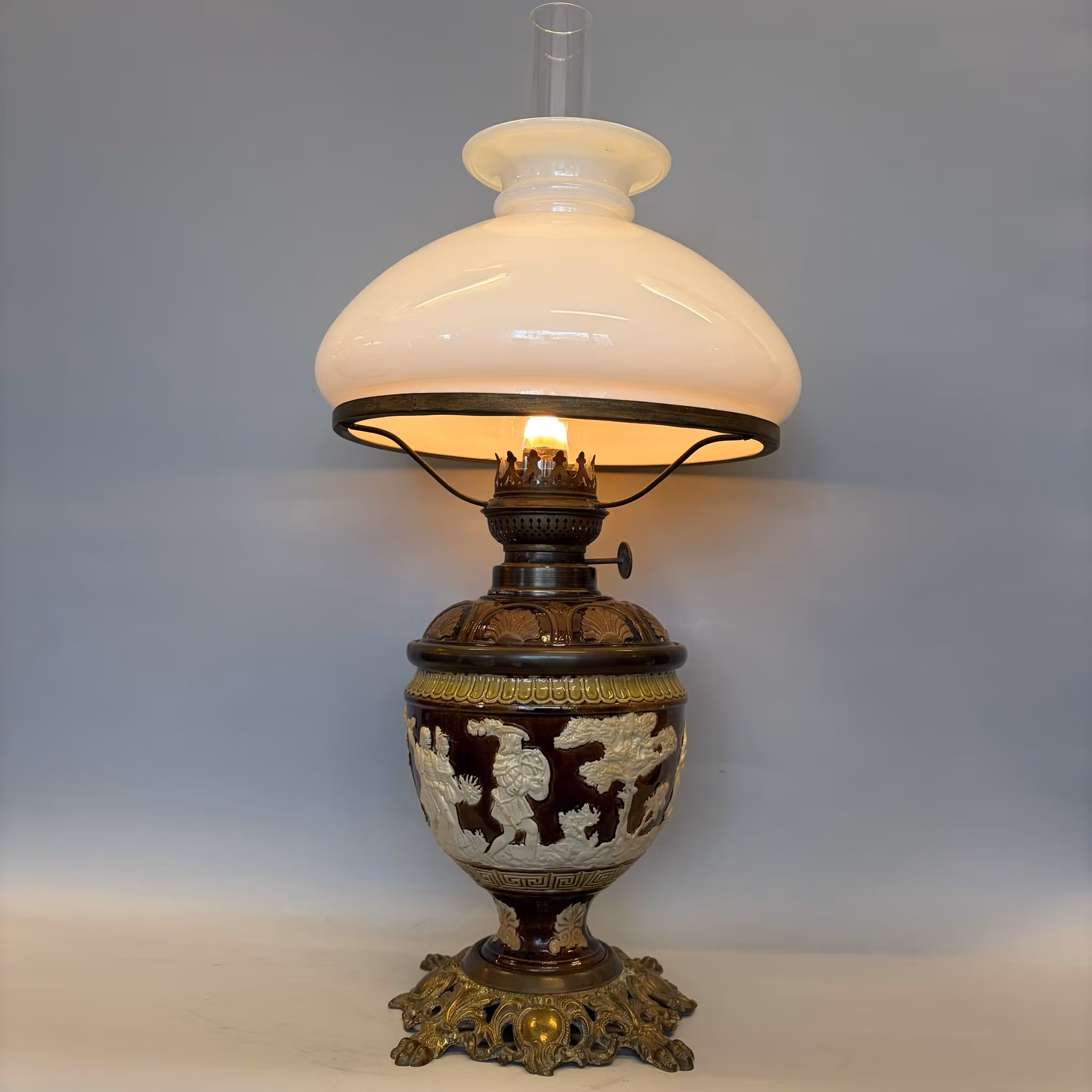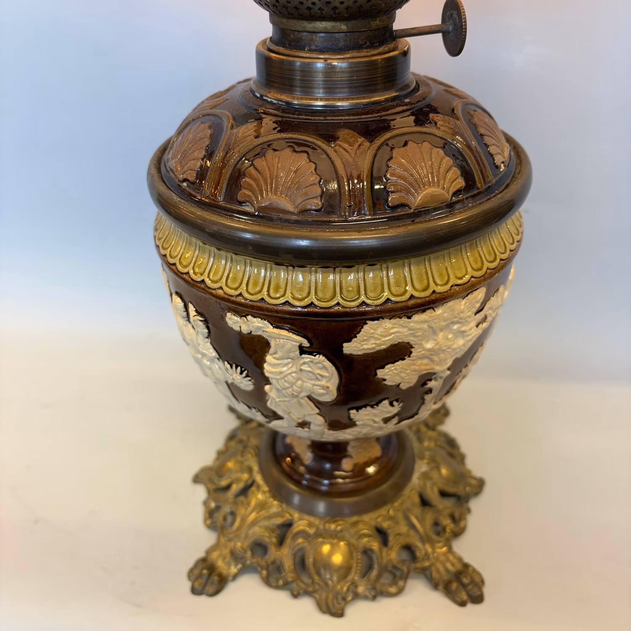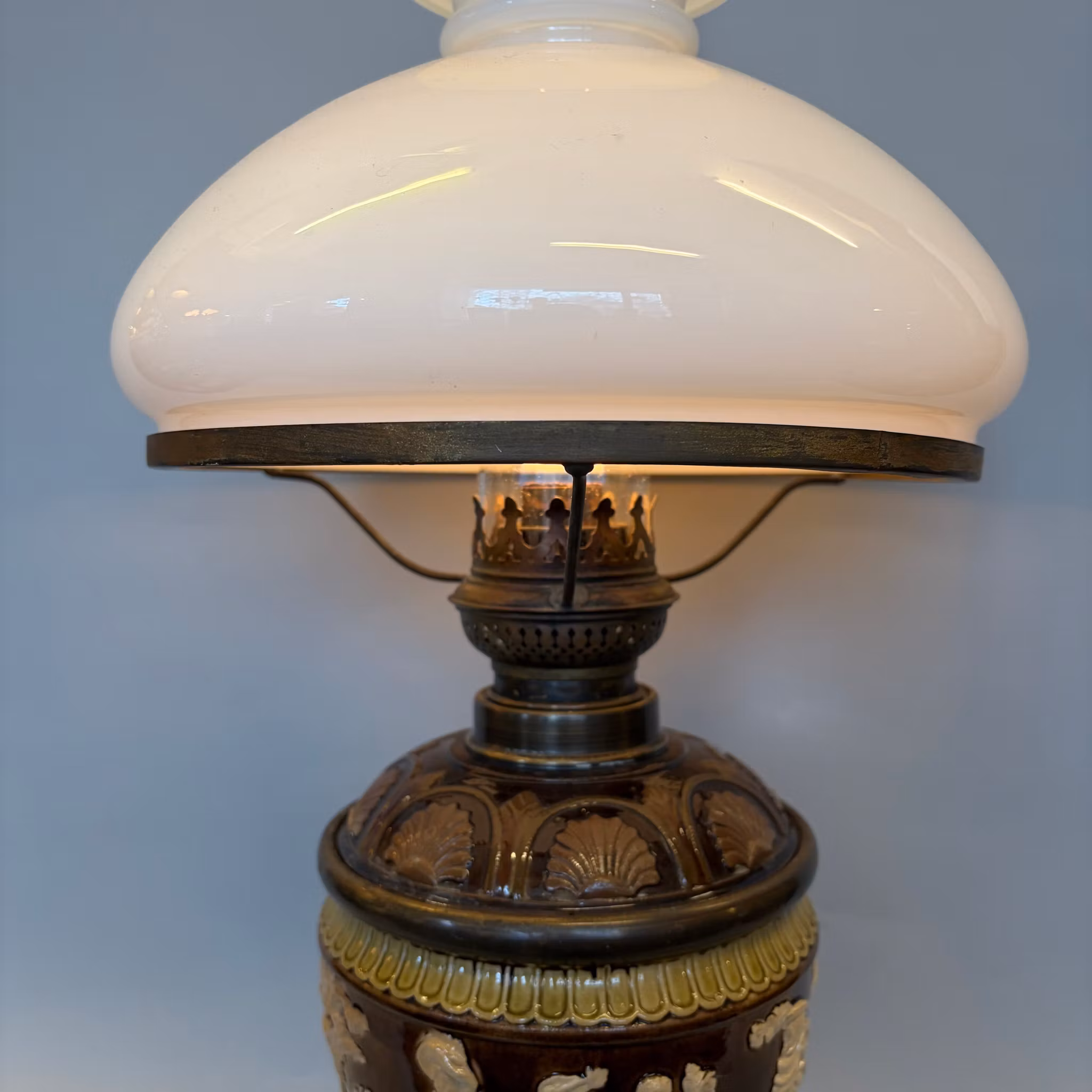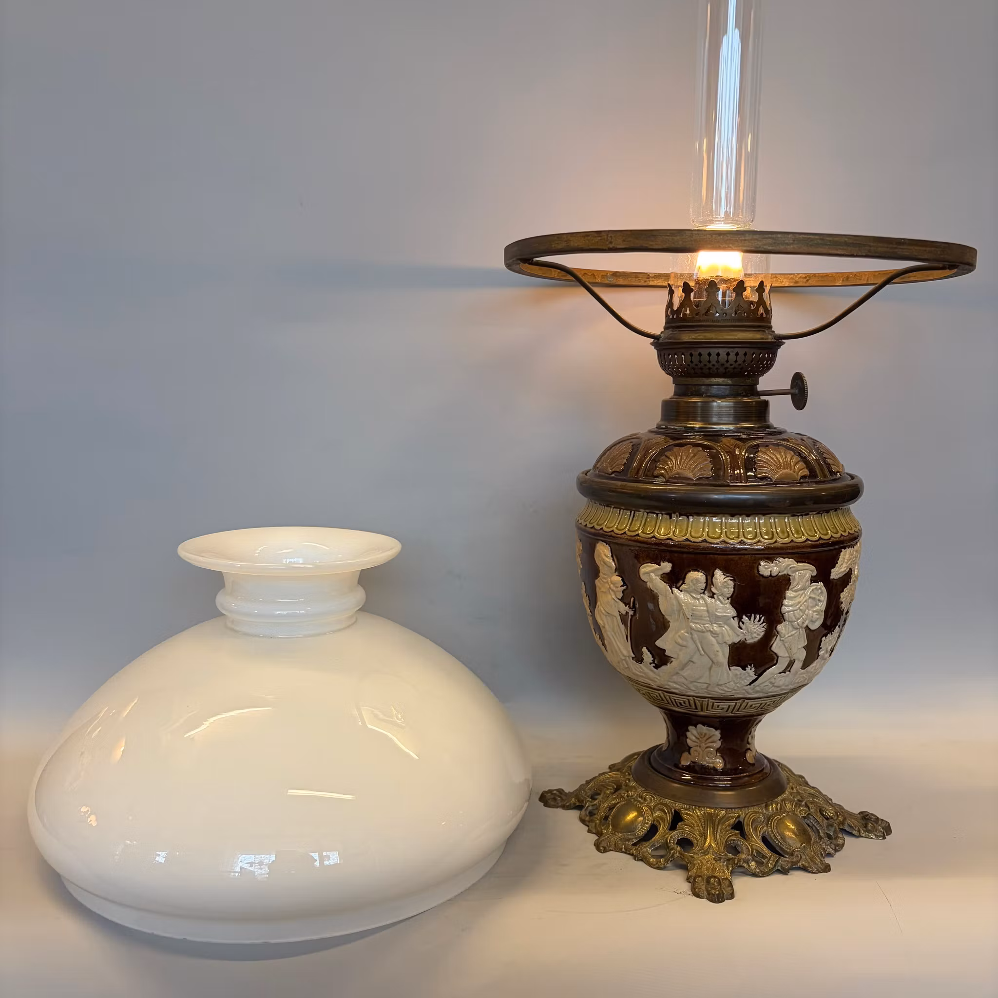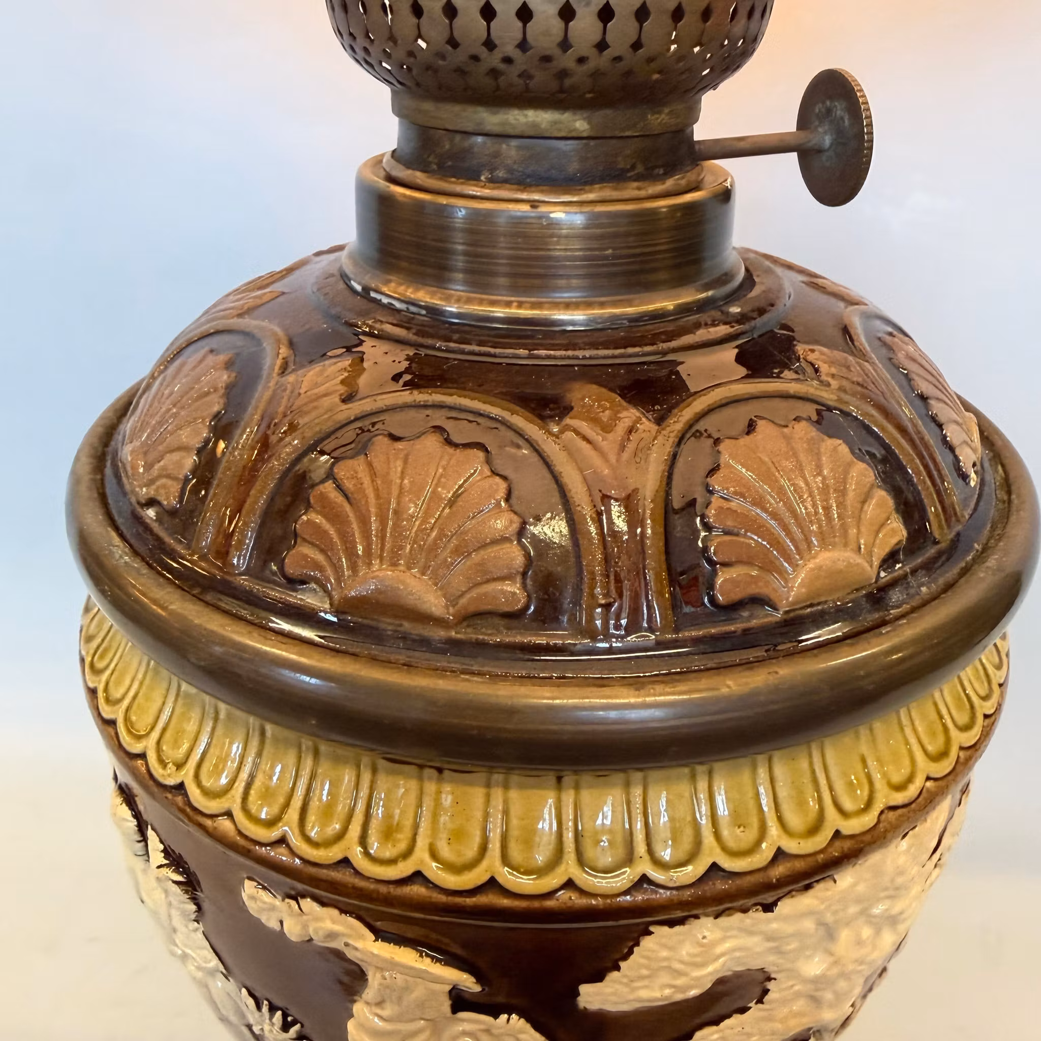 En unik antik fotogenlampa med majolikafot i brunt och antiksvitt med meandermönster samt en antik 235 mm vestaskärm med vikt krage.