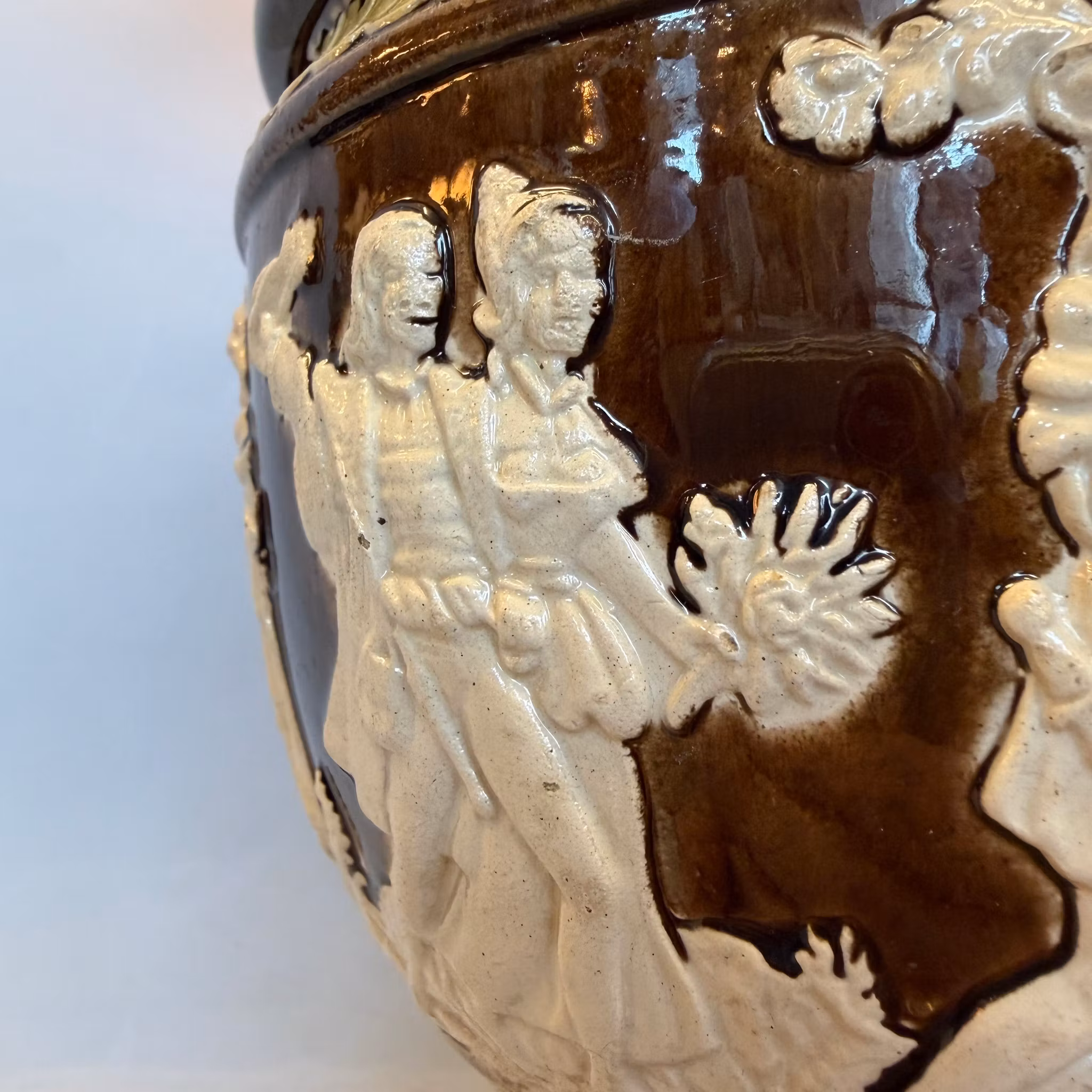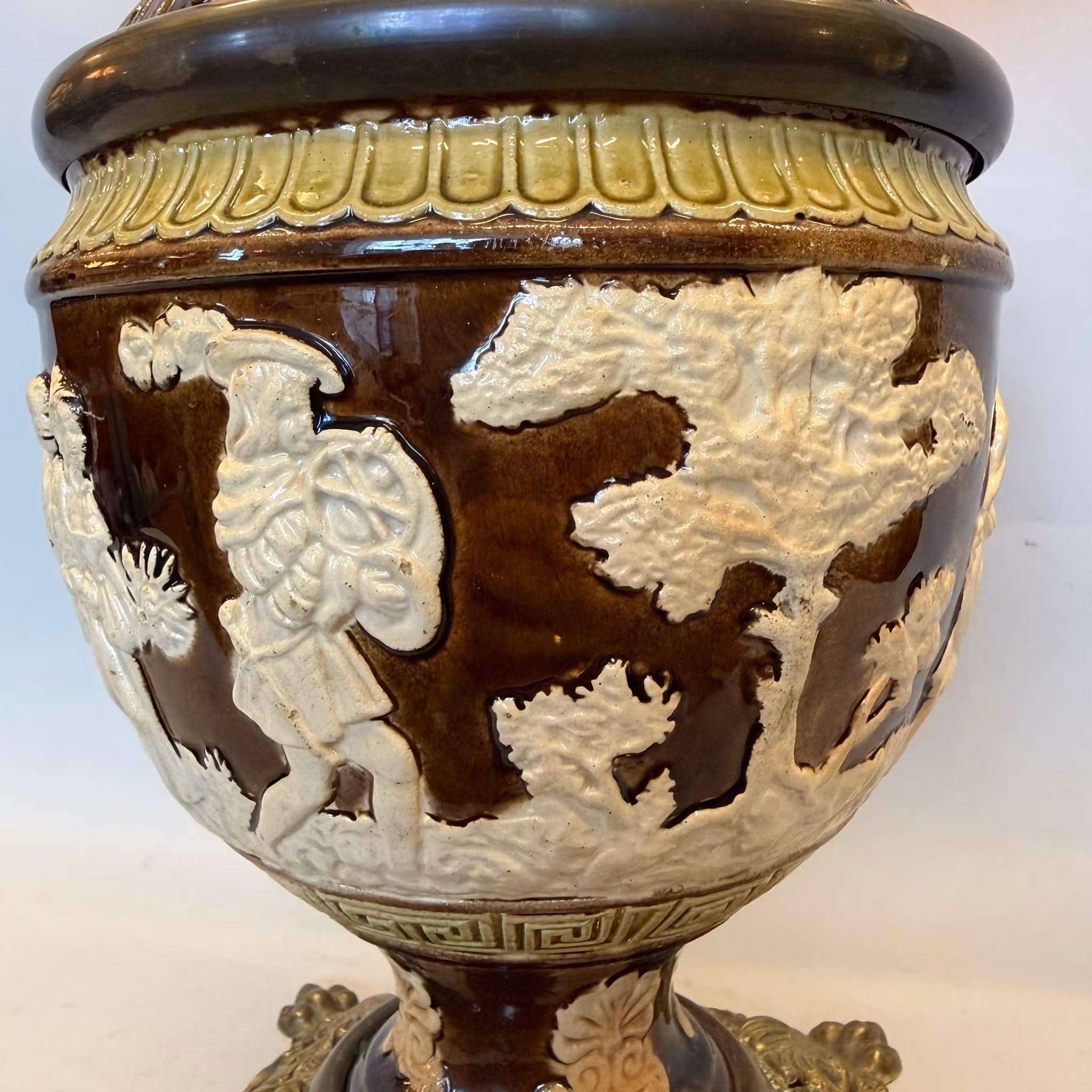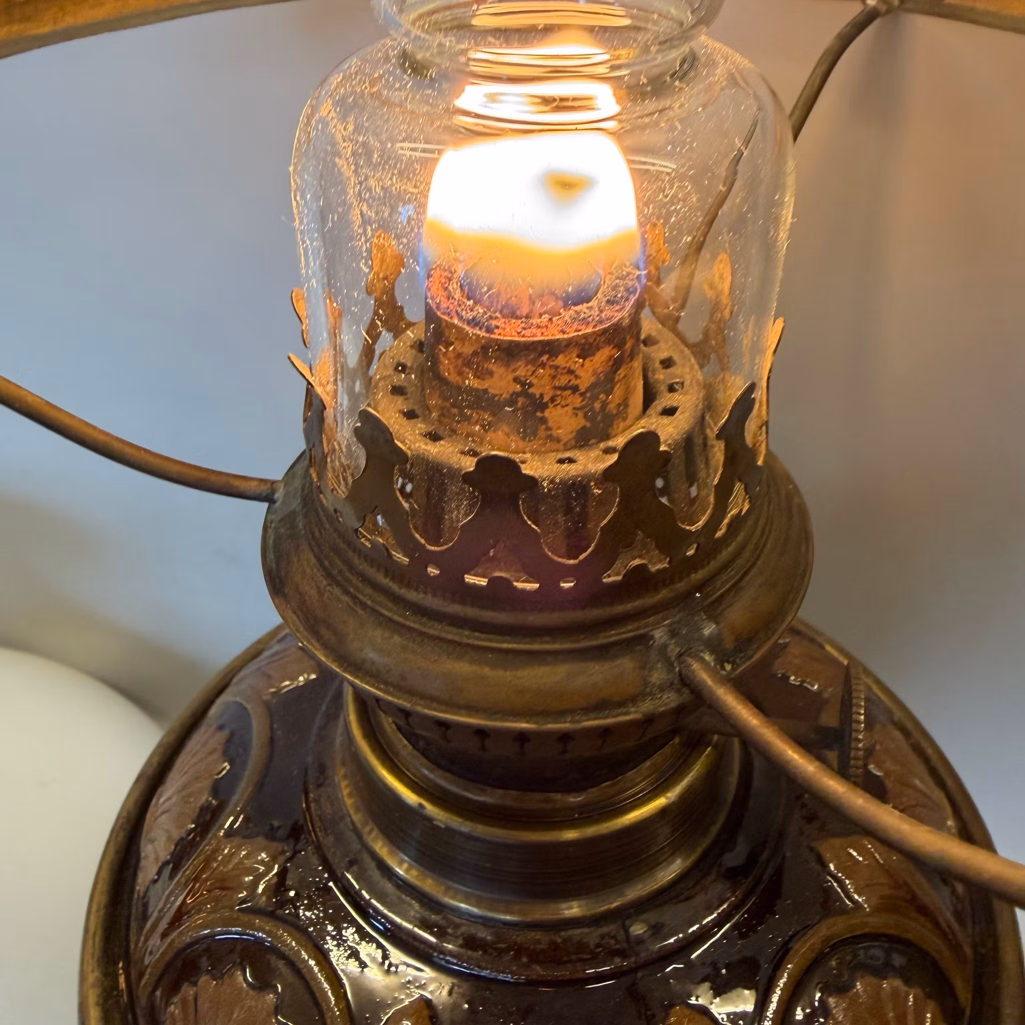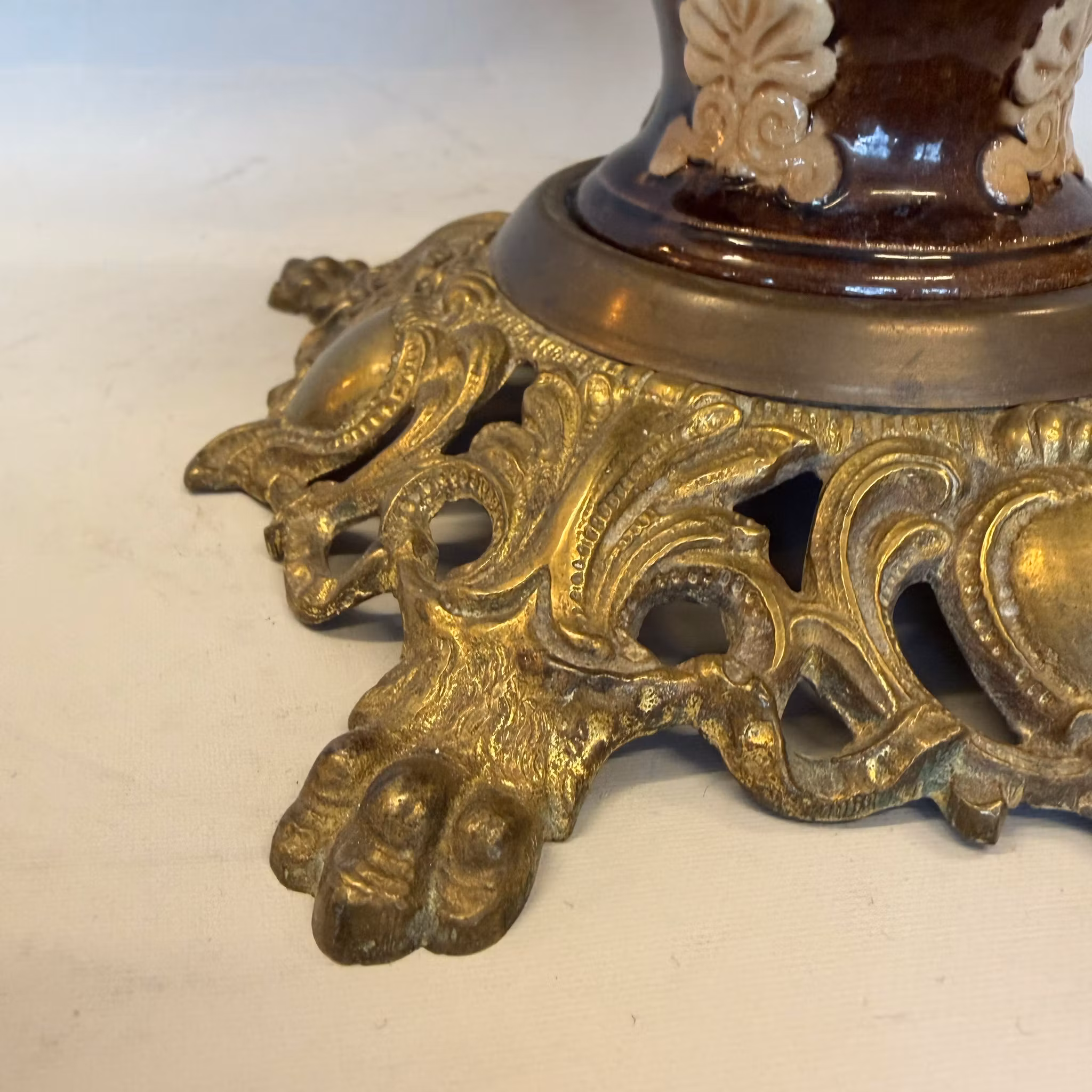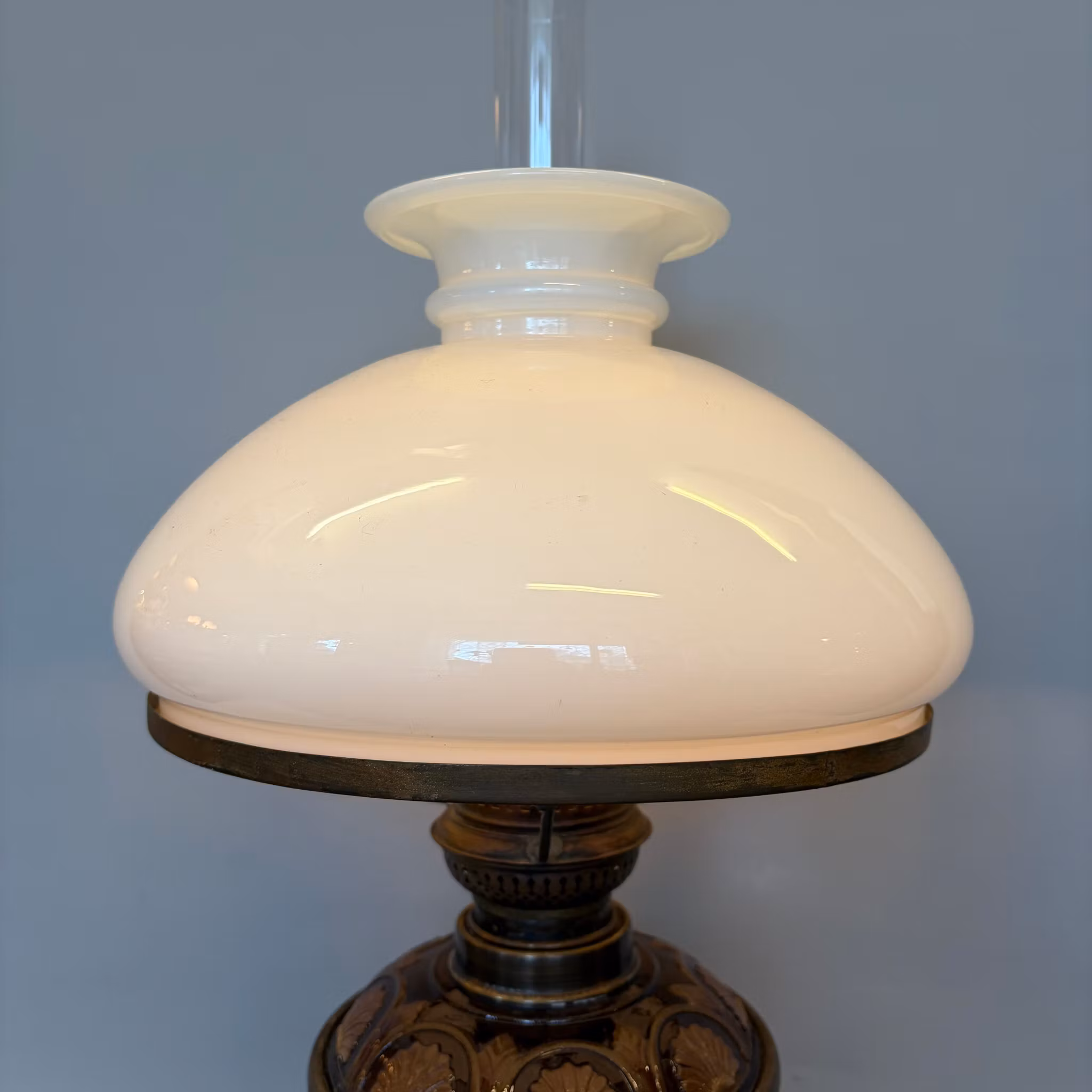 En unik antik fotogenlampa med majolikafot i brunt och antiksvitt med meandermönster samt en antik 235 mm vestaskärm med vikt krage.
