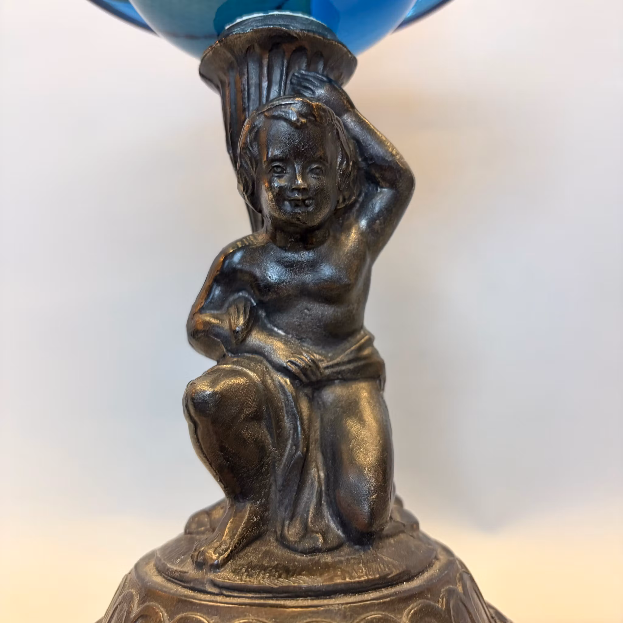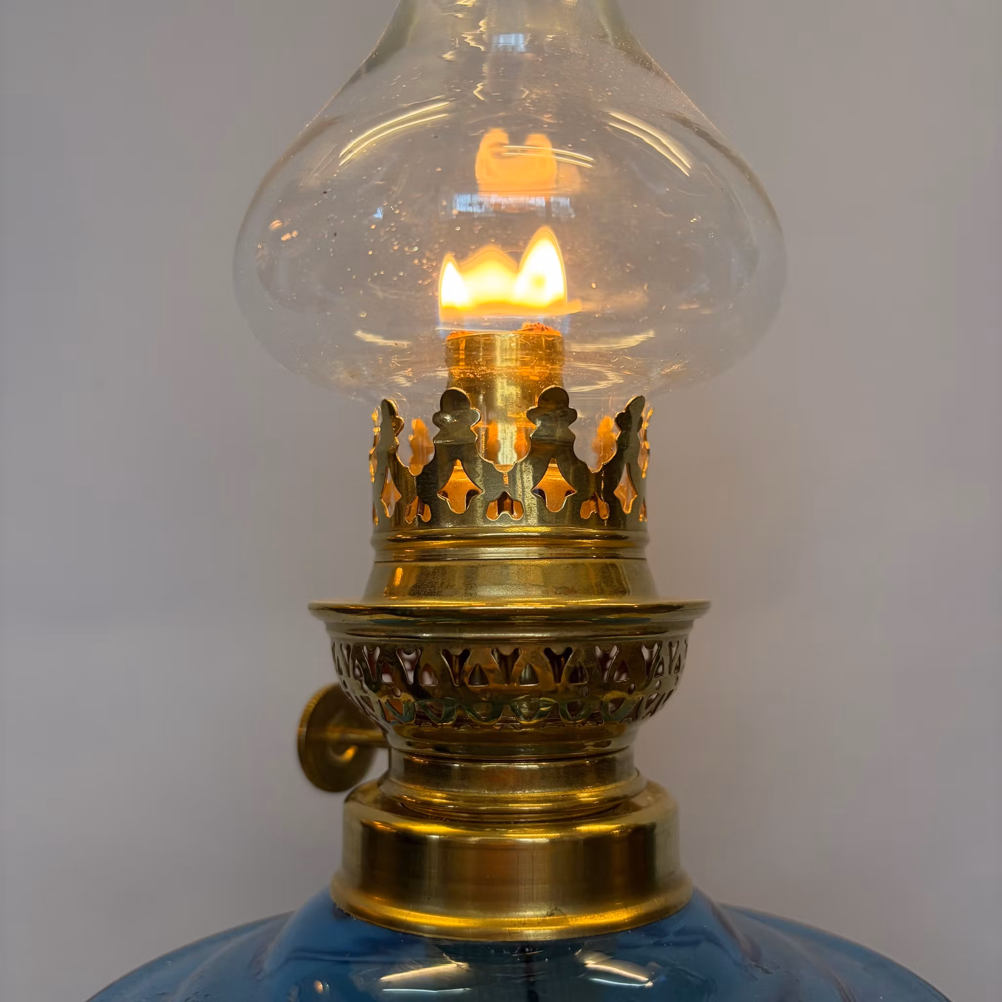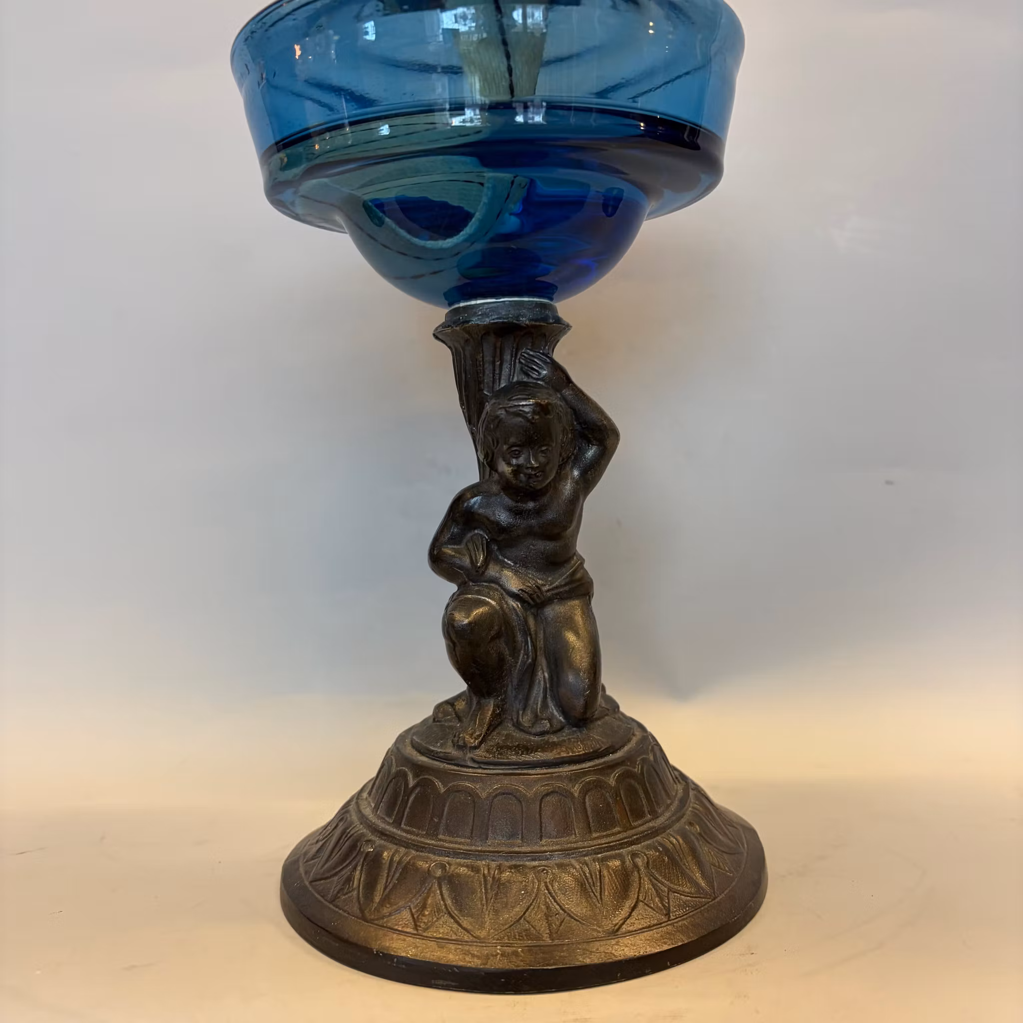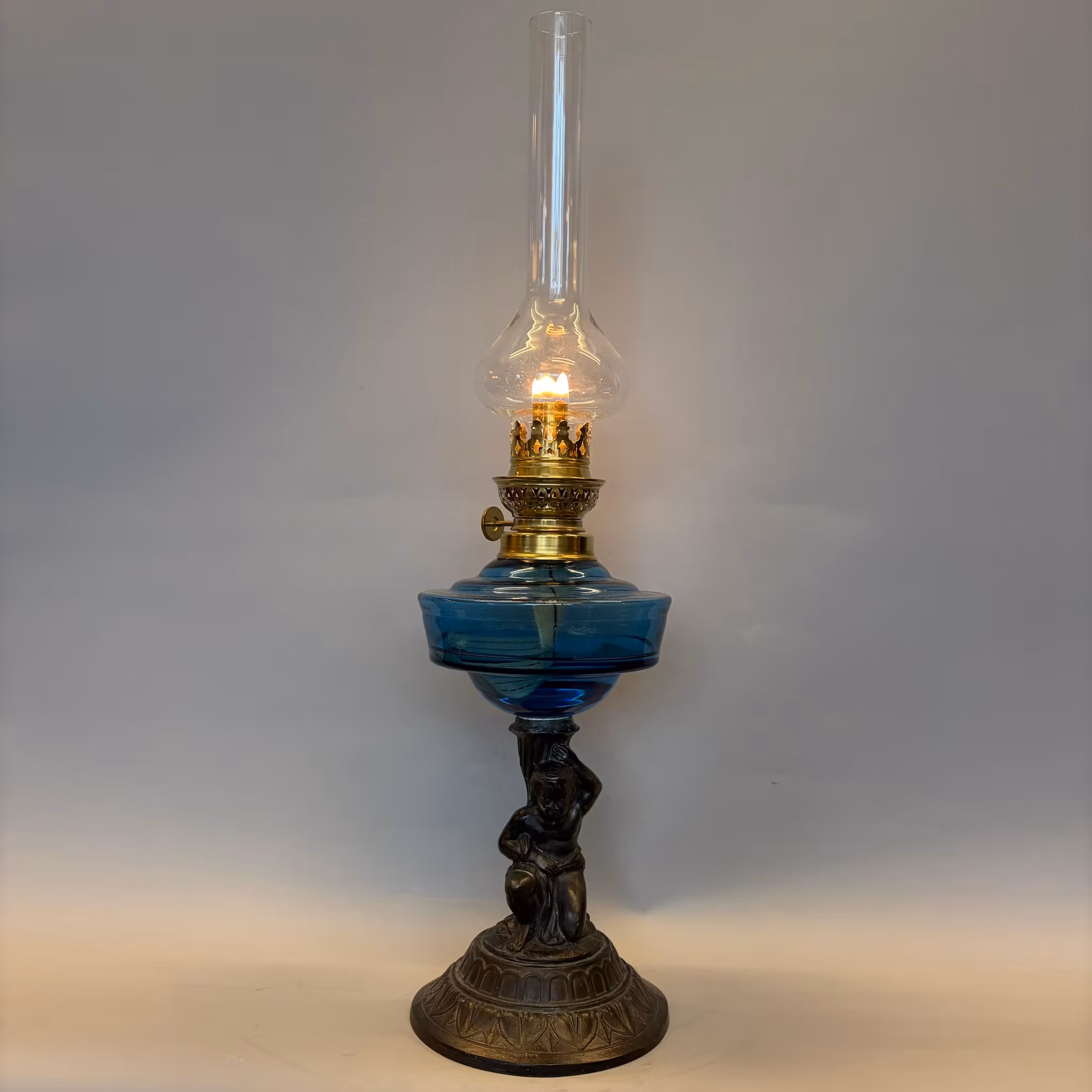 En klassisk bordsfotogenlampa med äldre oljehus i blått glas och nyare lampfot i zinkgjutgods.
