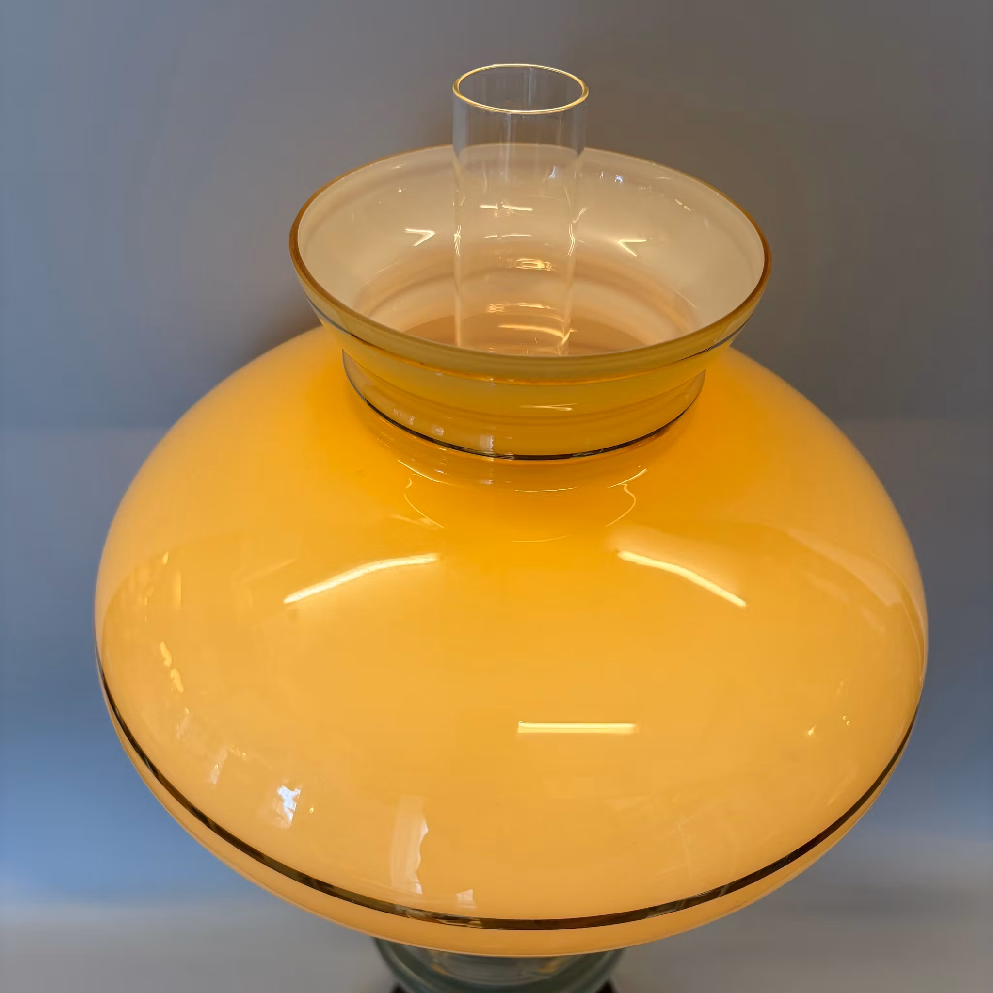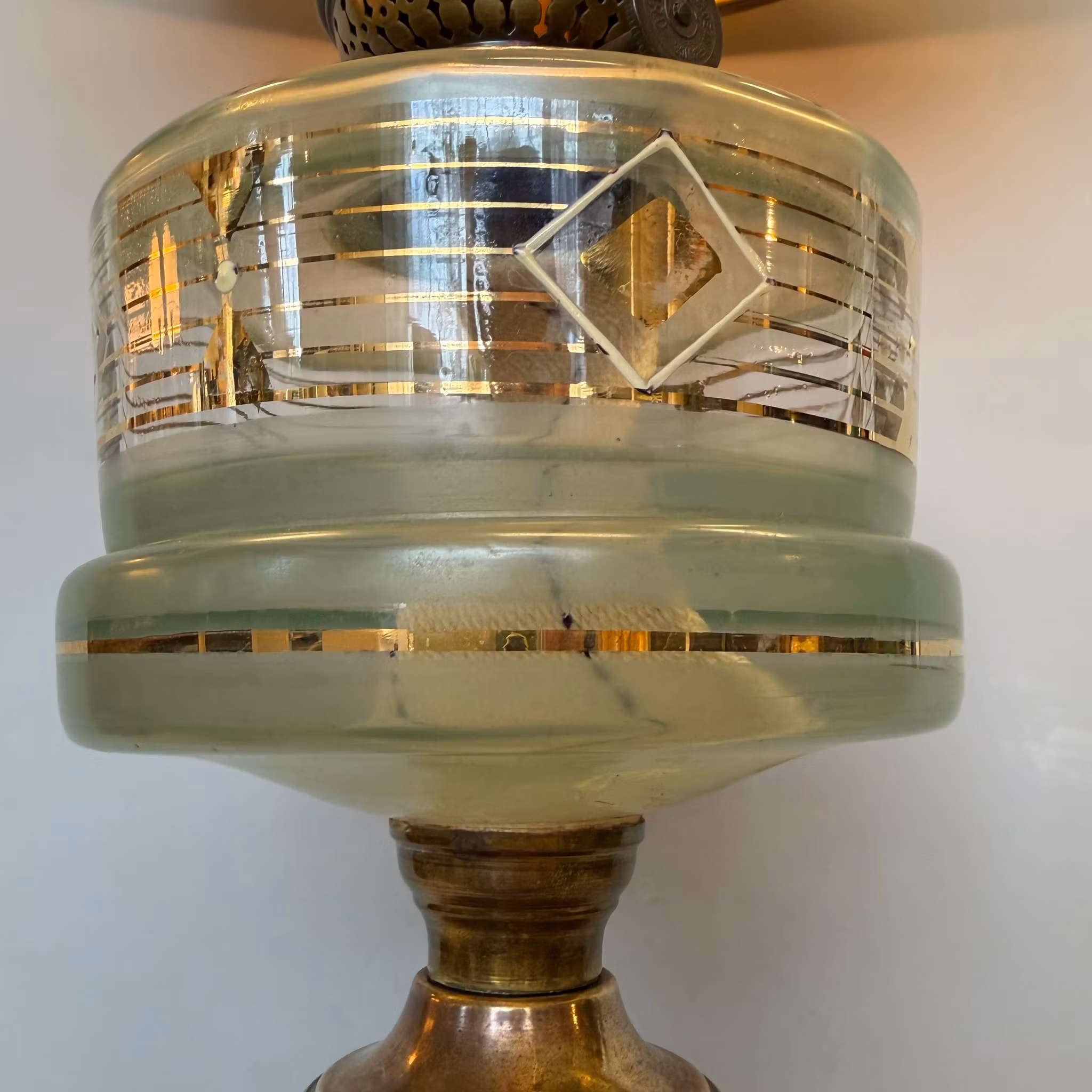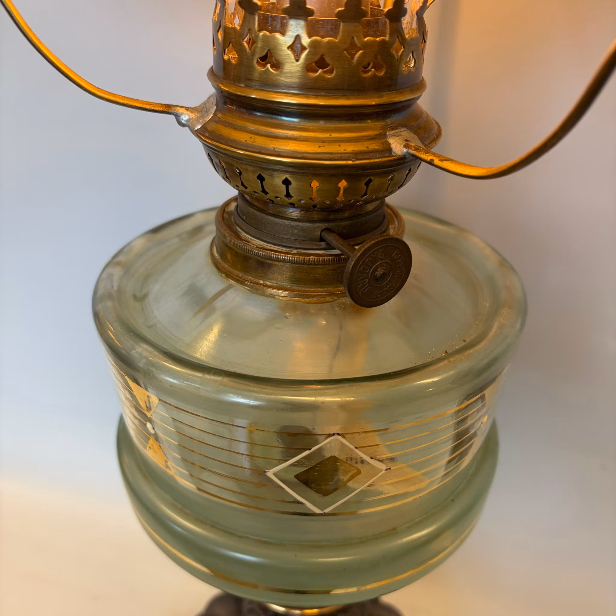 En antik fotogenlampa med målat glasoljehus och en snygg fot i barockstil i zinkgjutgods, samt en mässingsbrännare och skärmring. Vestaskärmen i vaniljfärgat glas med guldmålade detaljer, precis som på oljehuset.