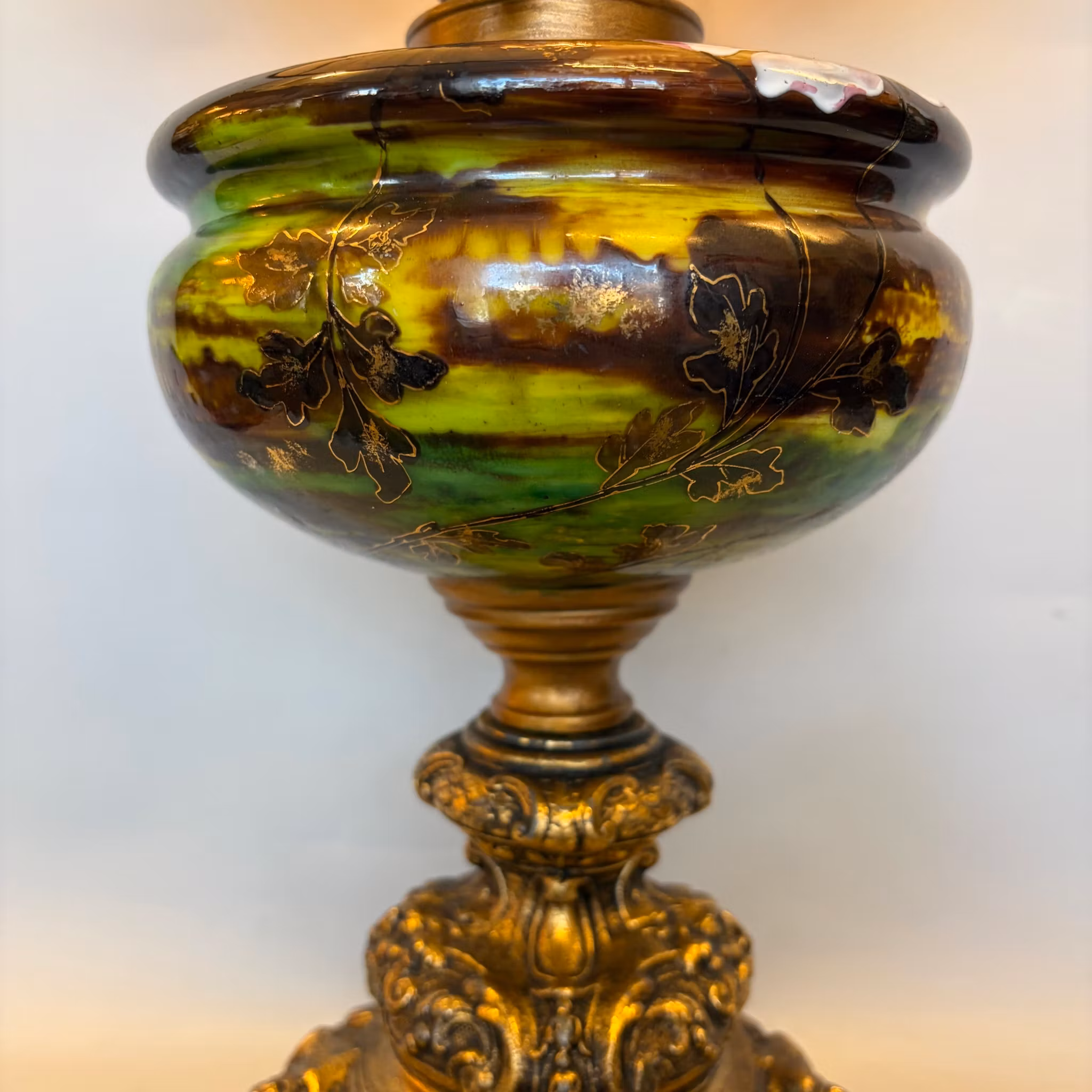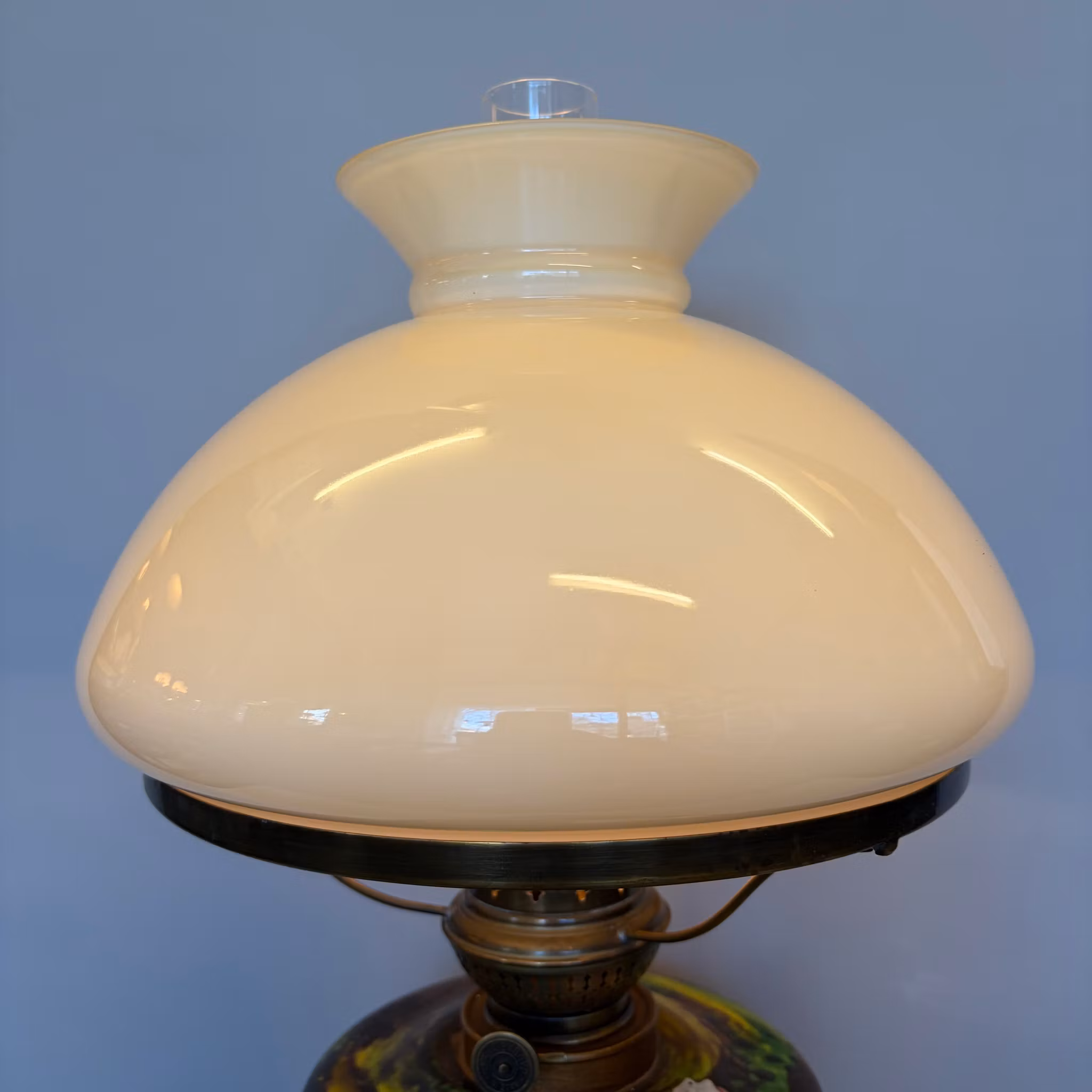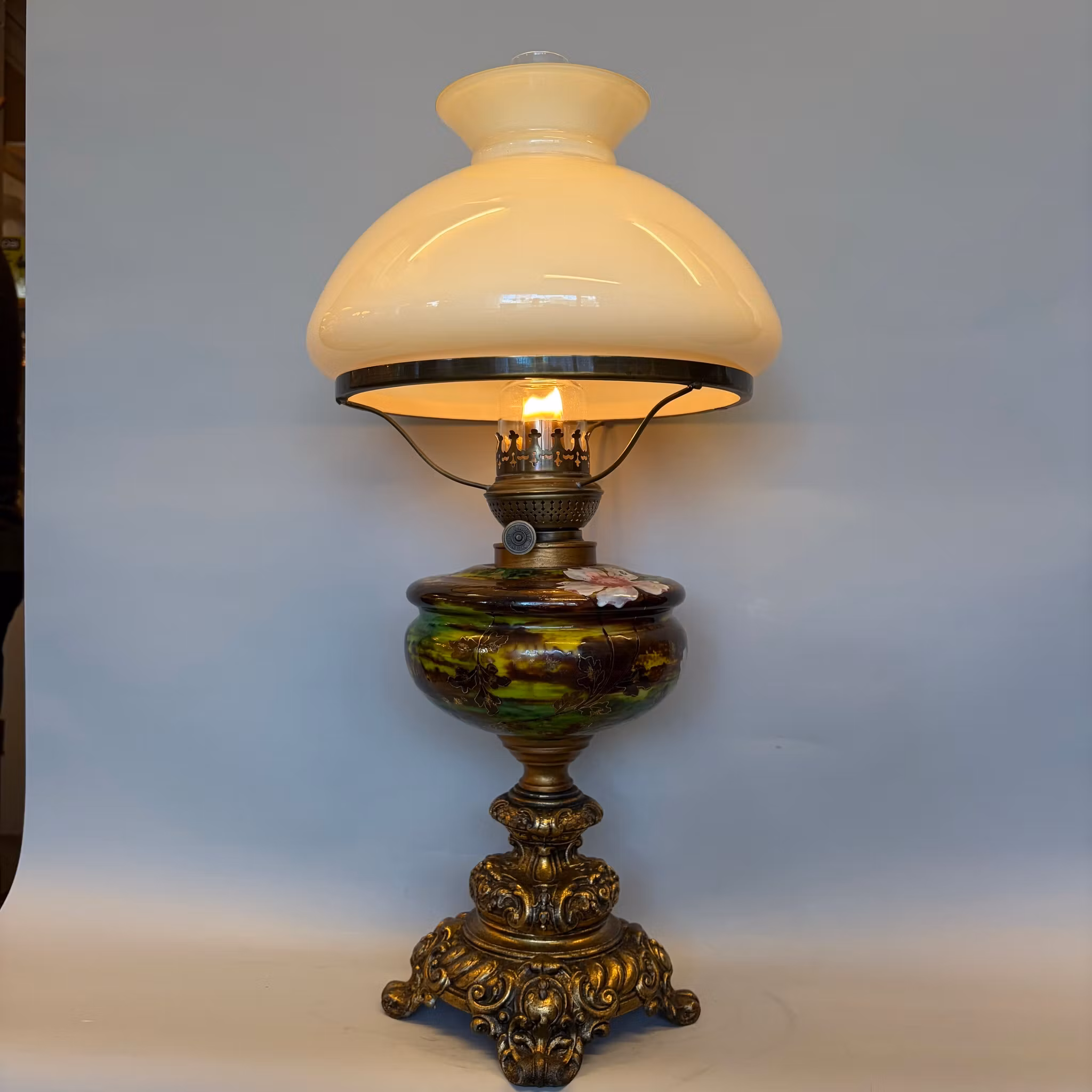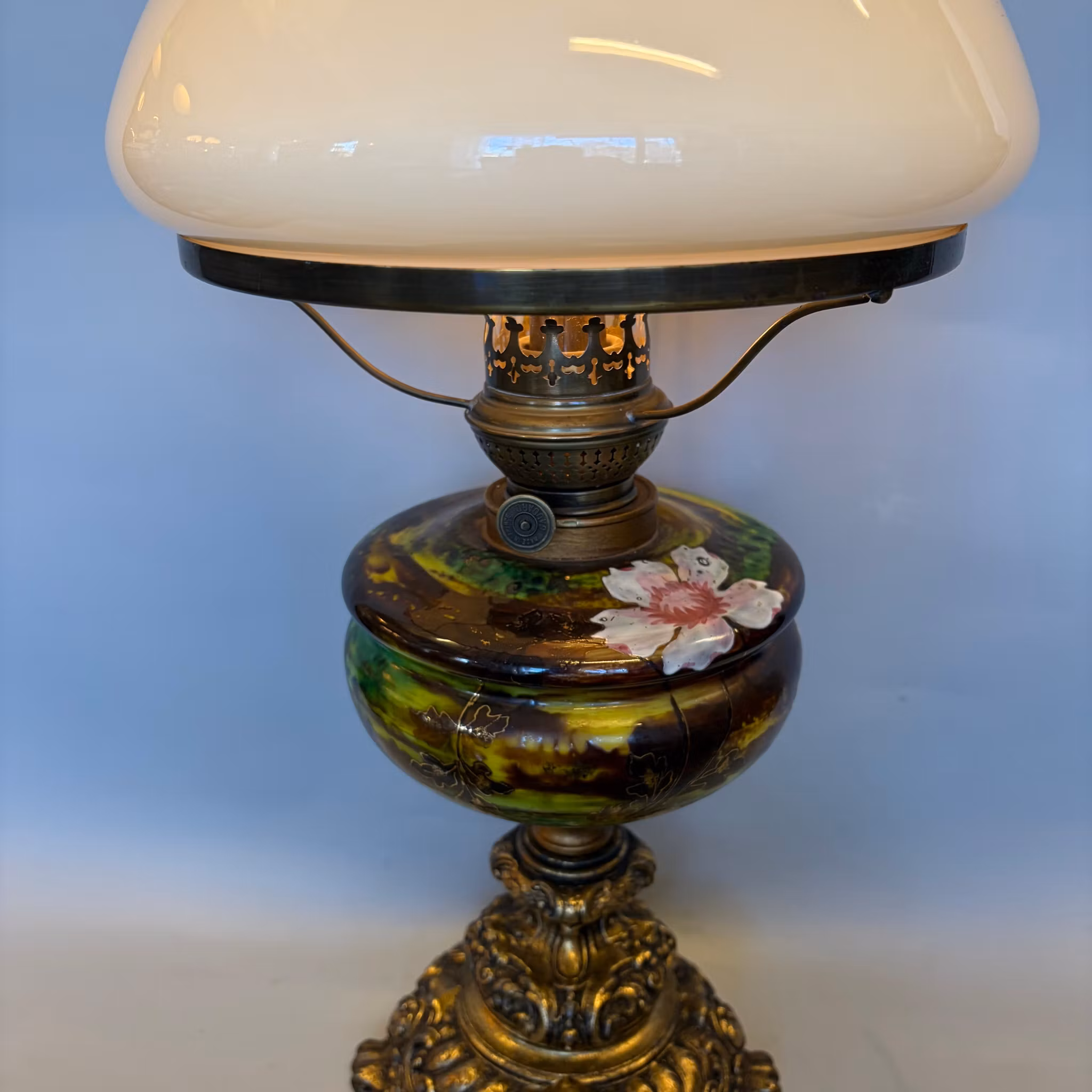 En äldre annorlunda fotogenlampa med målat oljehus och en snygg fot i barockstil samt en mässingsbrännare och skärmring. Vestaskärmen i vaniljfärgat glas.