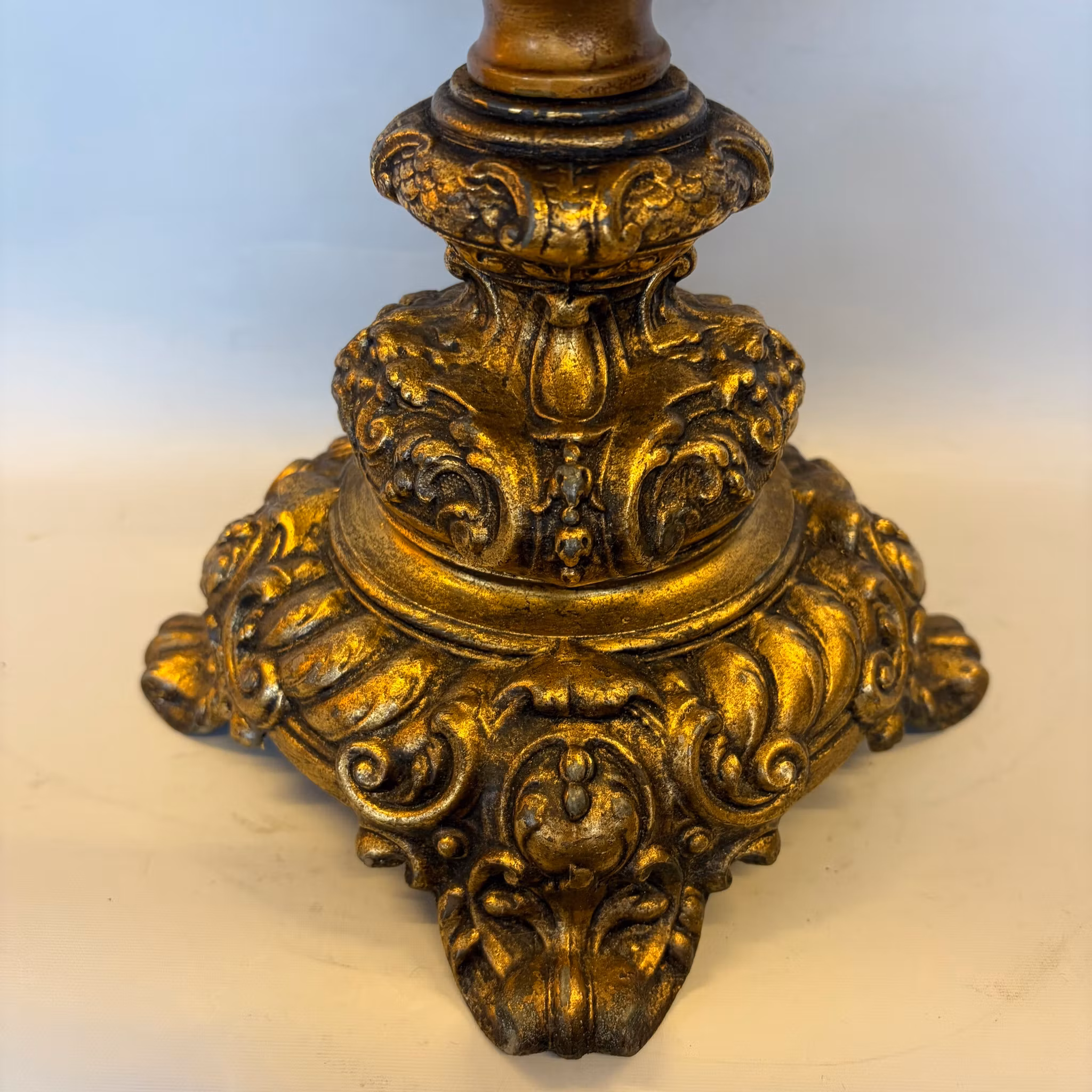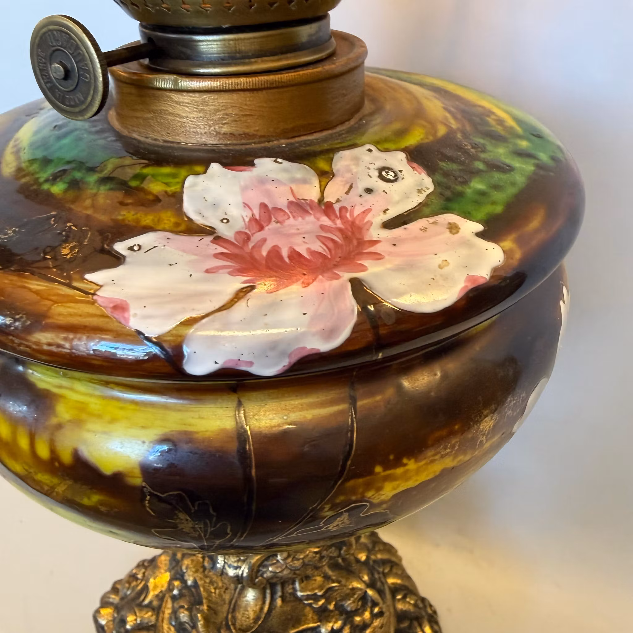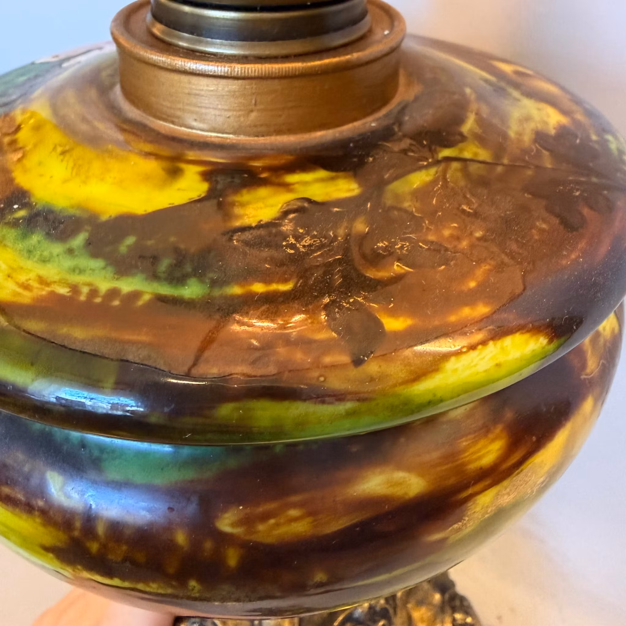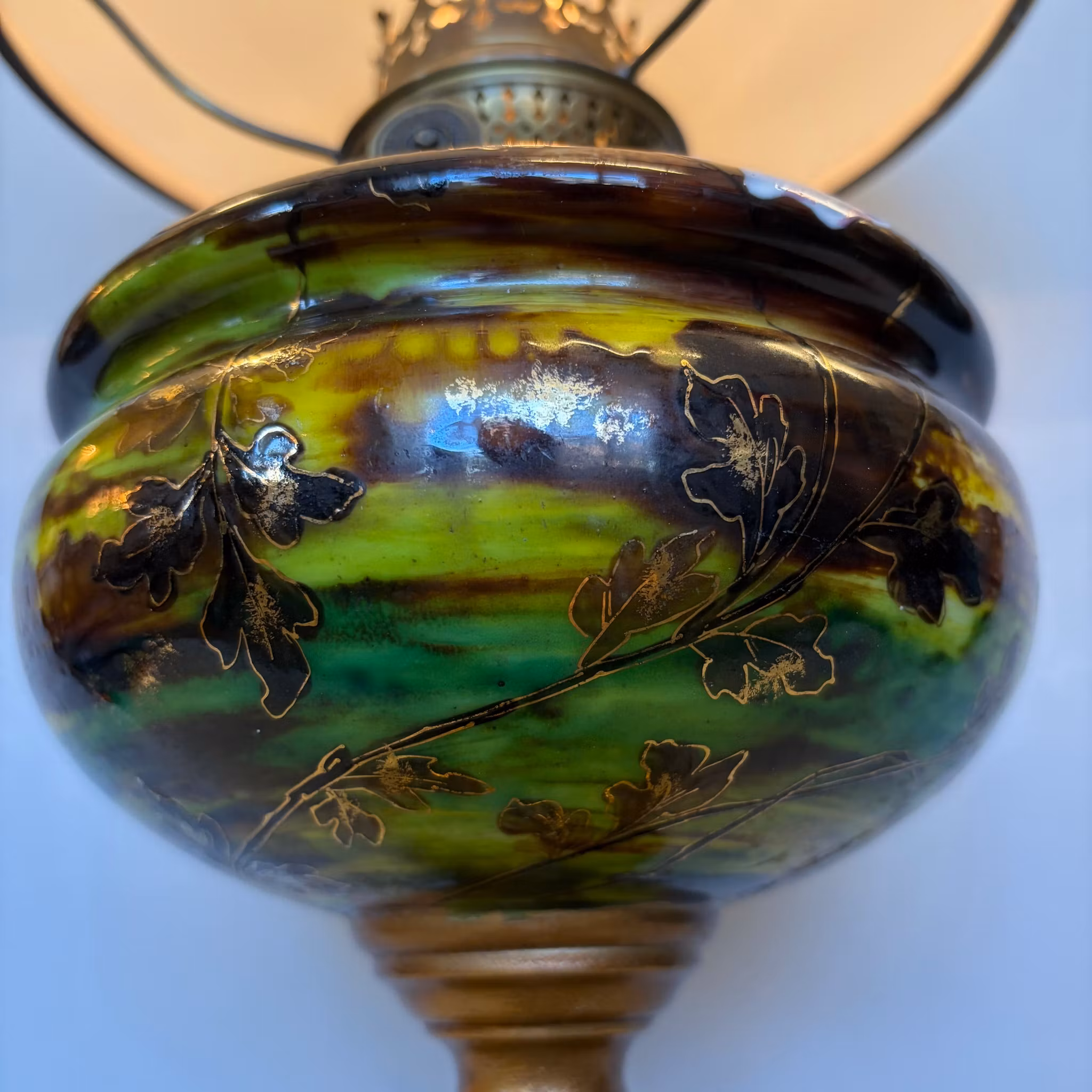 En äldre annorlunda fotogenlampa med målat oljehus och en snygg fot i barockstil samt en mässingsbrännare och skärmring. Vestaskärmen i vaniljfärgat glas.