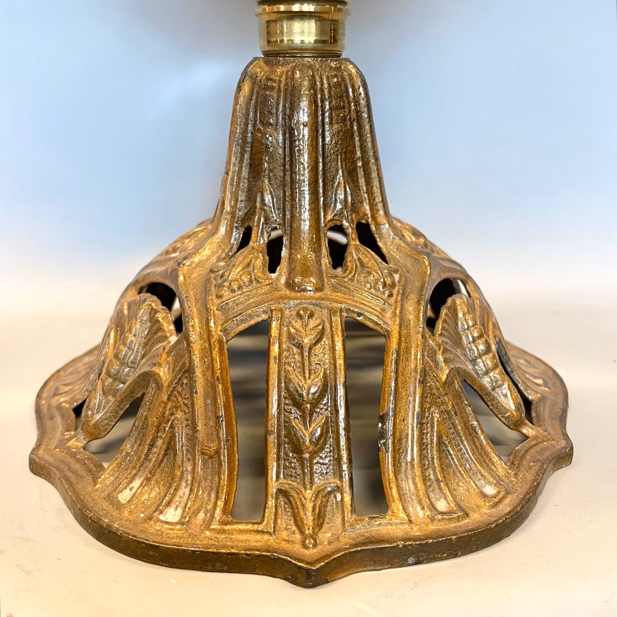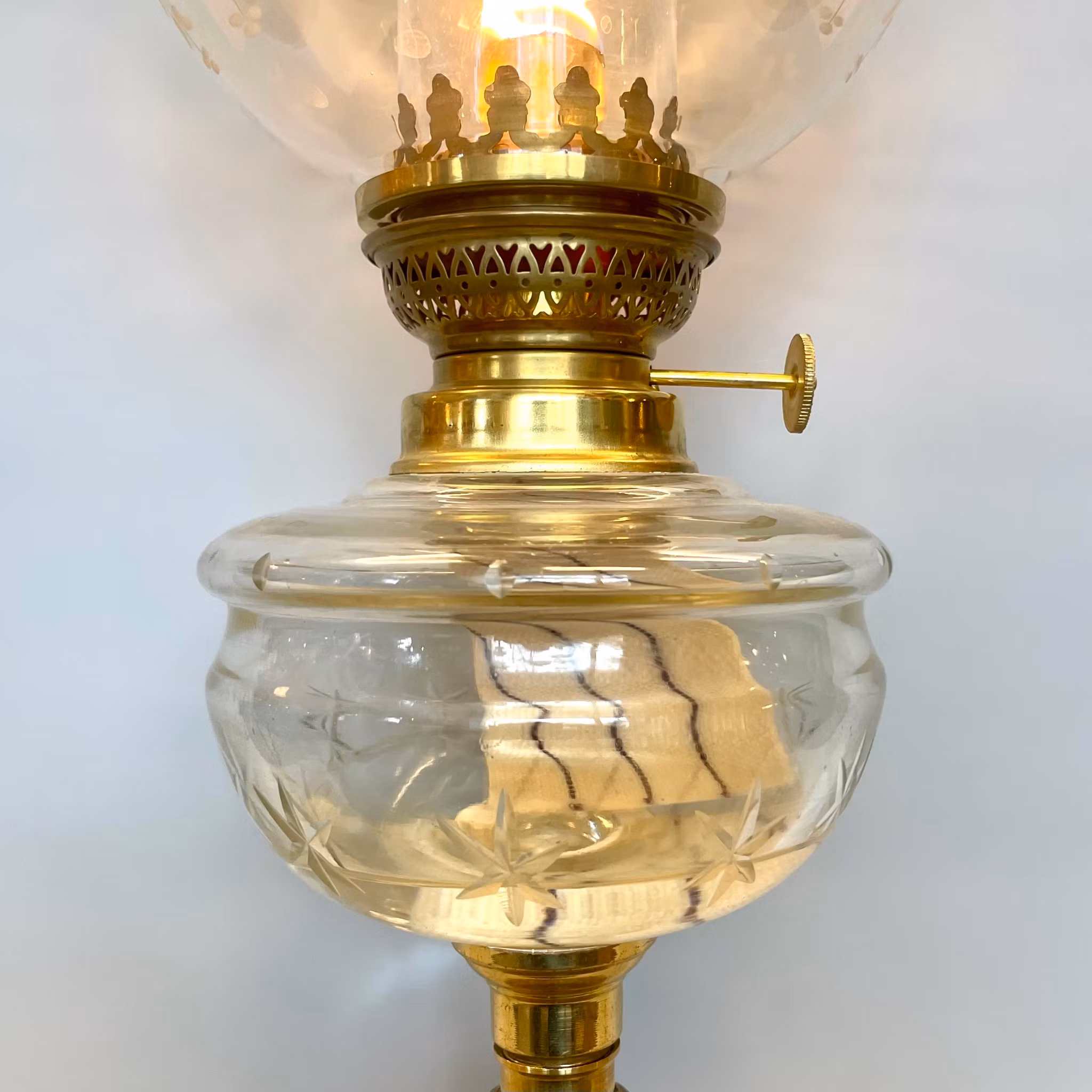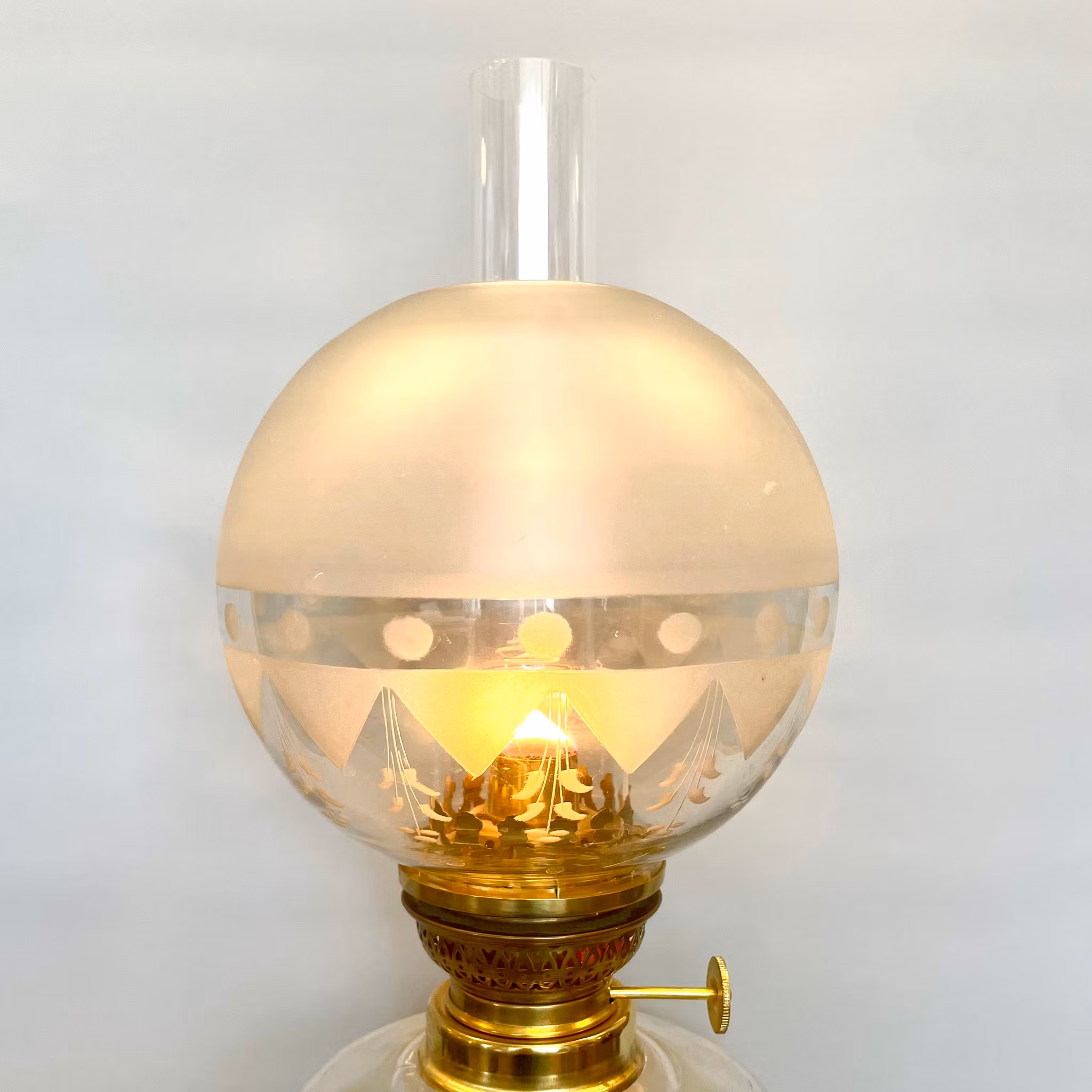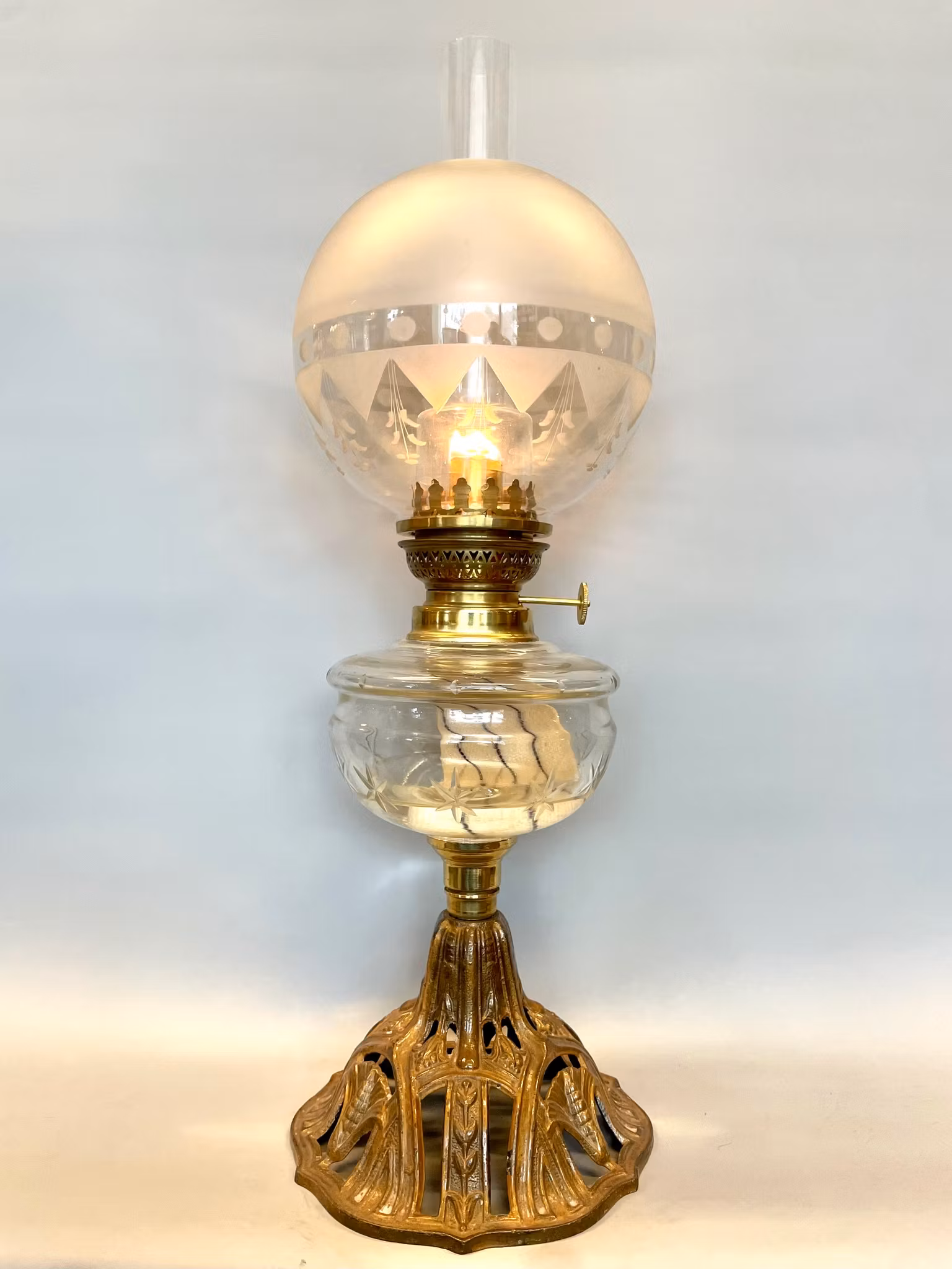 En antik fotogenlampa med snyggt slipat glasoljehus och rejäl bronserad järnfot samt en snyggt mönstrad antik klotkupa.