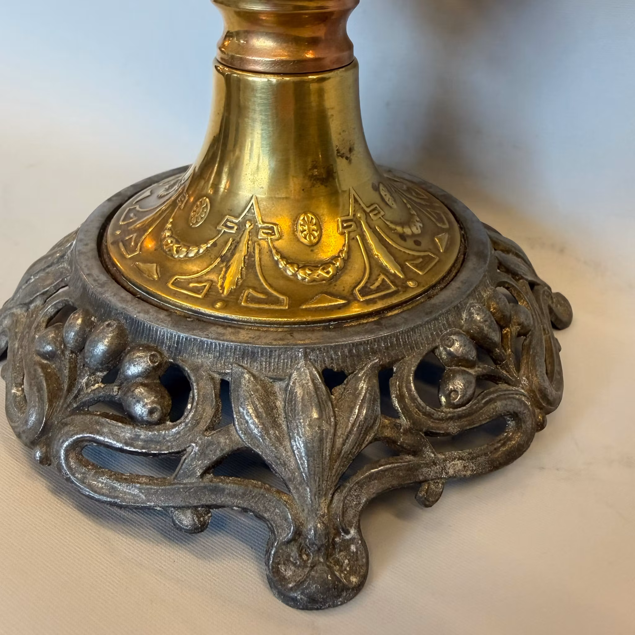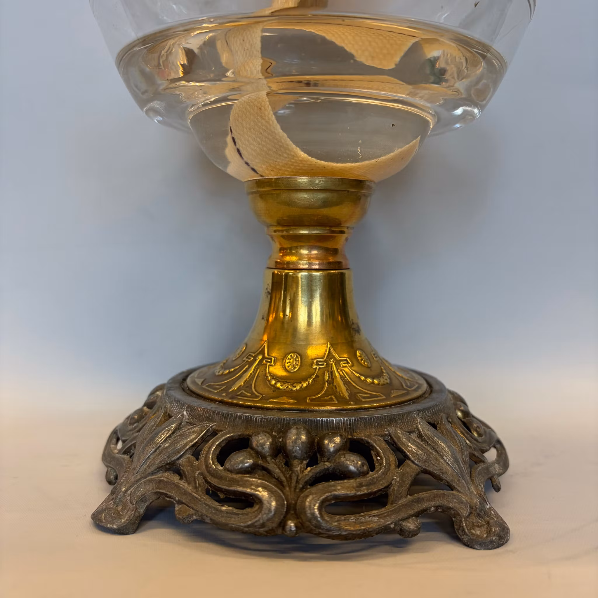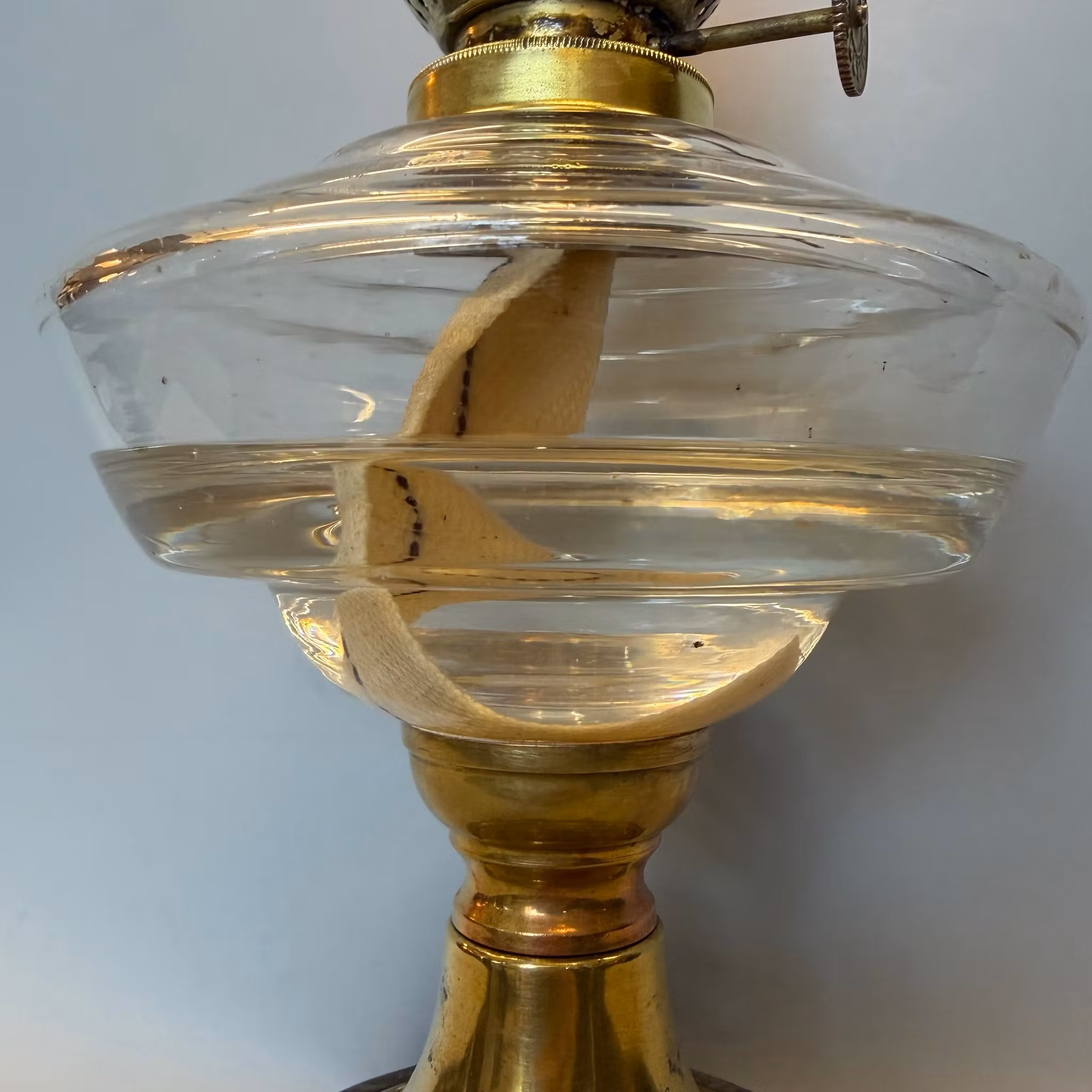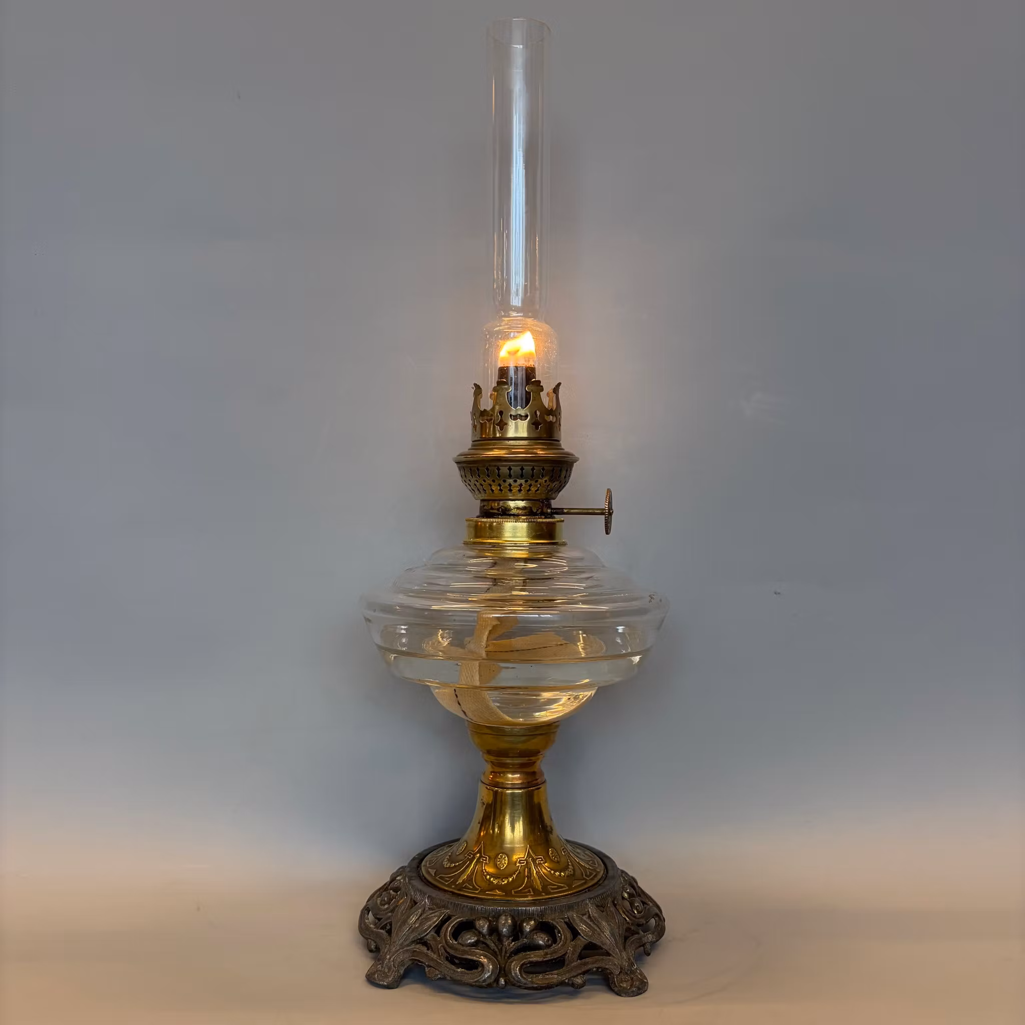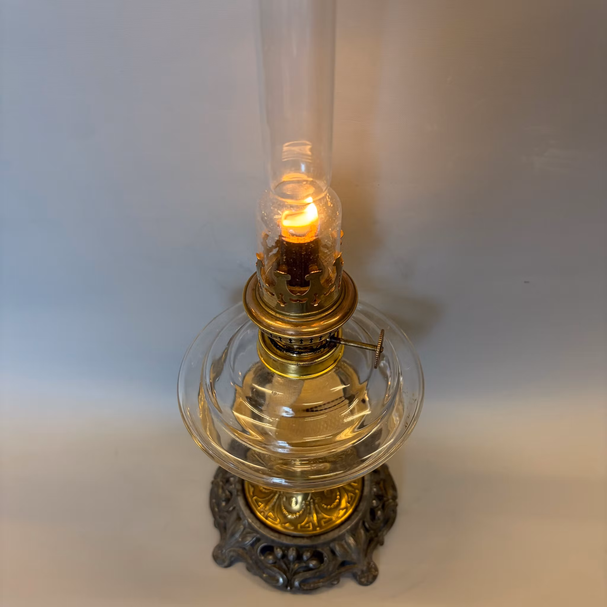 En klassisk mindre bordsfotogenlampa med äldre oljehus i glas och lampfot i zink och mässing.