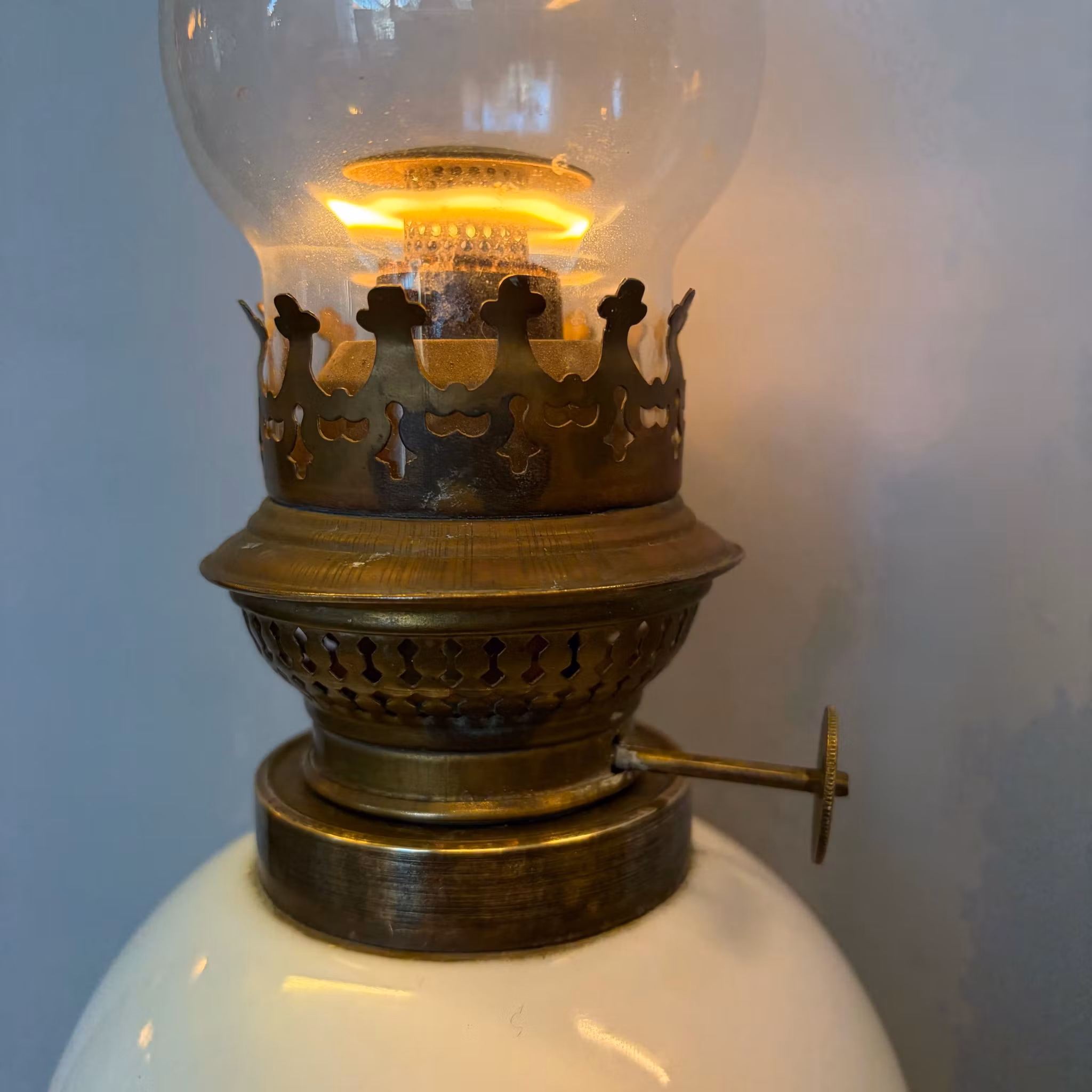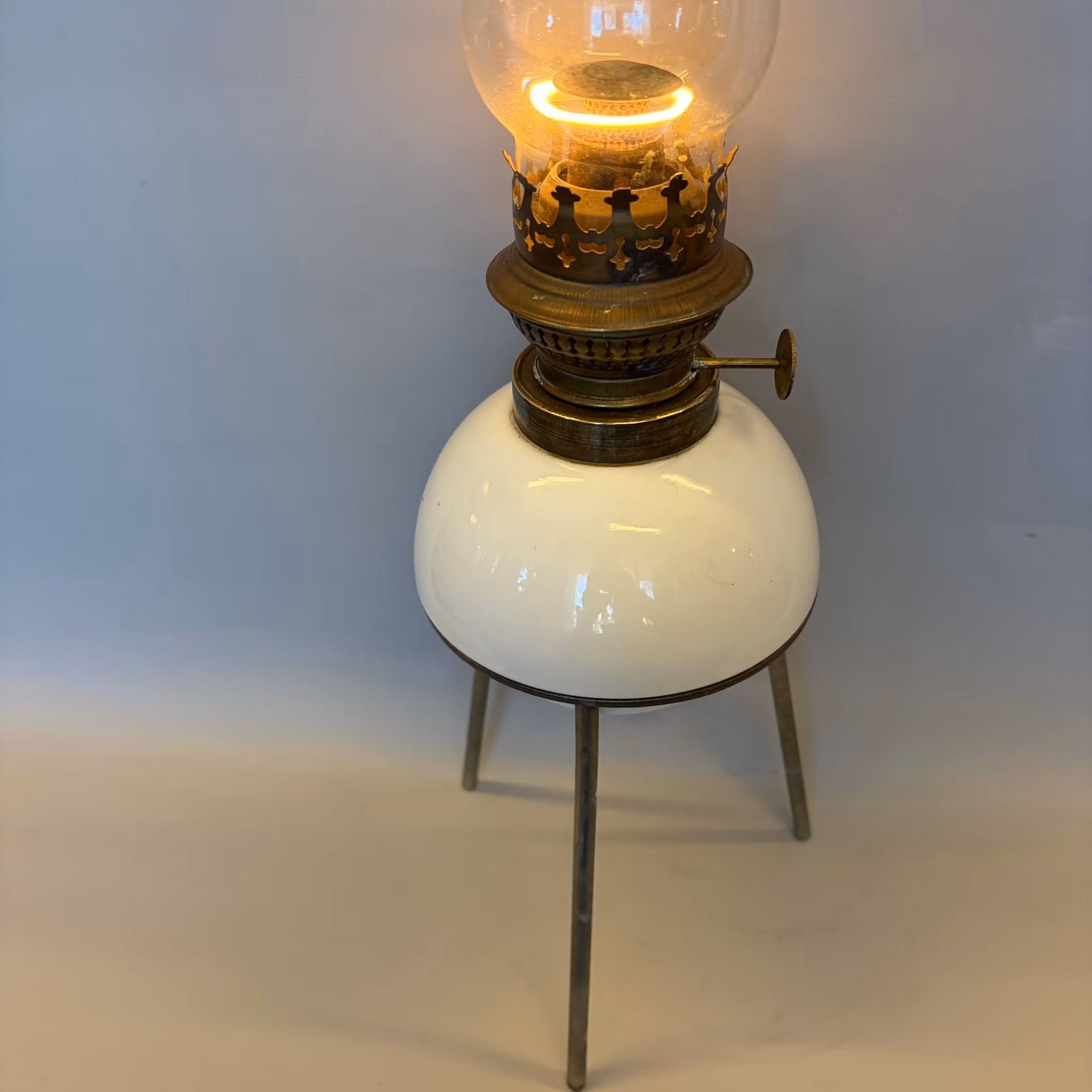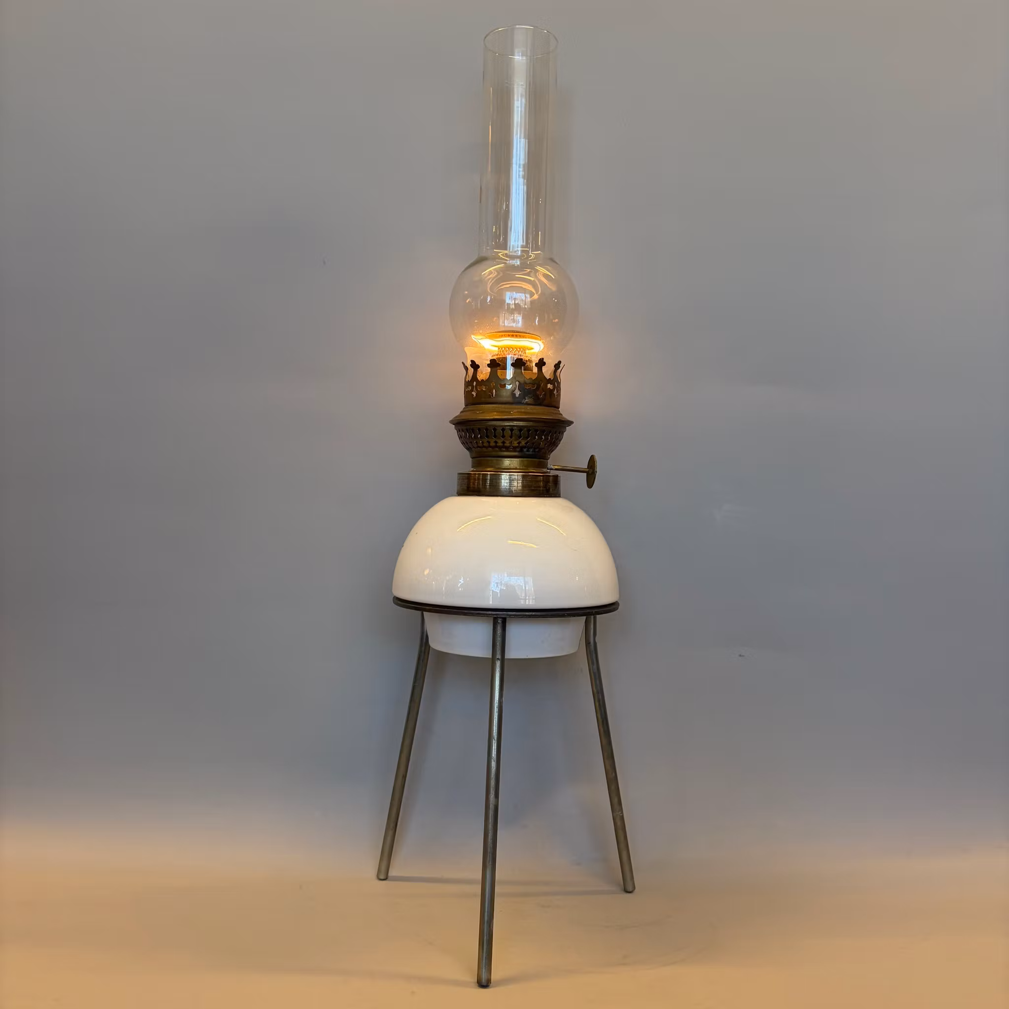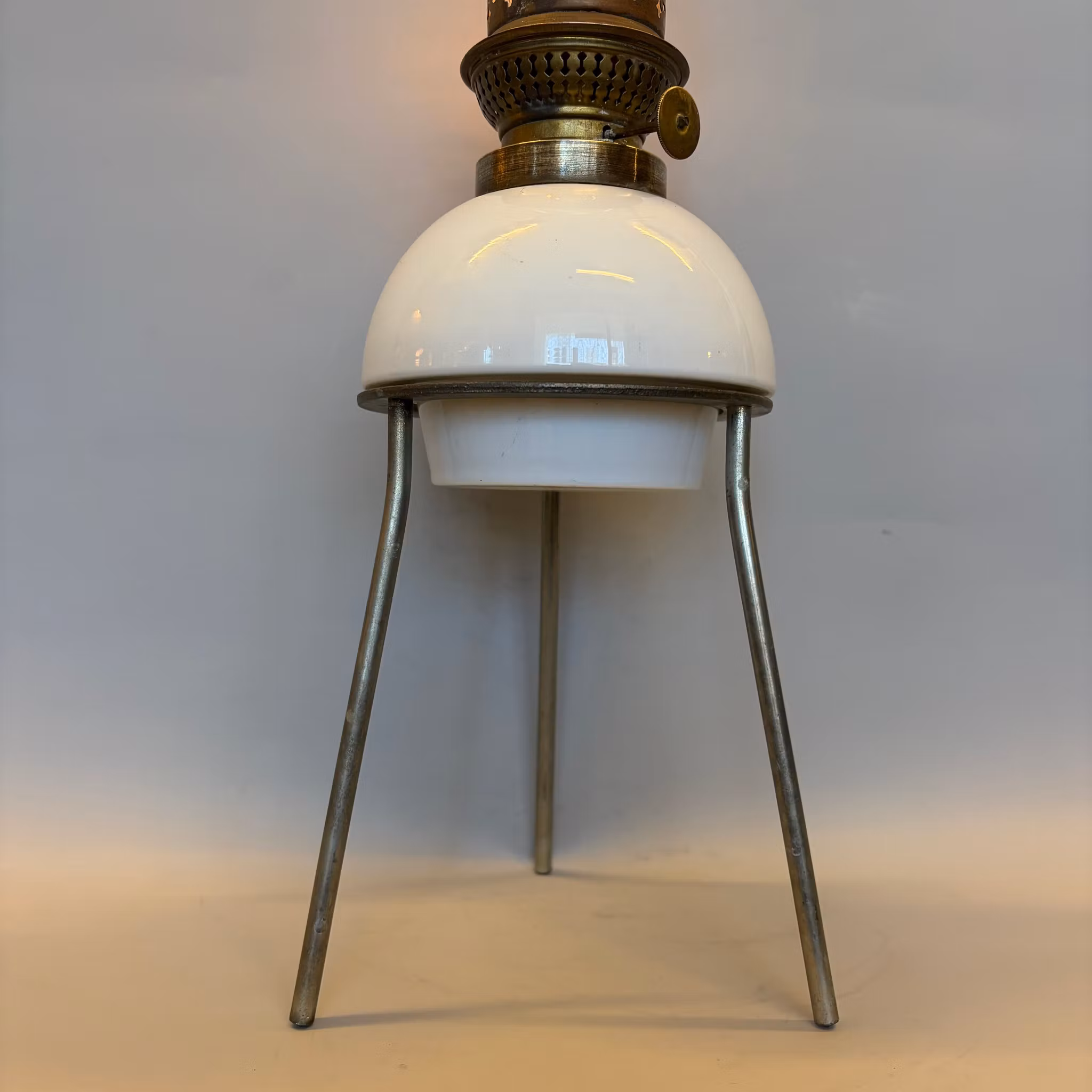 Det här är en äldre annorlunda fotogenlampa med opalvitt oljehus som står i ett trebent stativ.