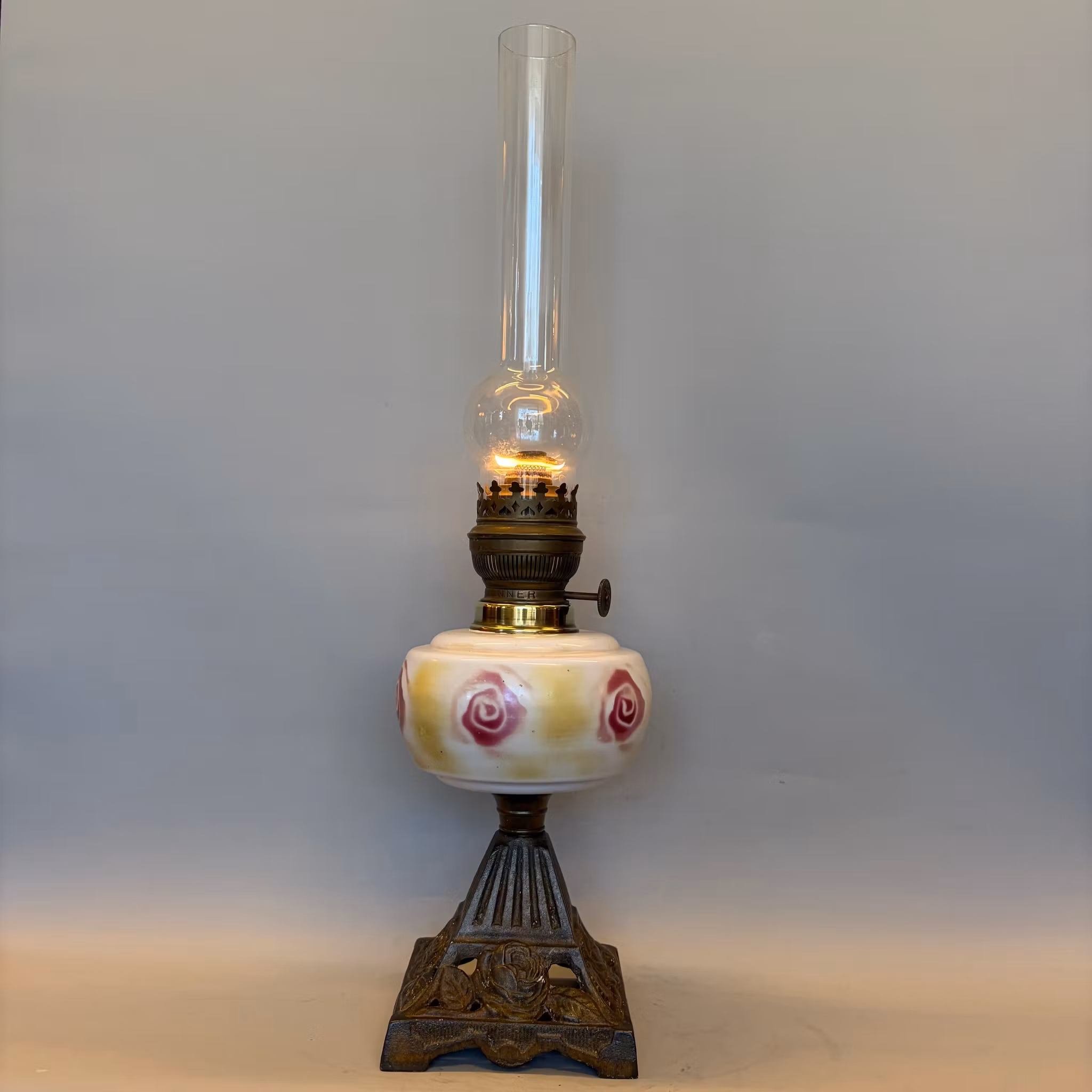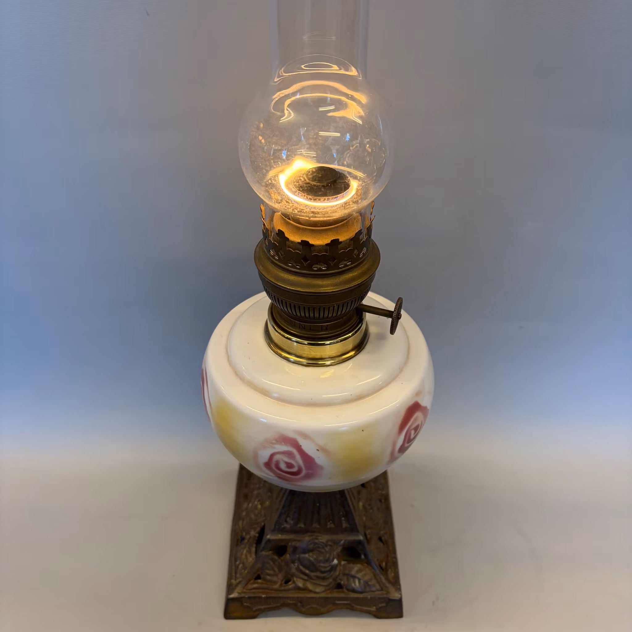 En klassisk bordsfotogenlampa med äldre oljehus i opalvitt glas dekorerat med rosor och även rosor på lampfoten.