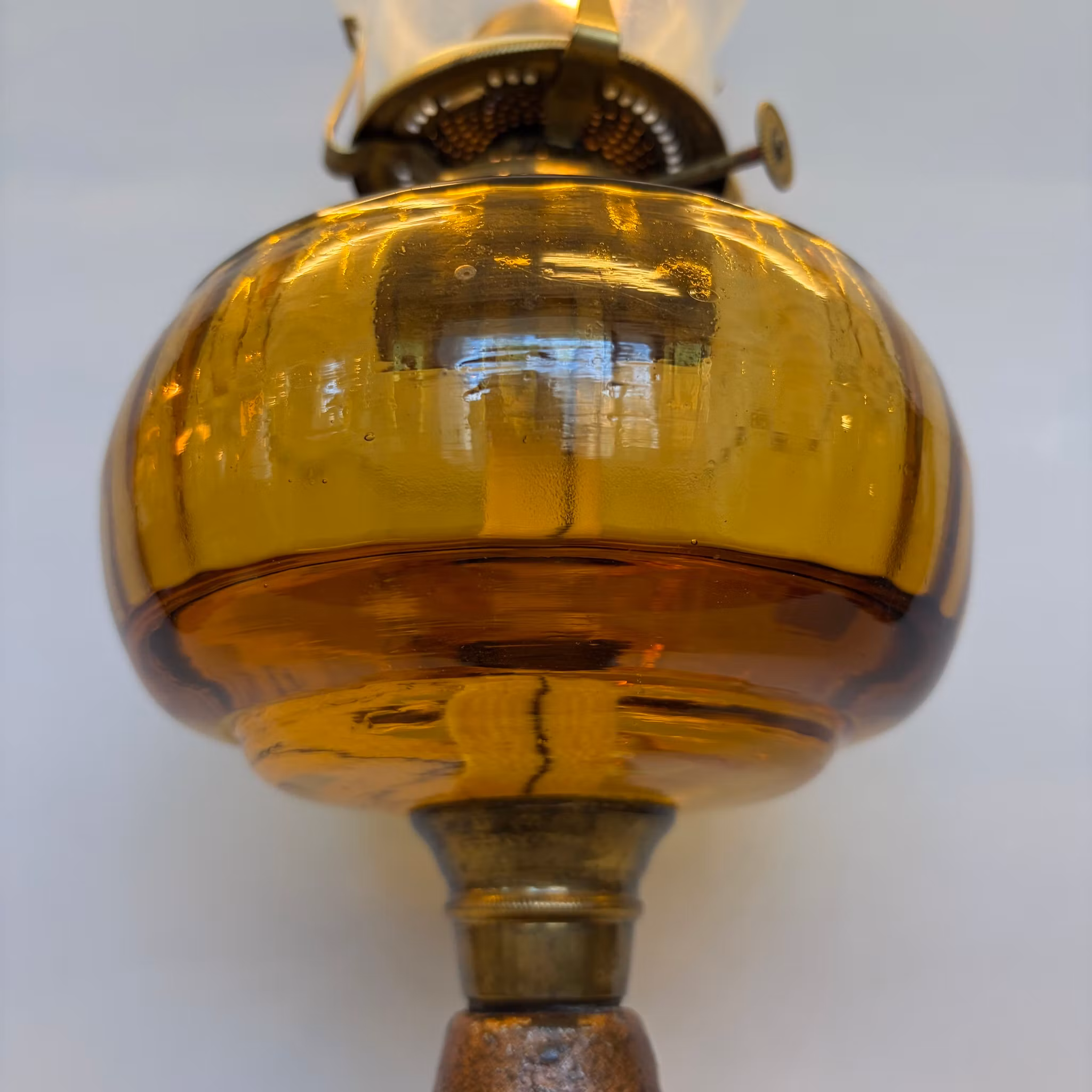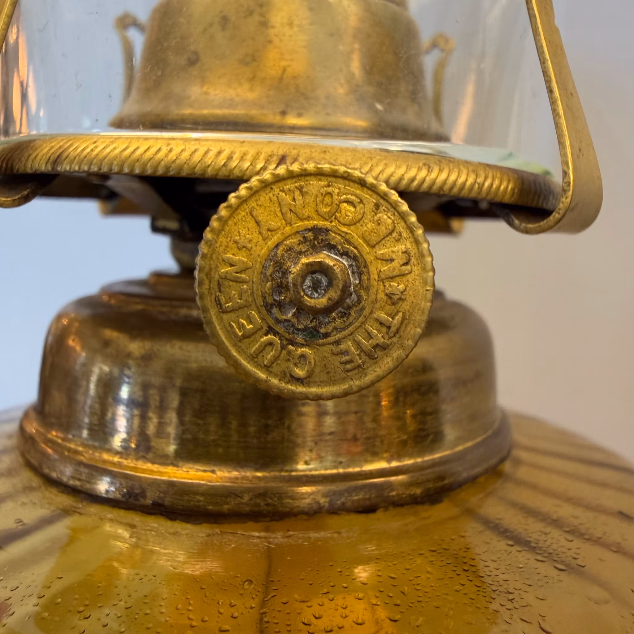 En klassisk brittisk fotogenlampa med lotusbrännare i mässing och ett stämplat lampglas.