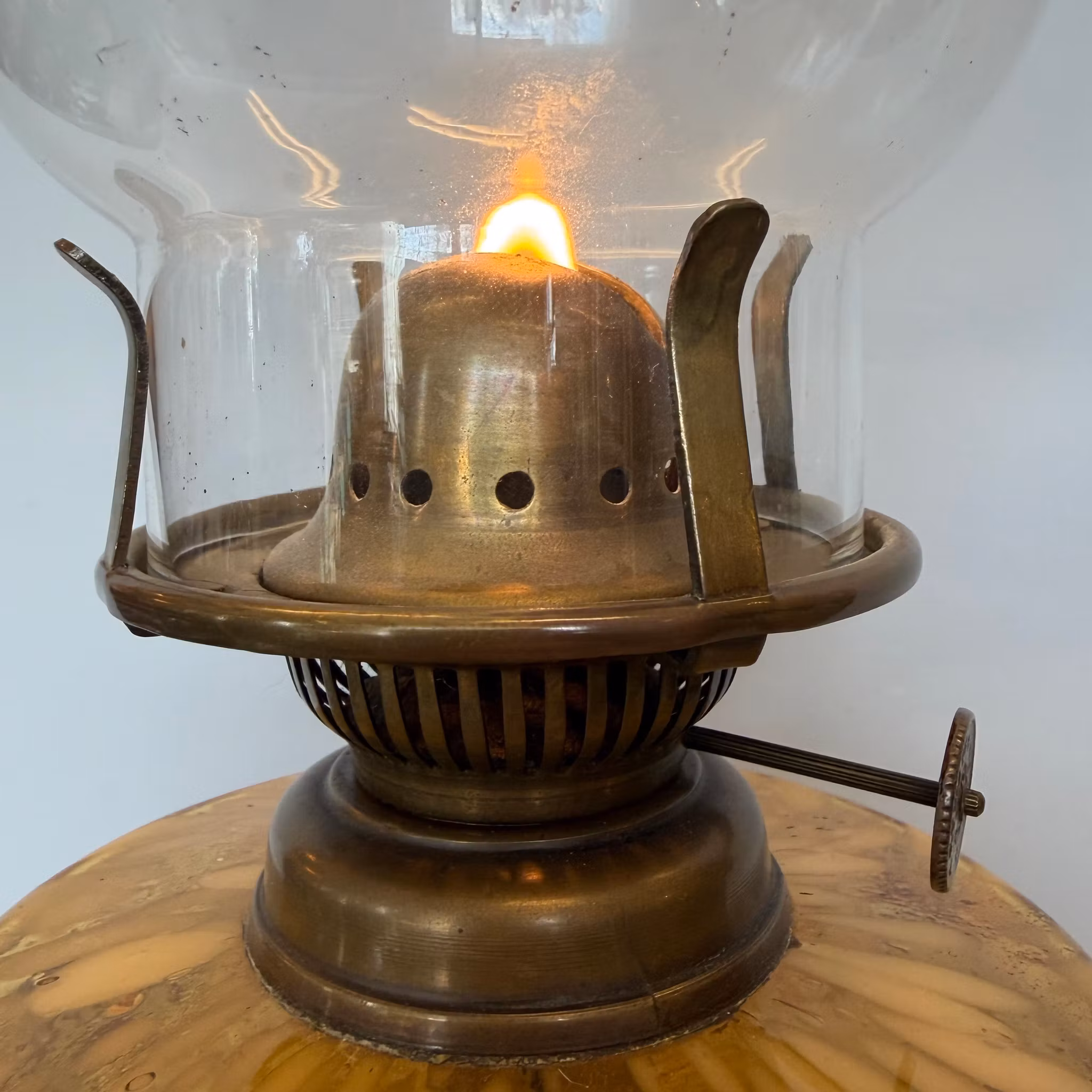 En antik brittisk fotogenlampa från Thomas Rowatt & Sons. Med lotusbrännare i mässing och stämplat antikt glas.