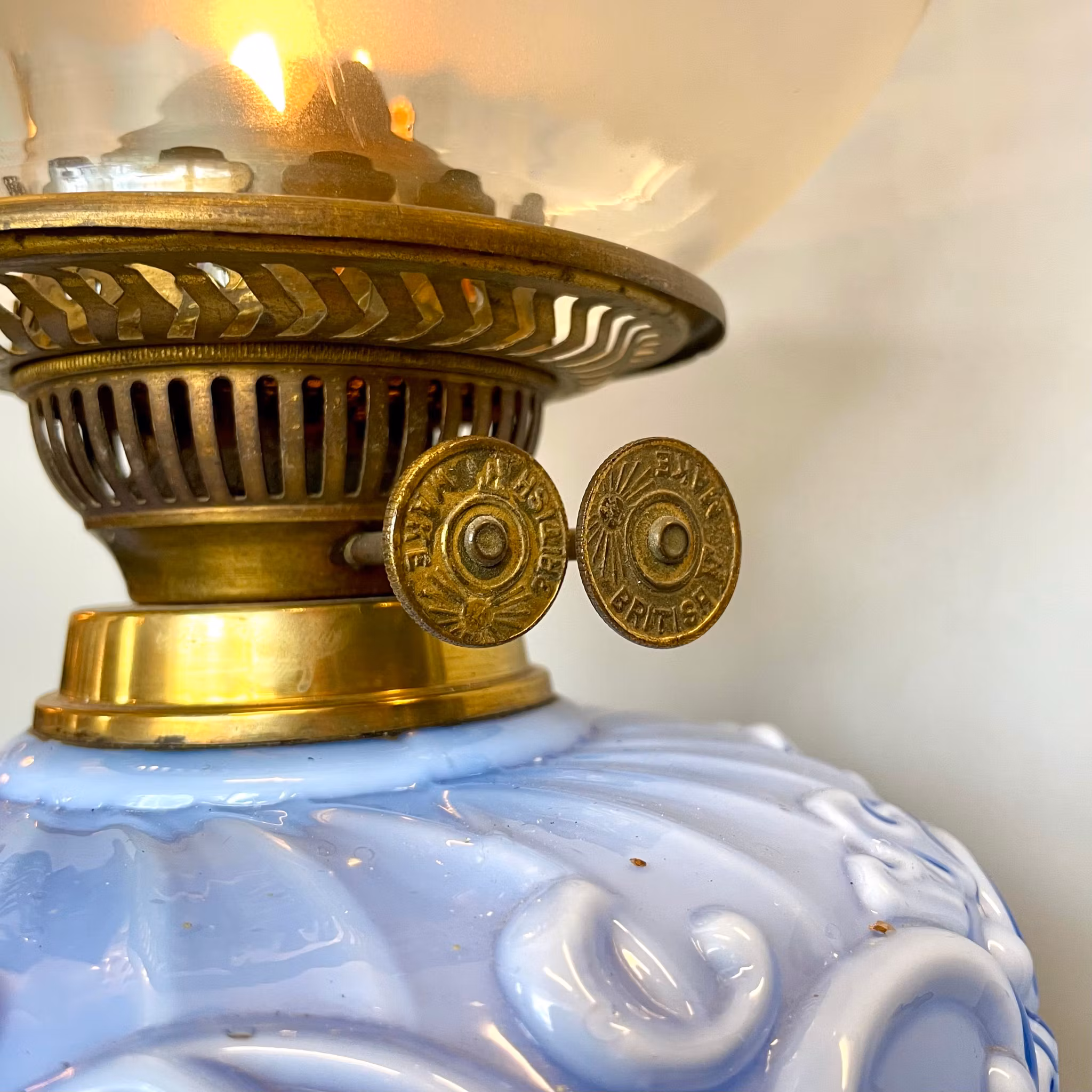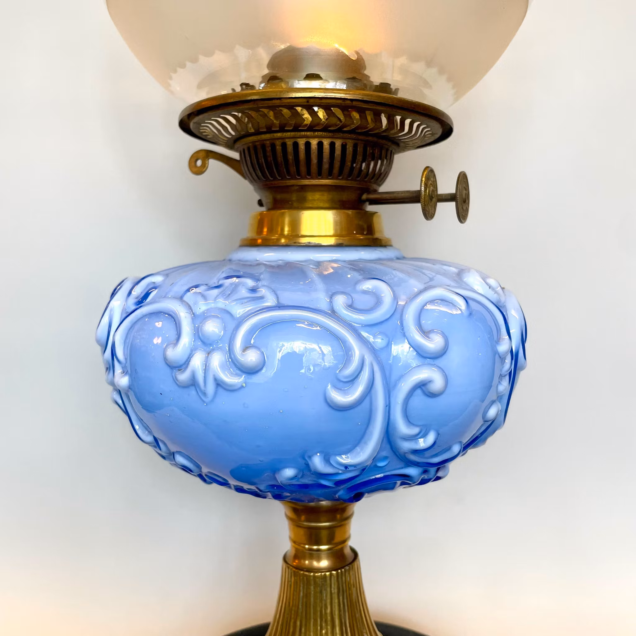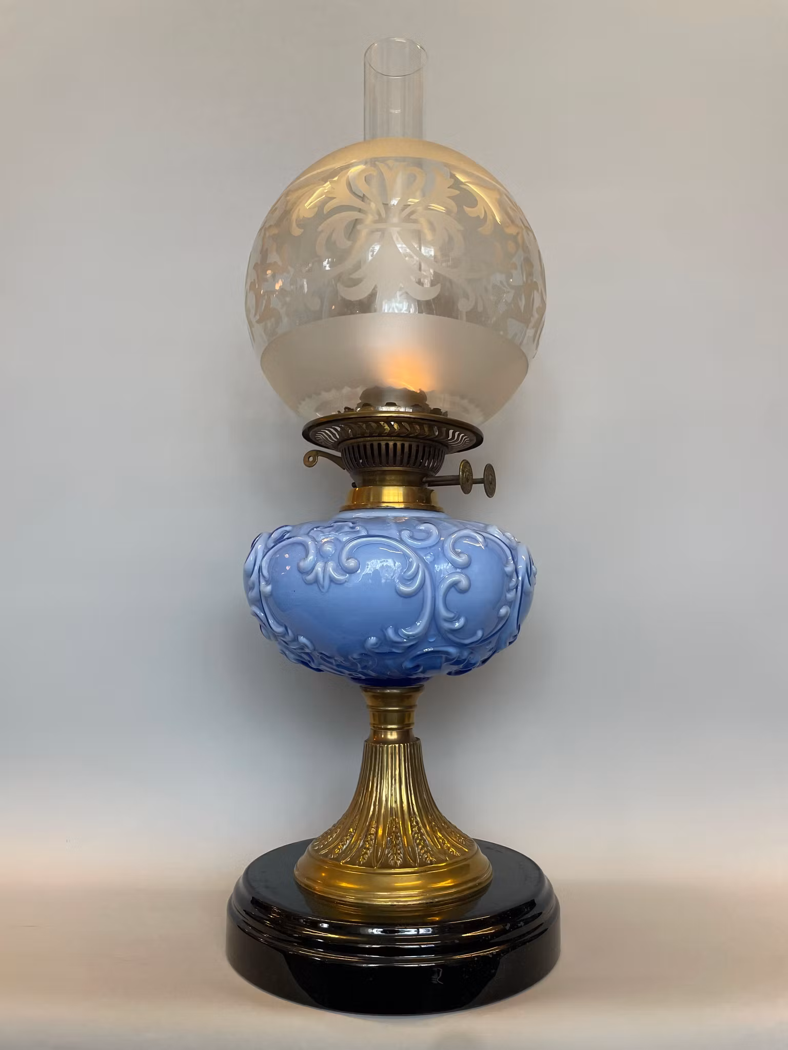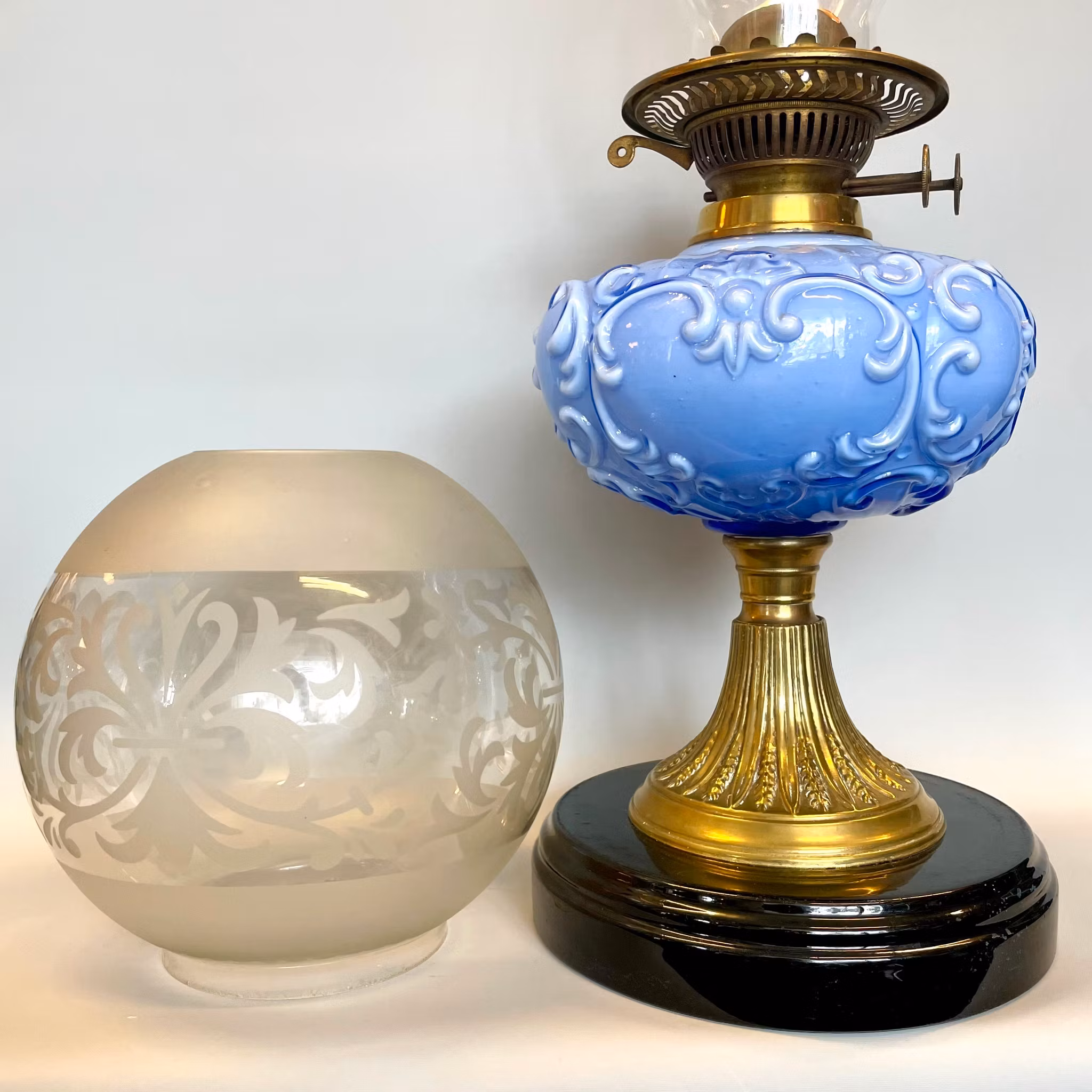 En antik brittisk fotogenlampa med fot i svart sten och mässing med Duplexbrännare (dubbla vekar) och fungerande släckspak. Vackert linblått glasoljehus i klassisk brittisk stil oljehus och en äldre delvis frostad klotkupa.