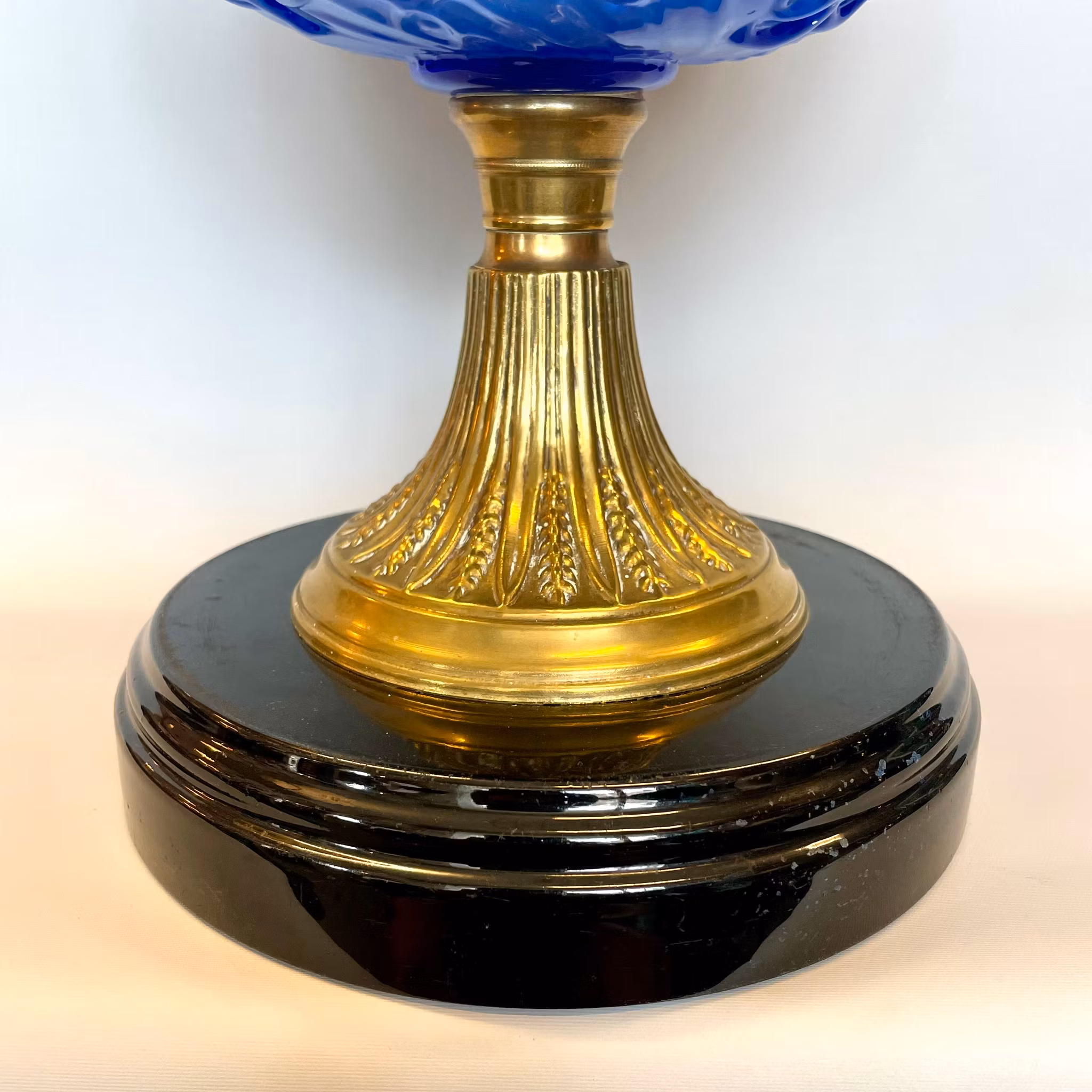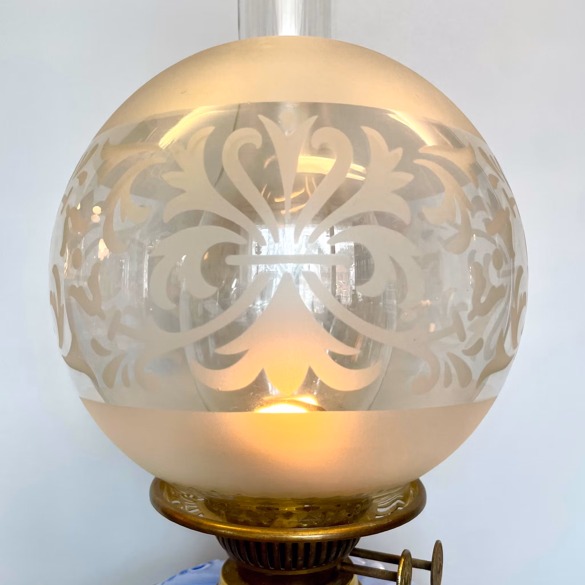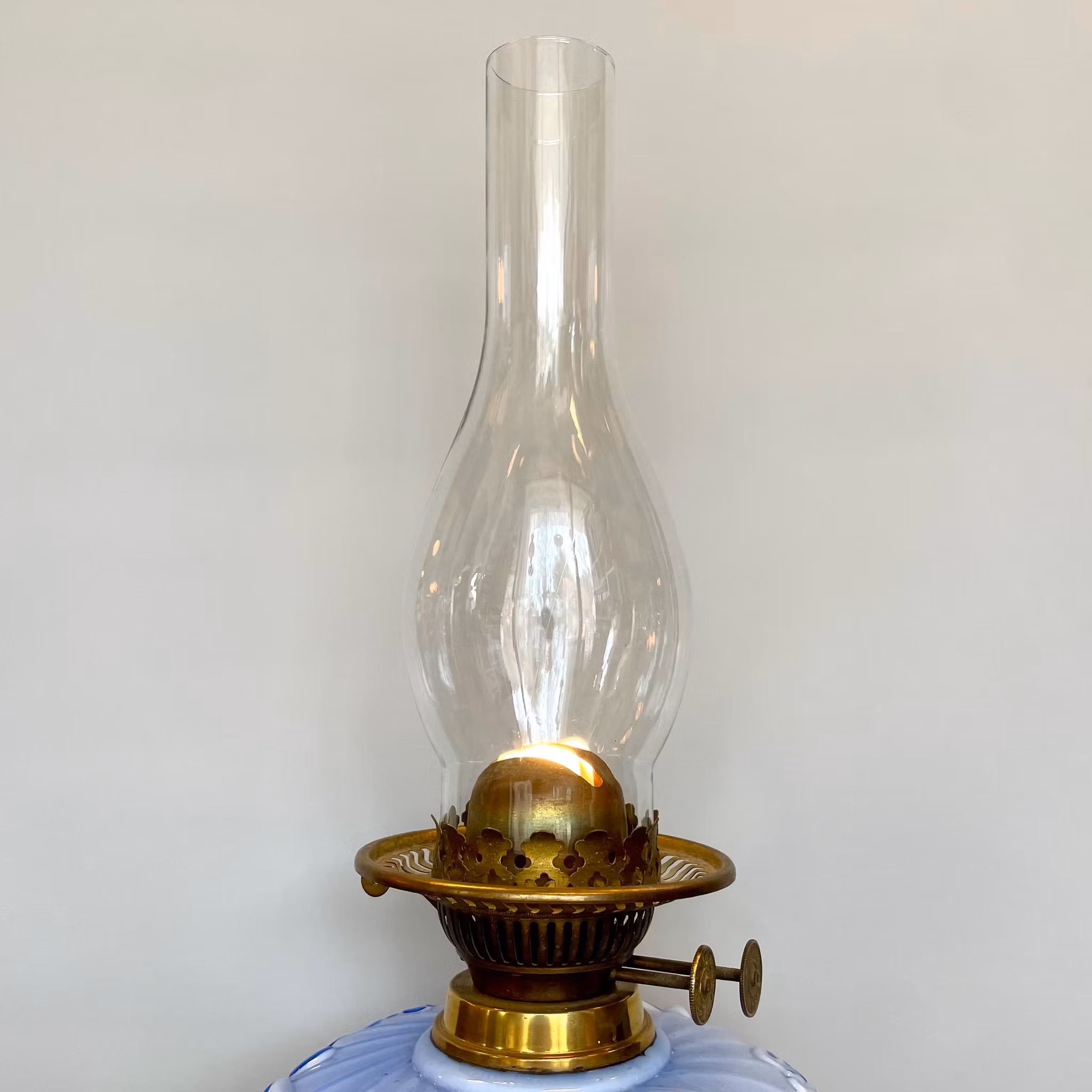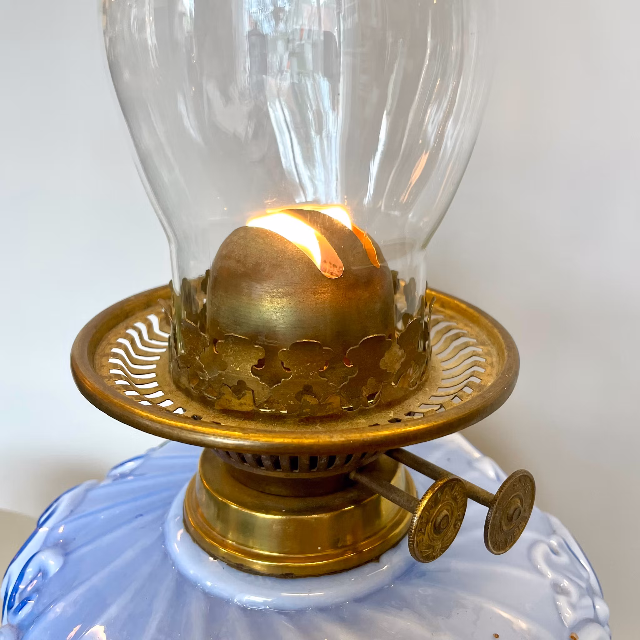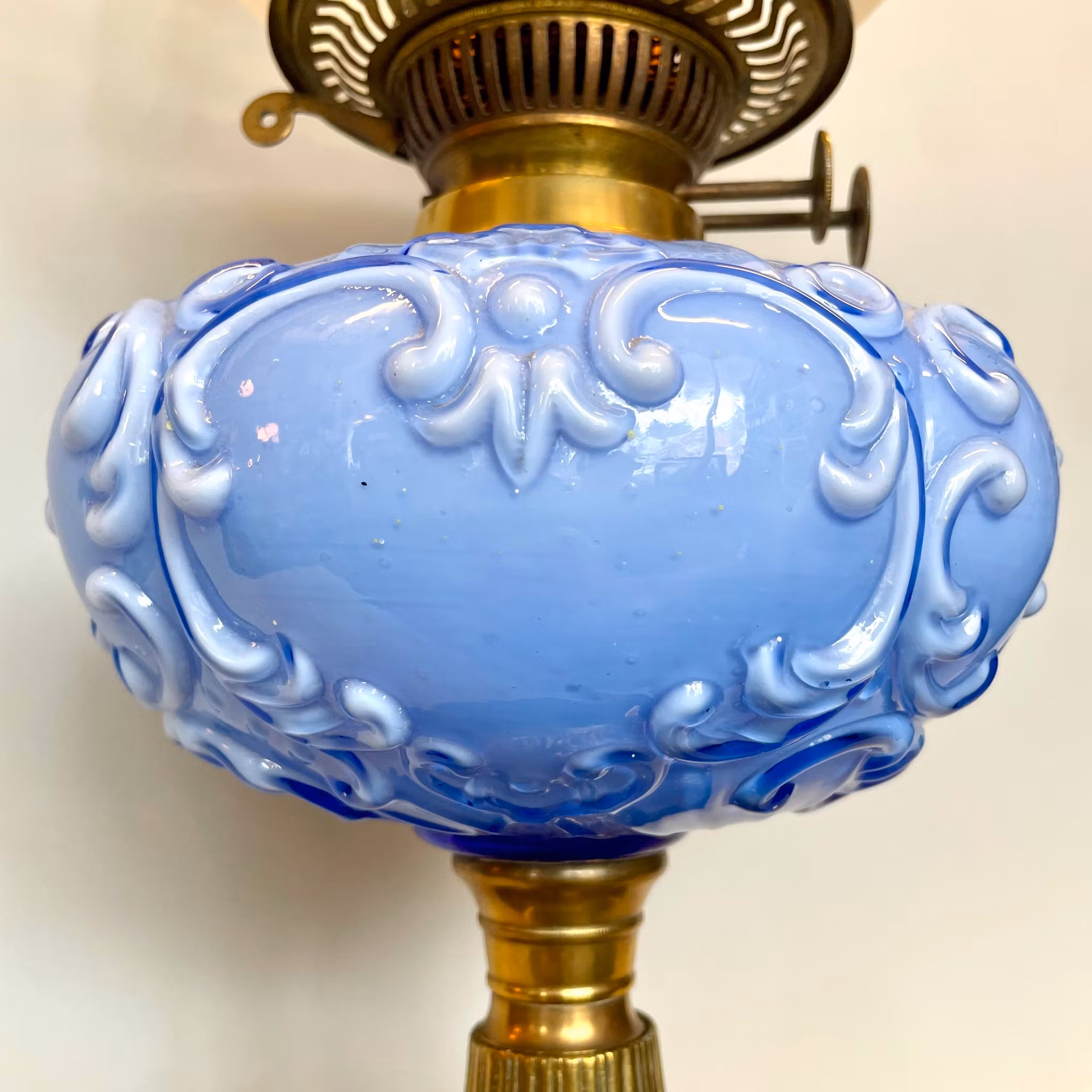 En antik brittisk fotogenlampa med fot i svart sten och mässing med Duplexbrännare (dubbla vekar) och fungerande släckspak. Vackert linblått glasoljehus i klassisk brittisk stil oljehus och en äldre delvis frostad klotkupa.