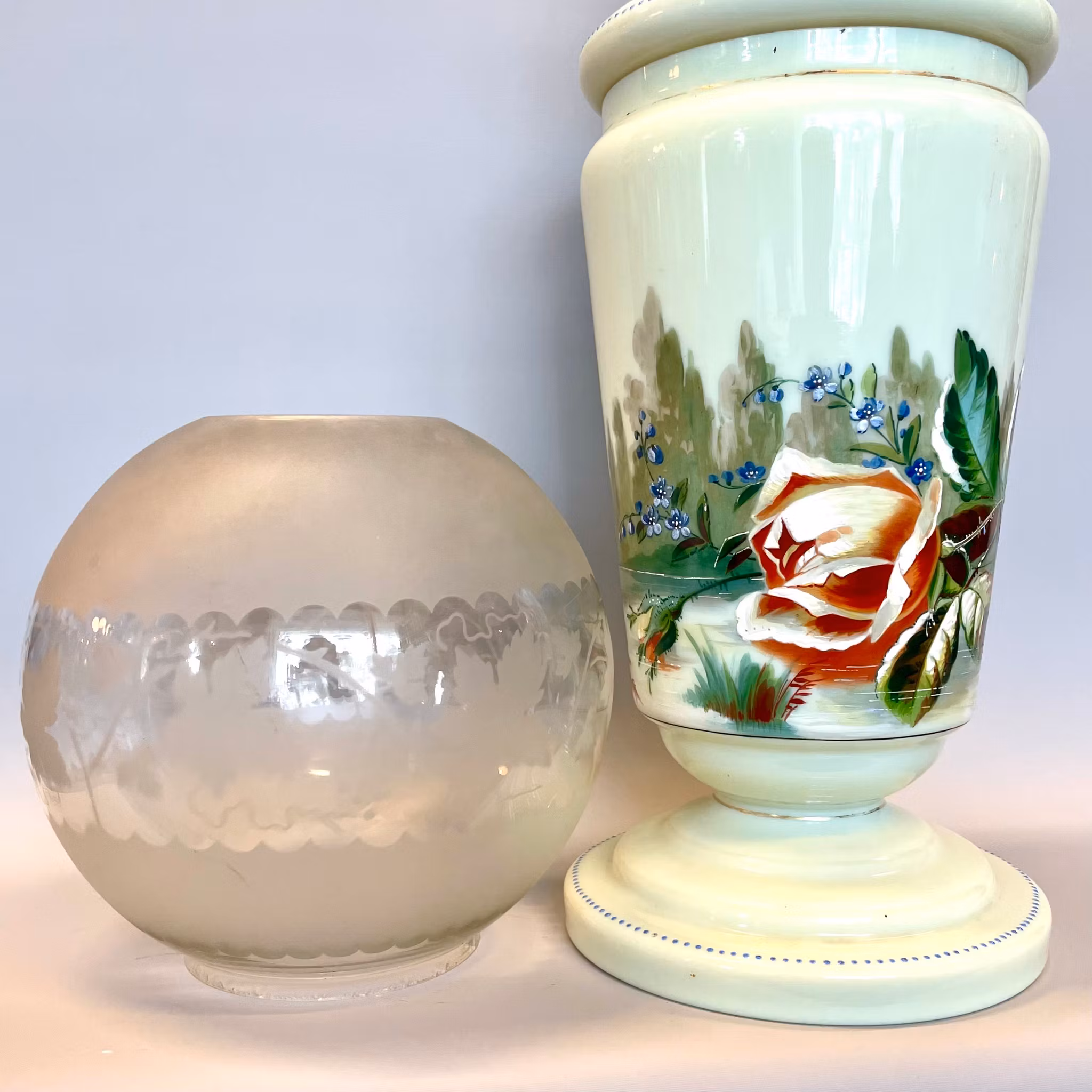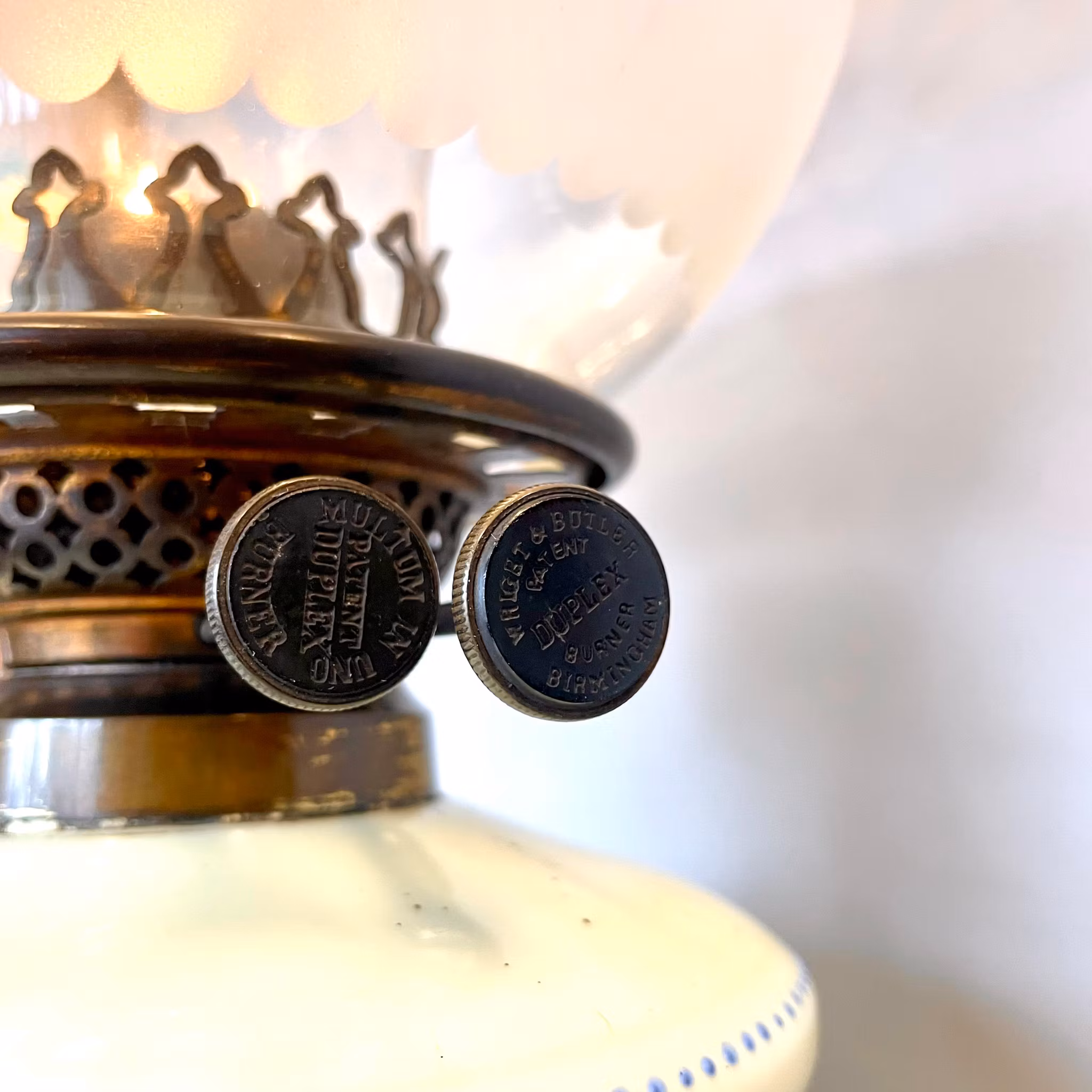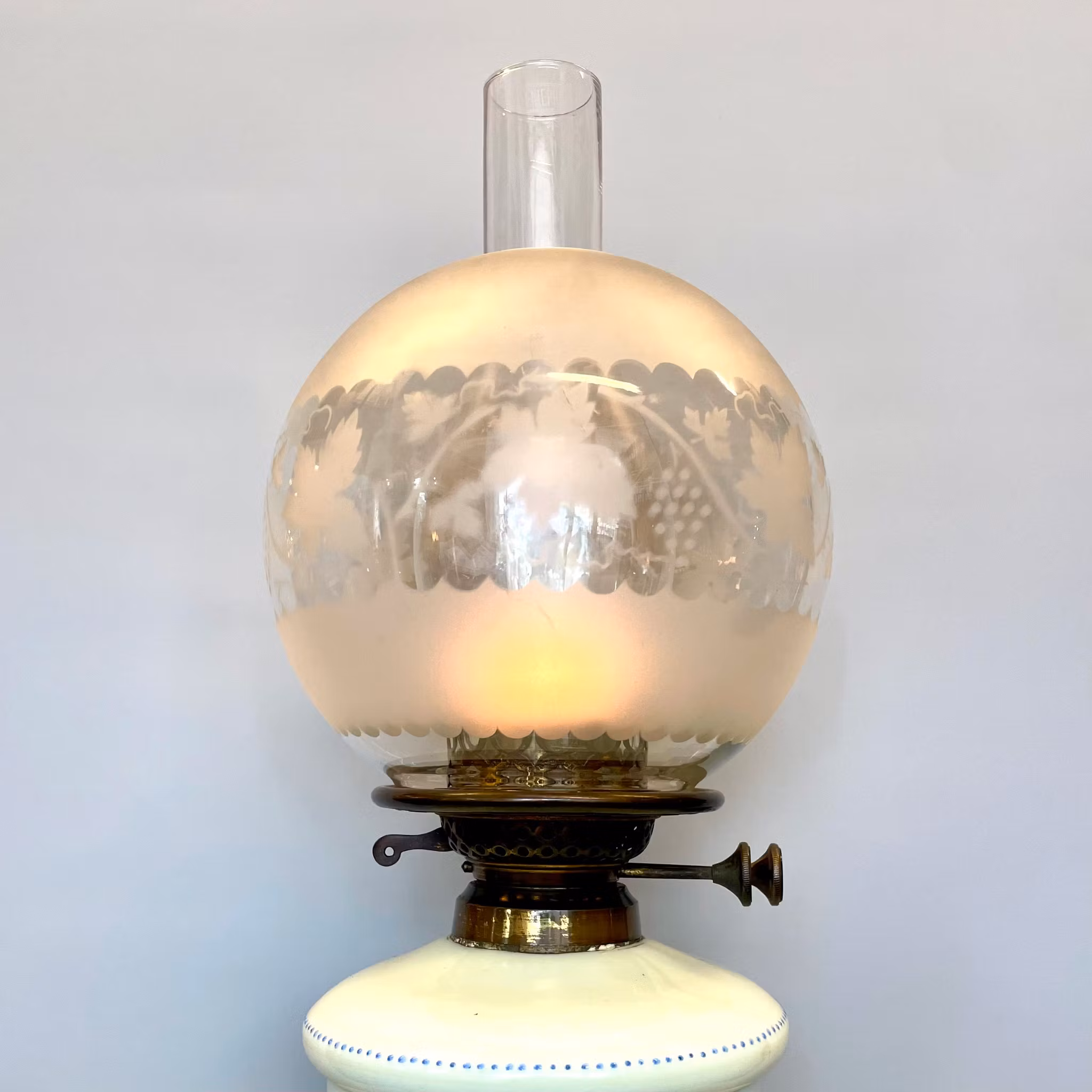 En antik brittisk fotogenlampa med porslinsfot i mintgrönt och vackert handmålat blomstermotiv. Fotogenlampan har en med Duplexbrännare (dubbla vekar) och fungerande släckspak. En äldre delvis frostad klotkupa med motiv av vinblad och vindruvor.