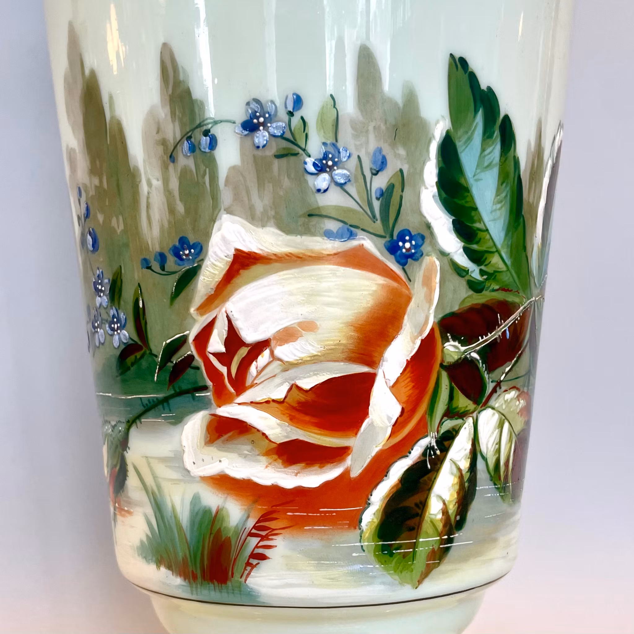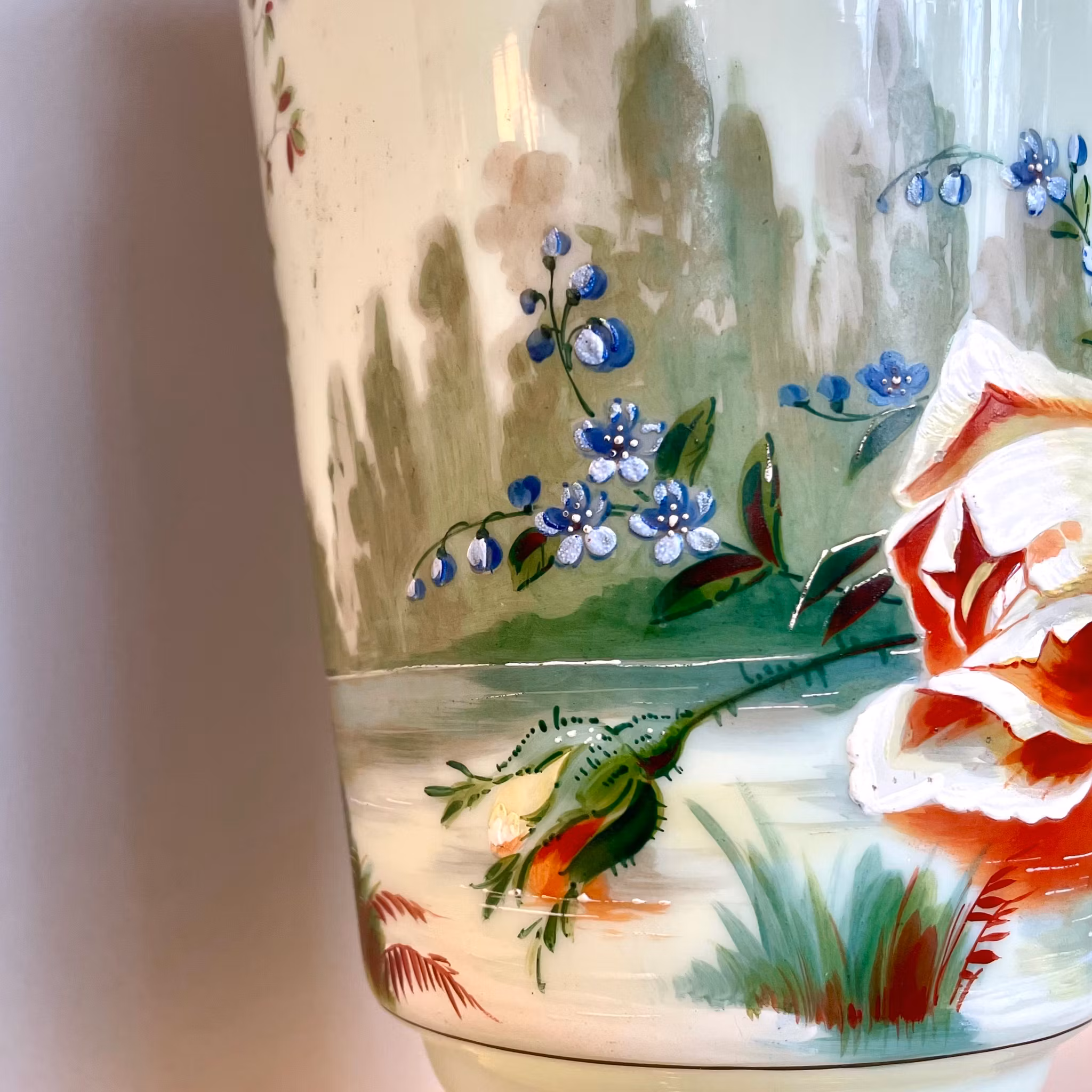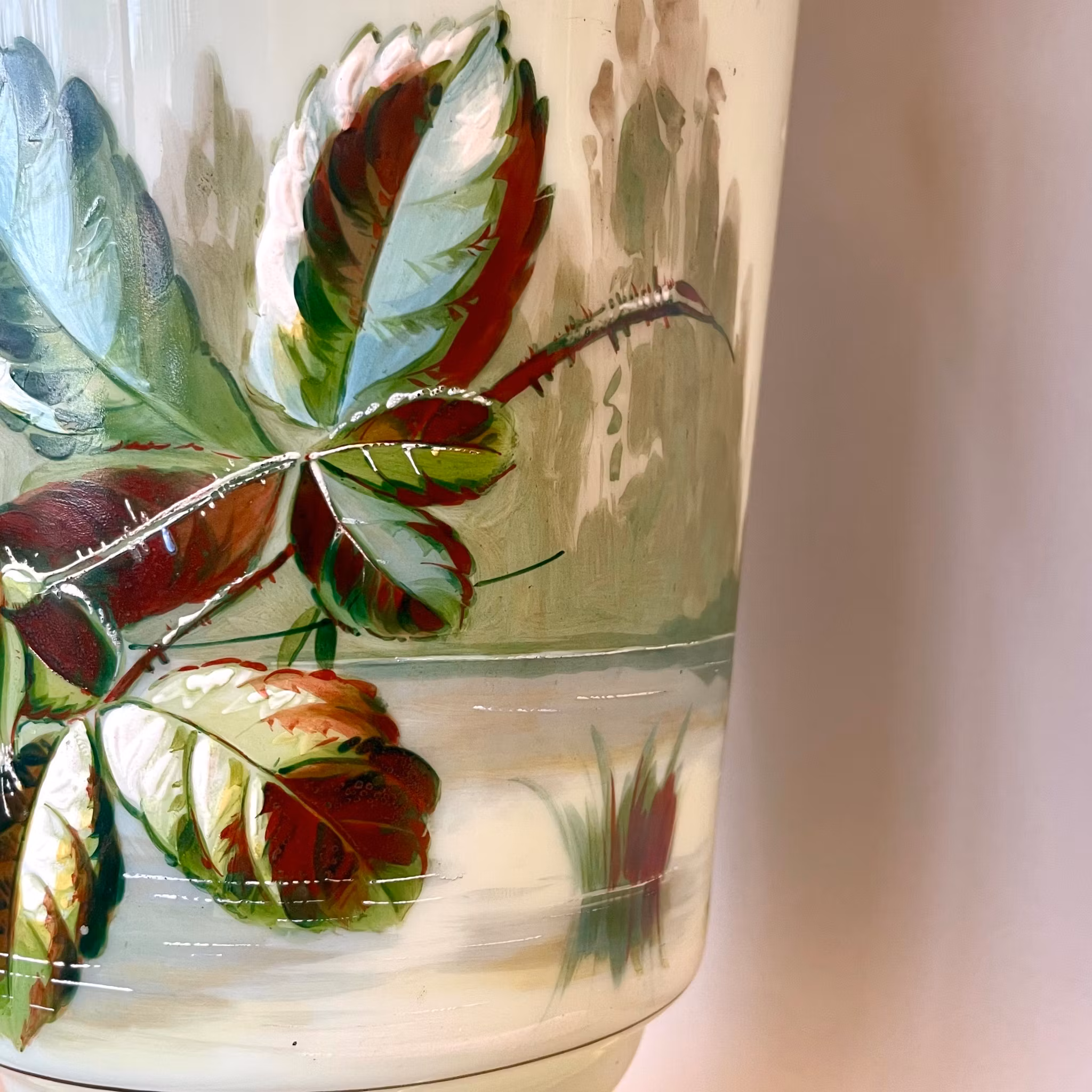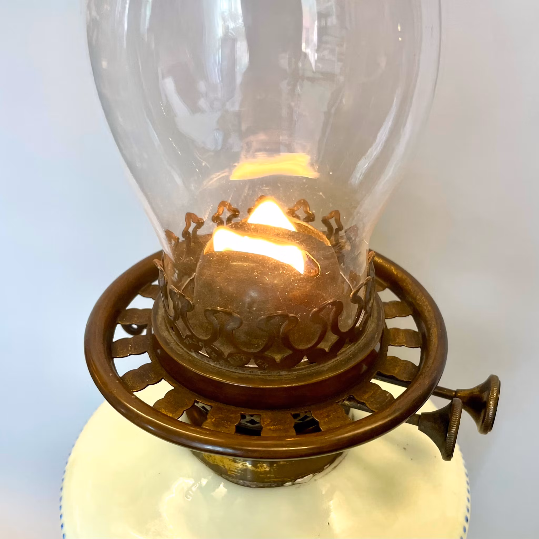 En antik brittisk fotogenlampa med porslinsfot i mintgrönt och vackert handmålat blomstermotiv. Fotogenlampan har en med Duplexbrännare (dubbla vekar) och fungerande släckspak. En äldre delvis frostad klotkupa med motiv av vinblad och vindruvor.