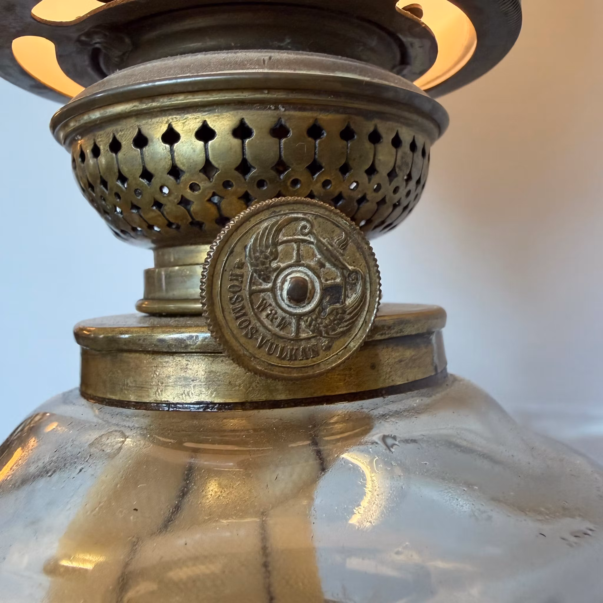Fotogenlampa med ovanligt mått 12''' kosmosbrännare i patinerad mässing från Wild & Wessel i Berlin och med stämplat kosmosglas. Kupan är nytillverkad från Karlskrona Lampfabrik - men den är väldigt vacker till lampan.