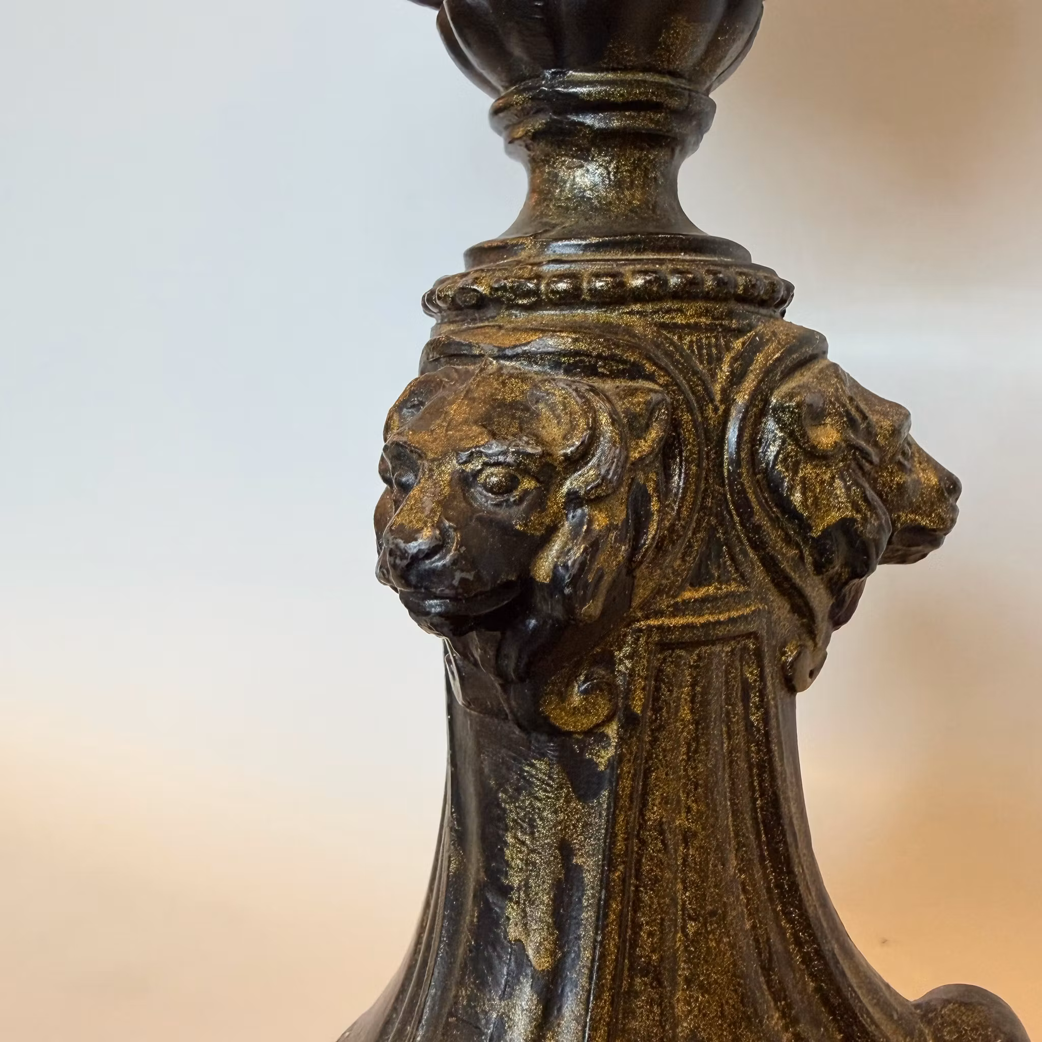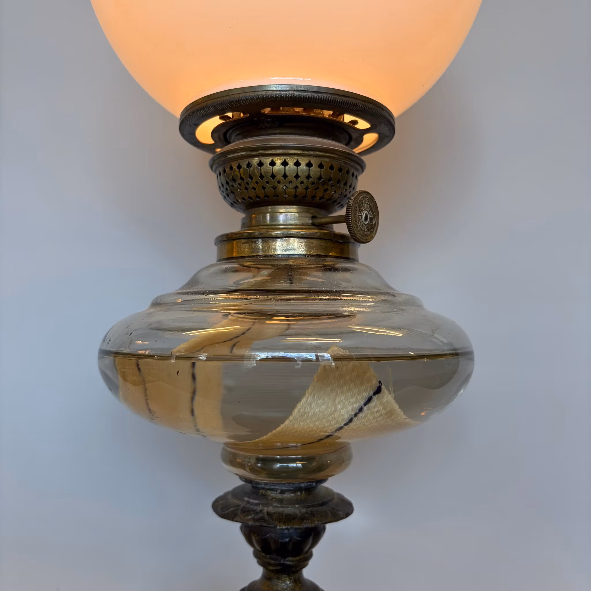 En extrasnygg fotogenlampa med sin fantastiska lejonfot och 1870-tals formgivningen på denna tillsammans med det vackra enkla oljehuset i glas med sina rundade 1870-tals former.