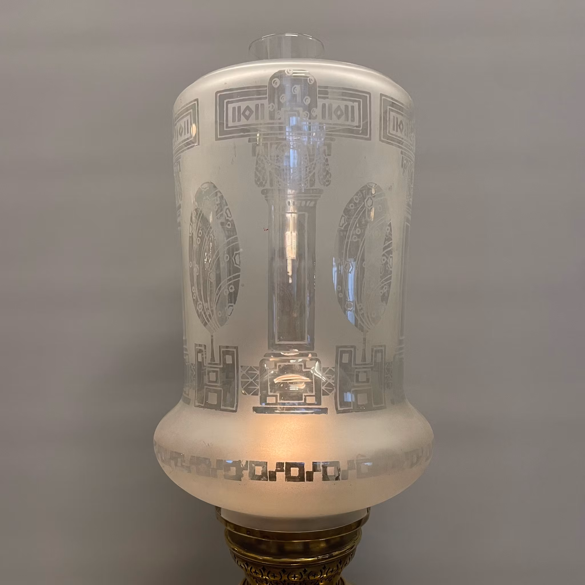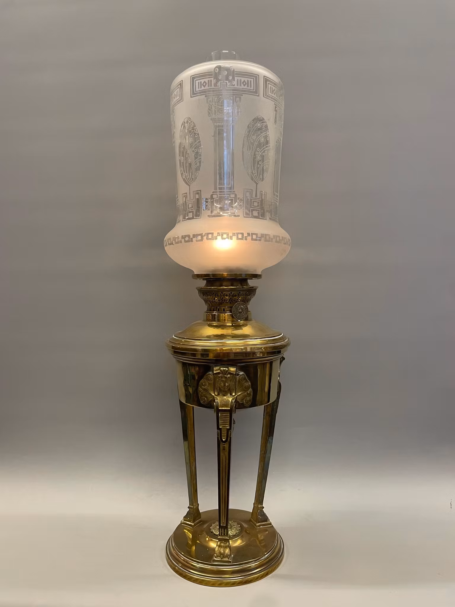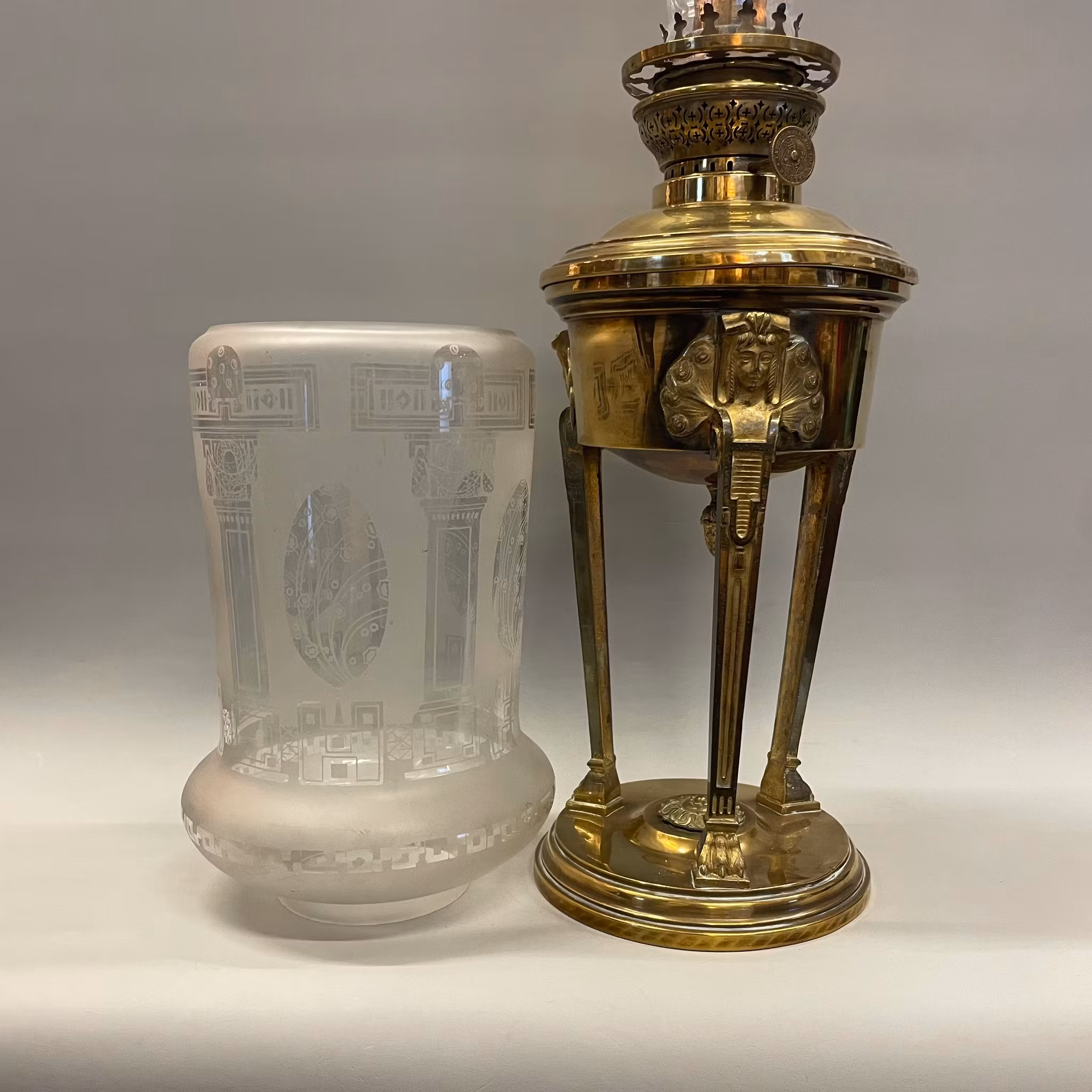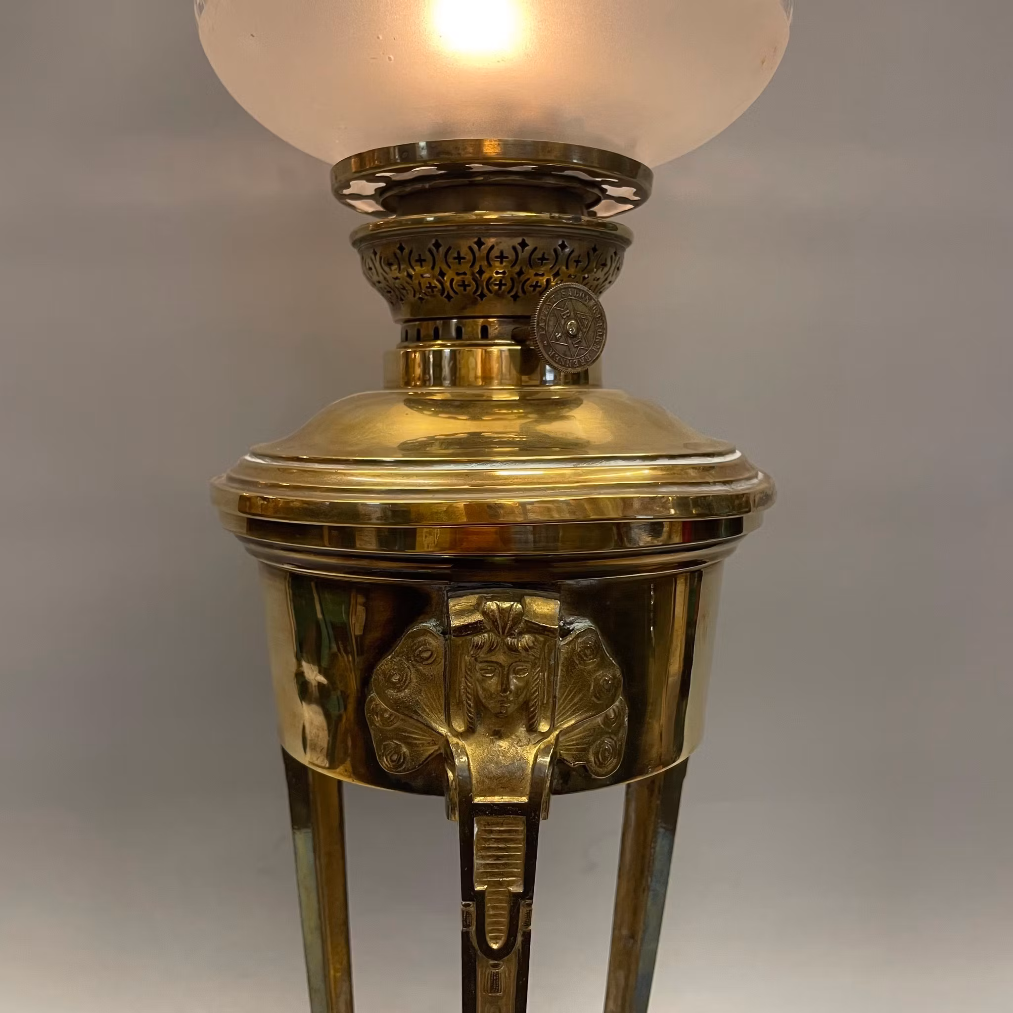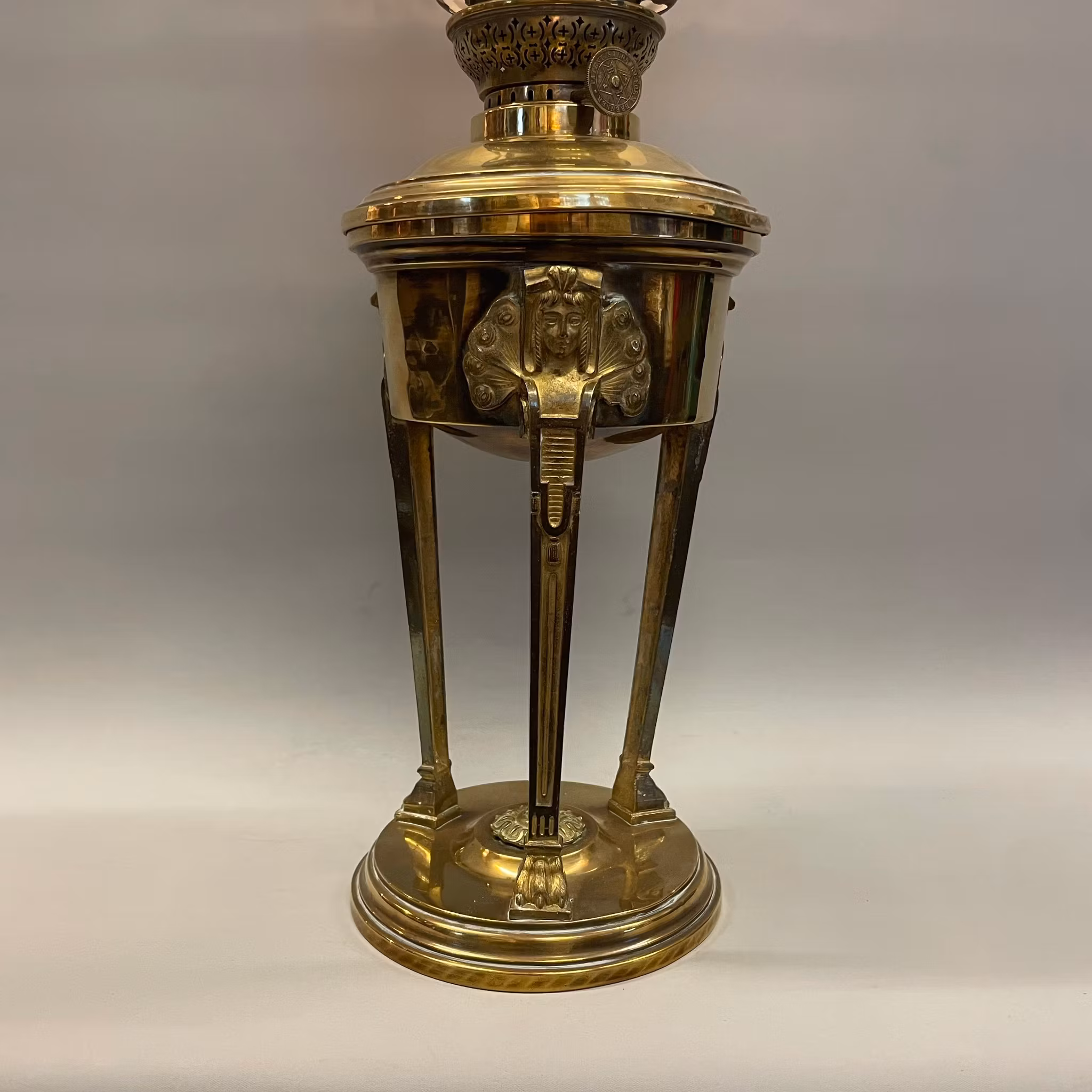 Fotogenlampa med 14''' brännare i polerad mässing och en antik vackert mönstrad och ovanligt formad fotogenkupa.