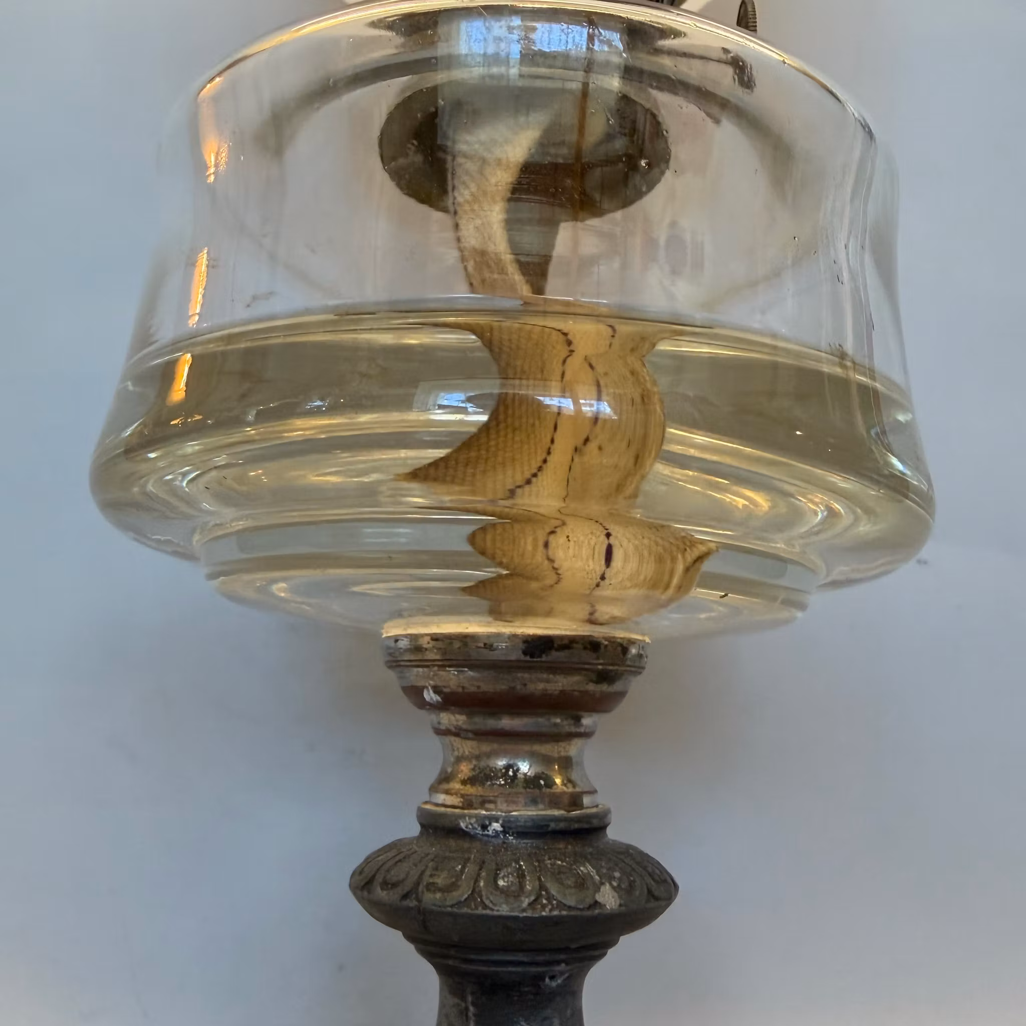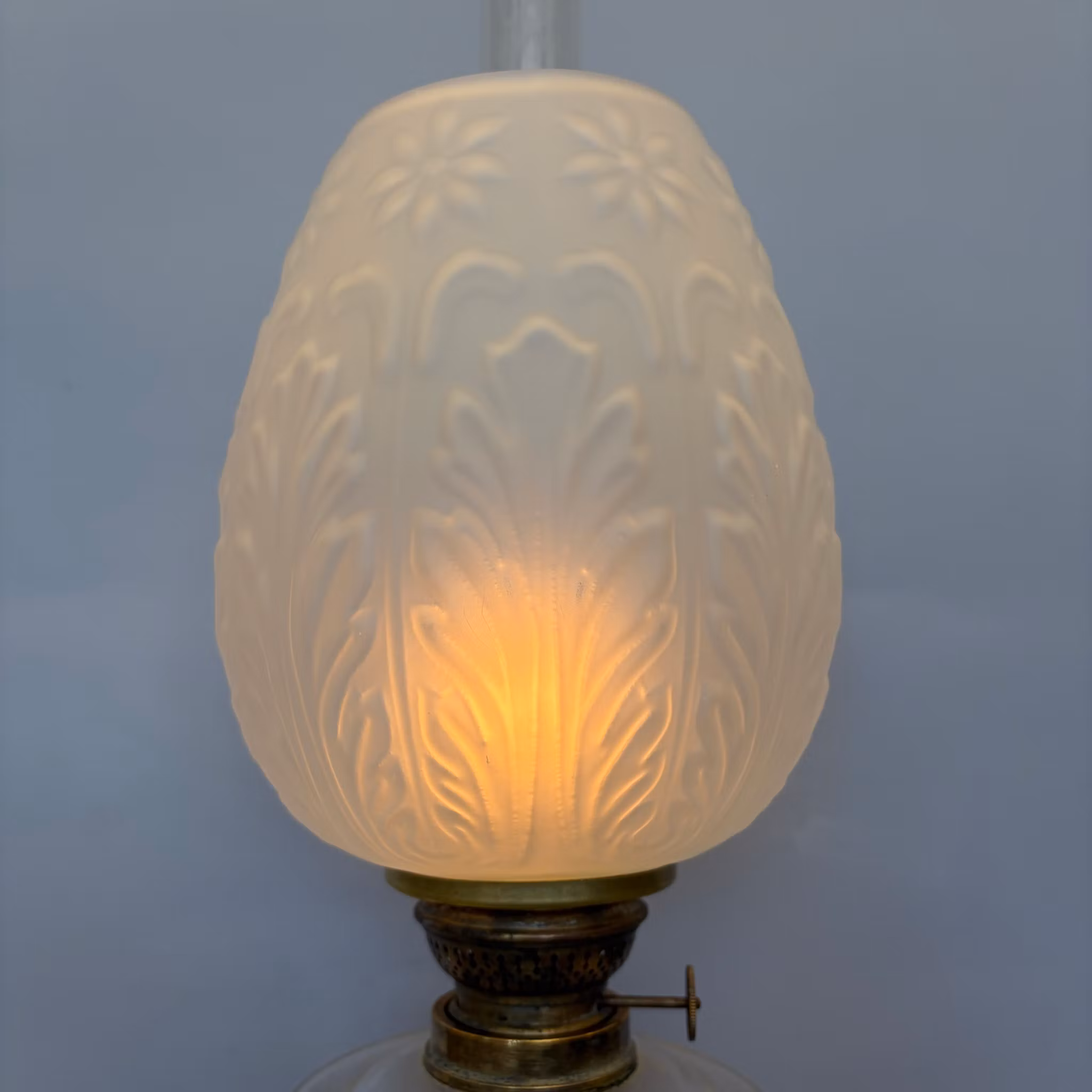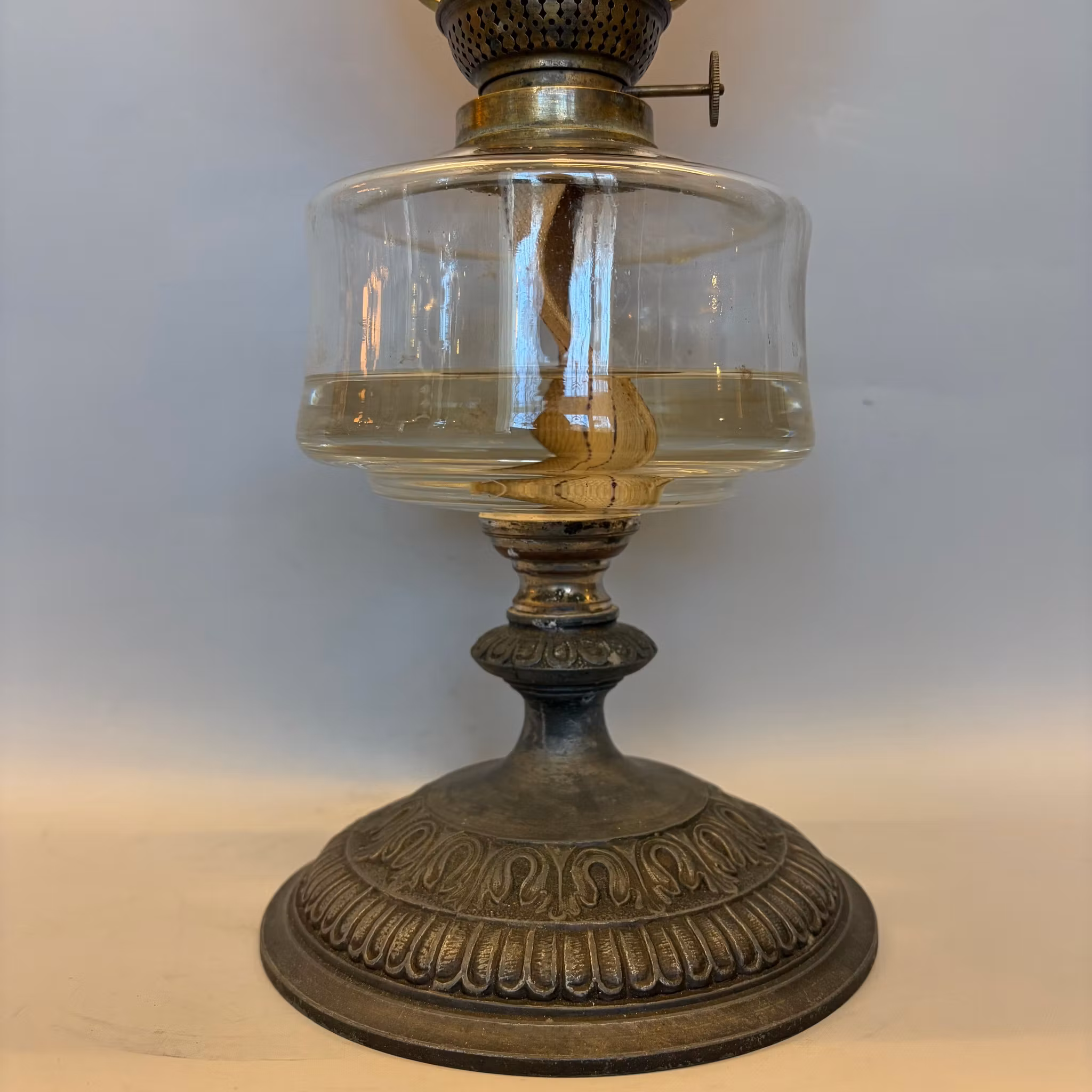 En snygg antik bordsfotogenlampa med glasoljehus och snygg fot i zinkgjutgods. Frostad och mönstrad tulpankupa med akantusmotiv från Karlskrona Lampfabrik.