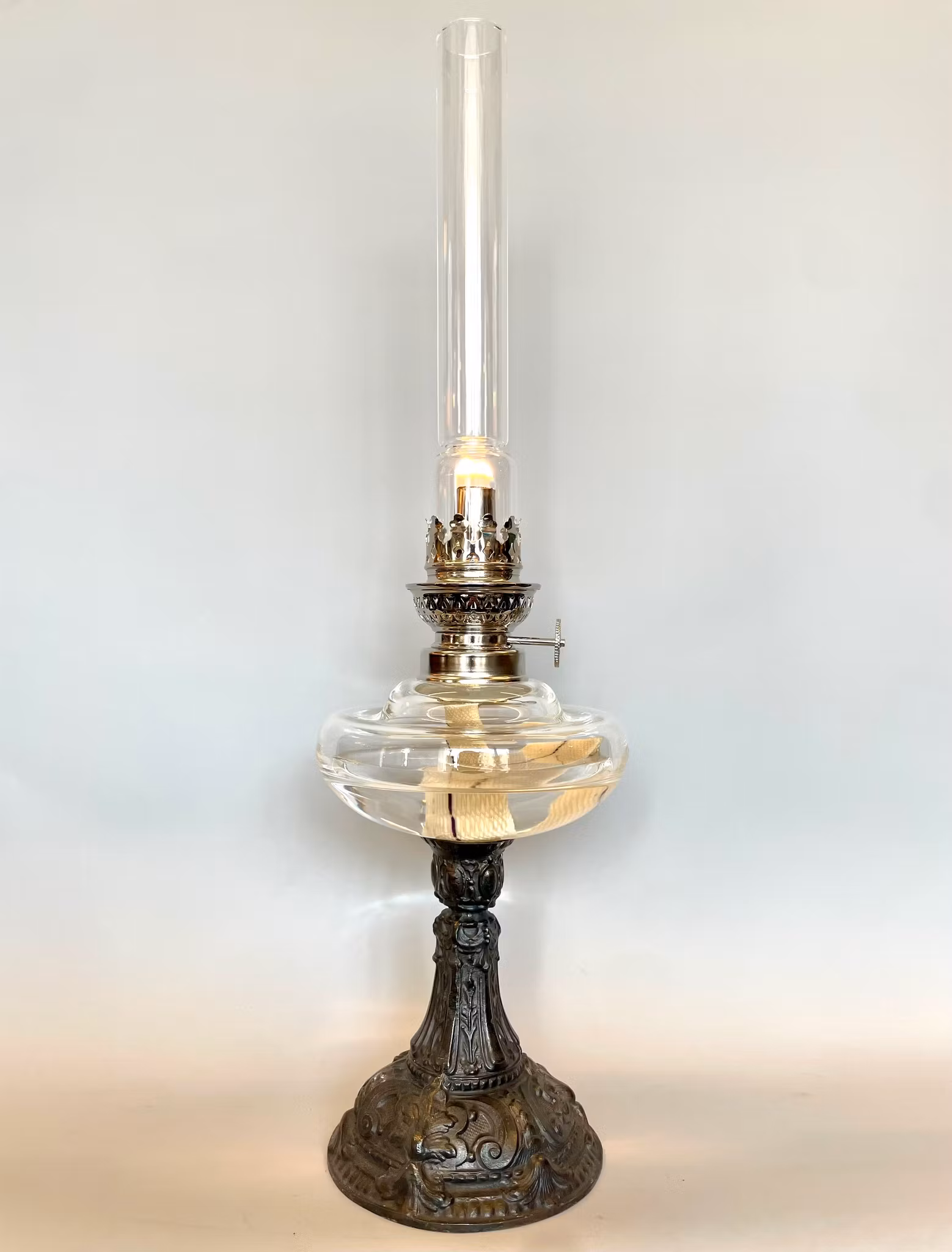 En klassisk mindre bordsfotogenlampa med snyggt oljehus i klart glas och lampfot i zinkgjutgods.