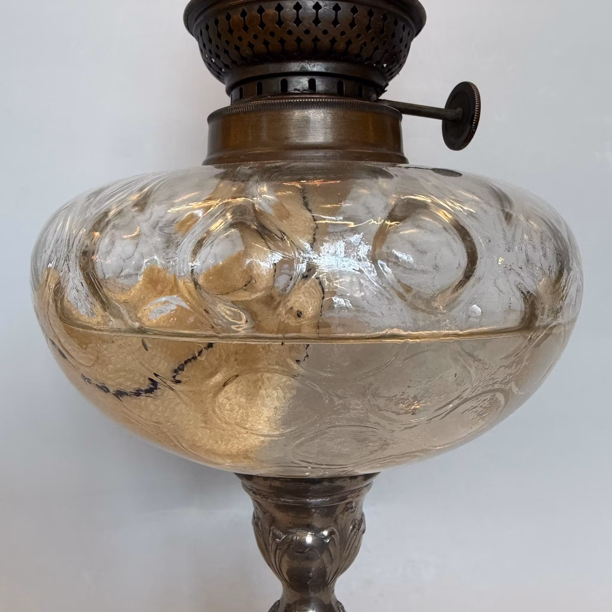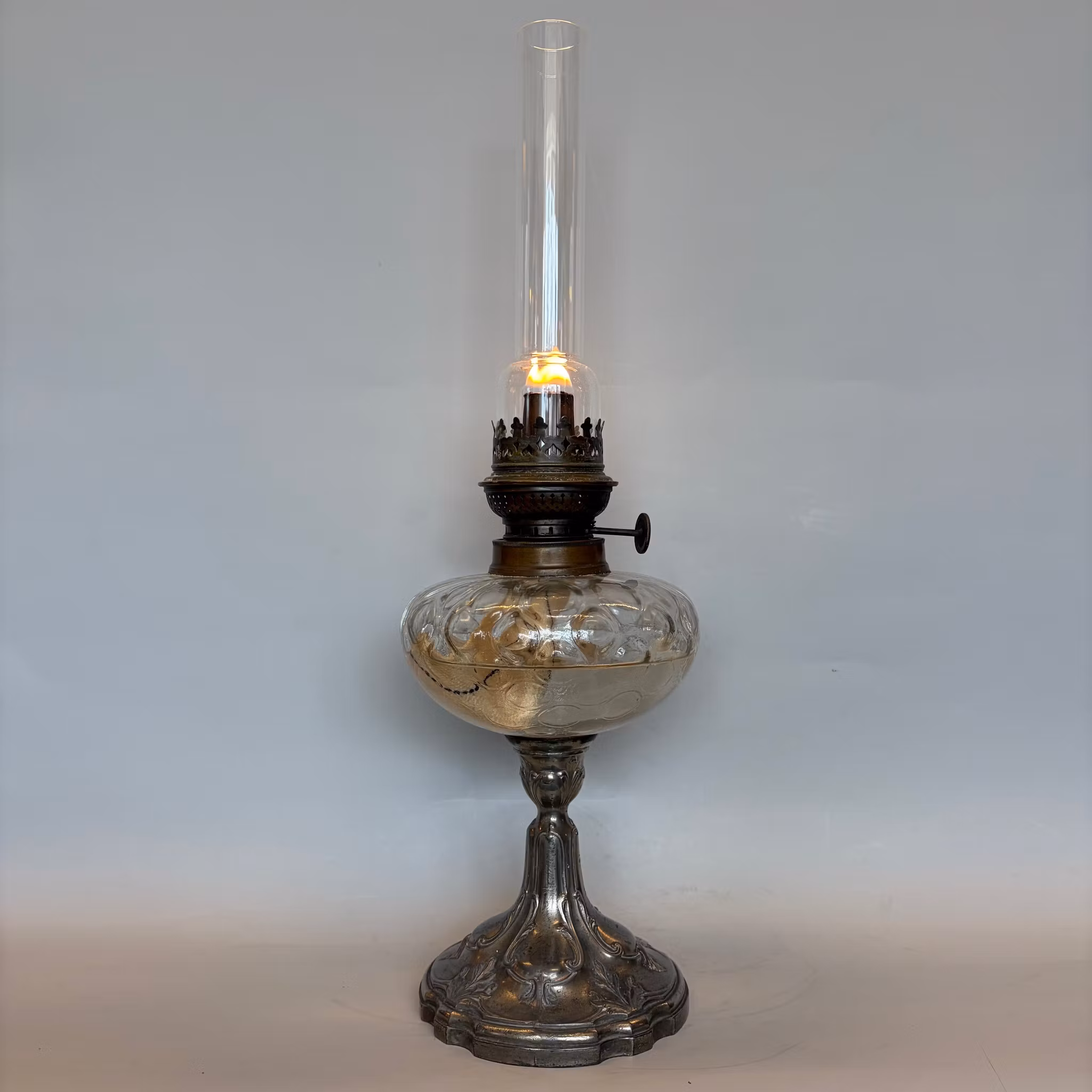 Fotogenlampa med 14''' mässingsbrännare och kosmosglas.