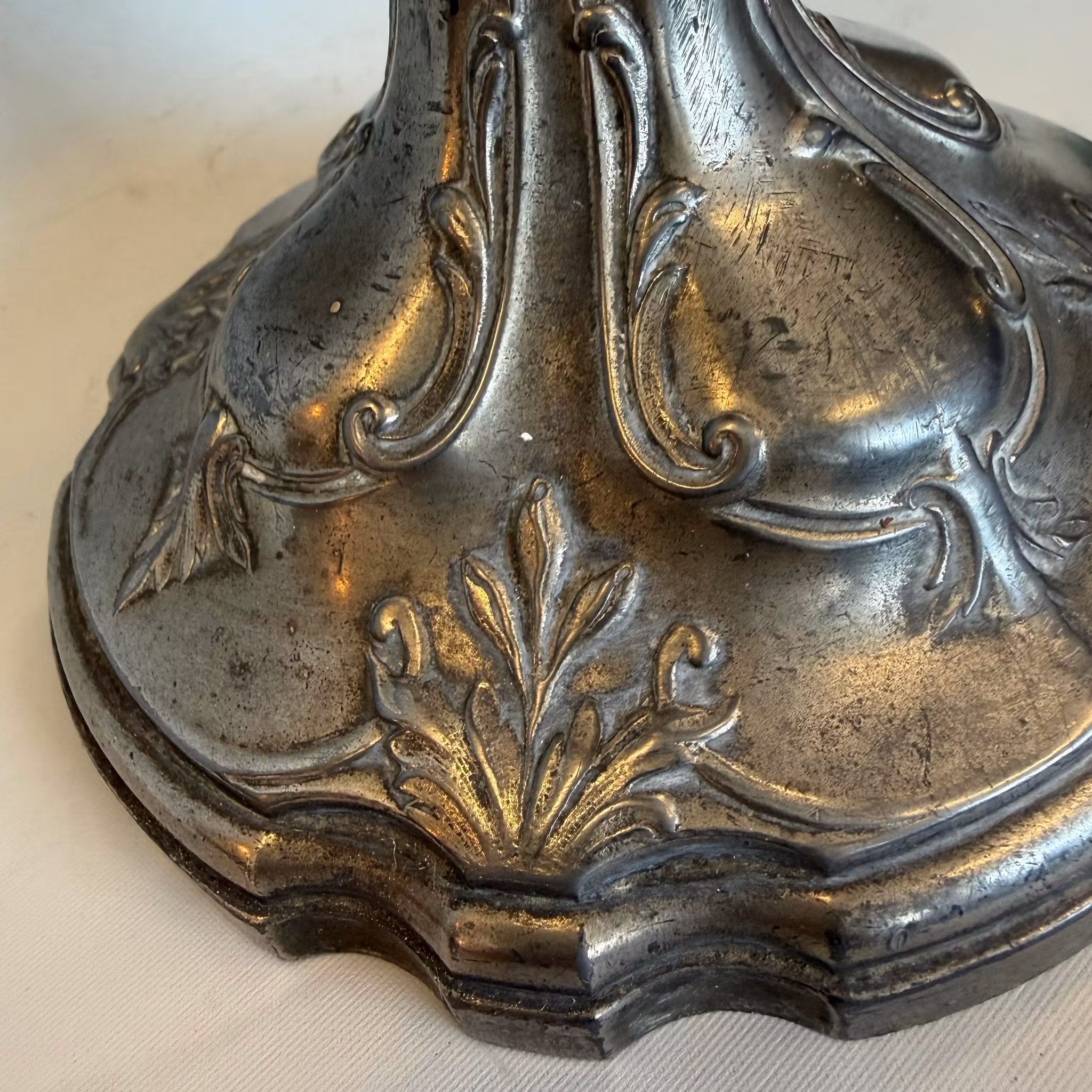 En vacker antik fransk fotogenlampa med tegelröd stenfot med glasoljehus och en förnicklad fot
