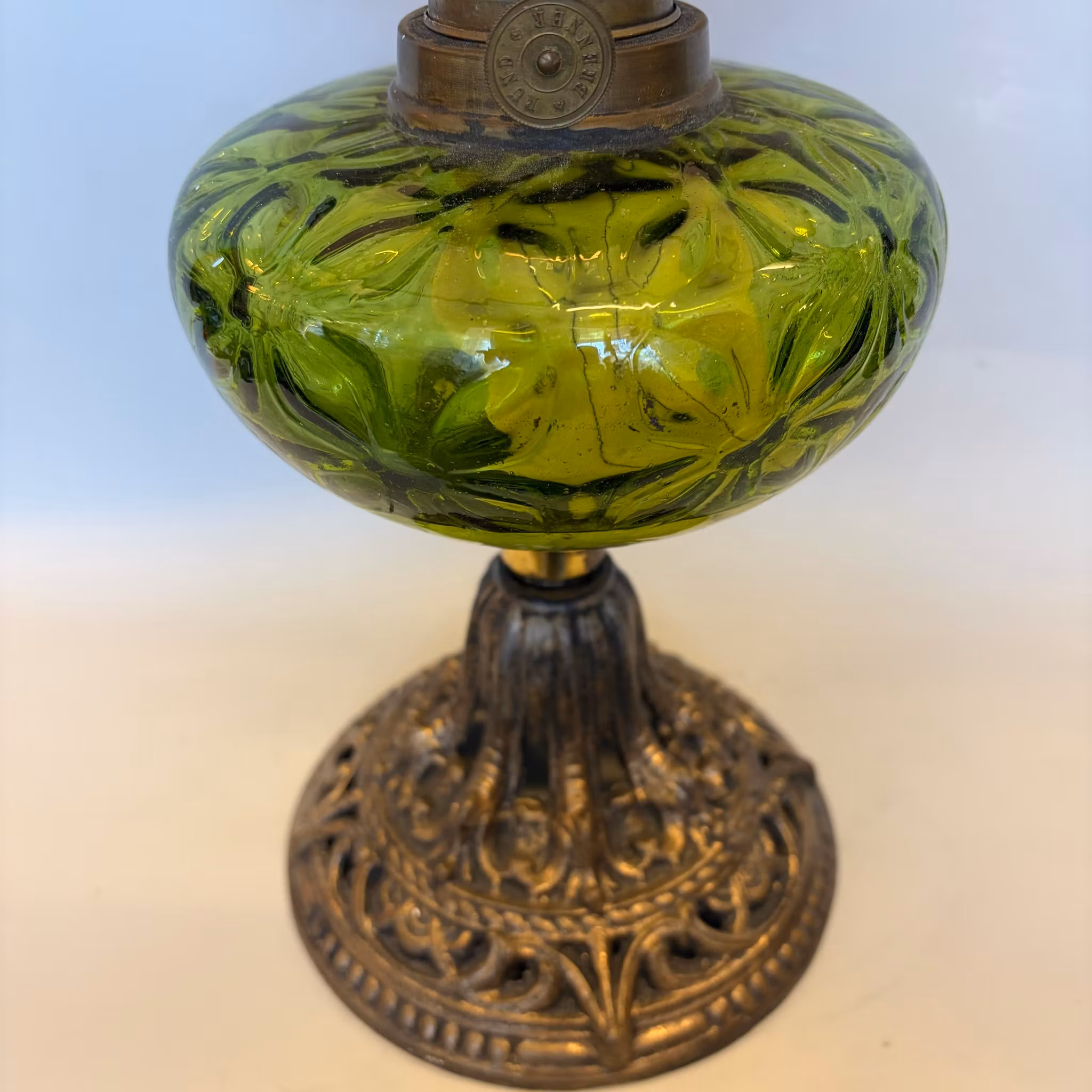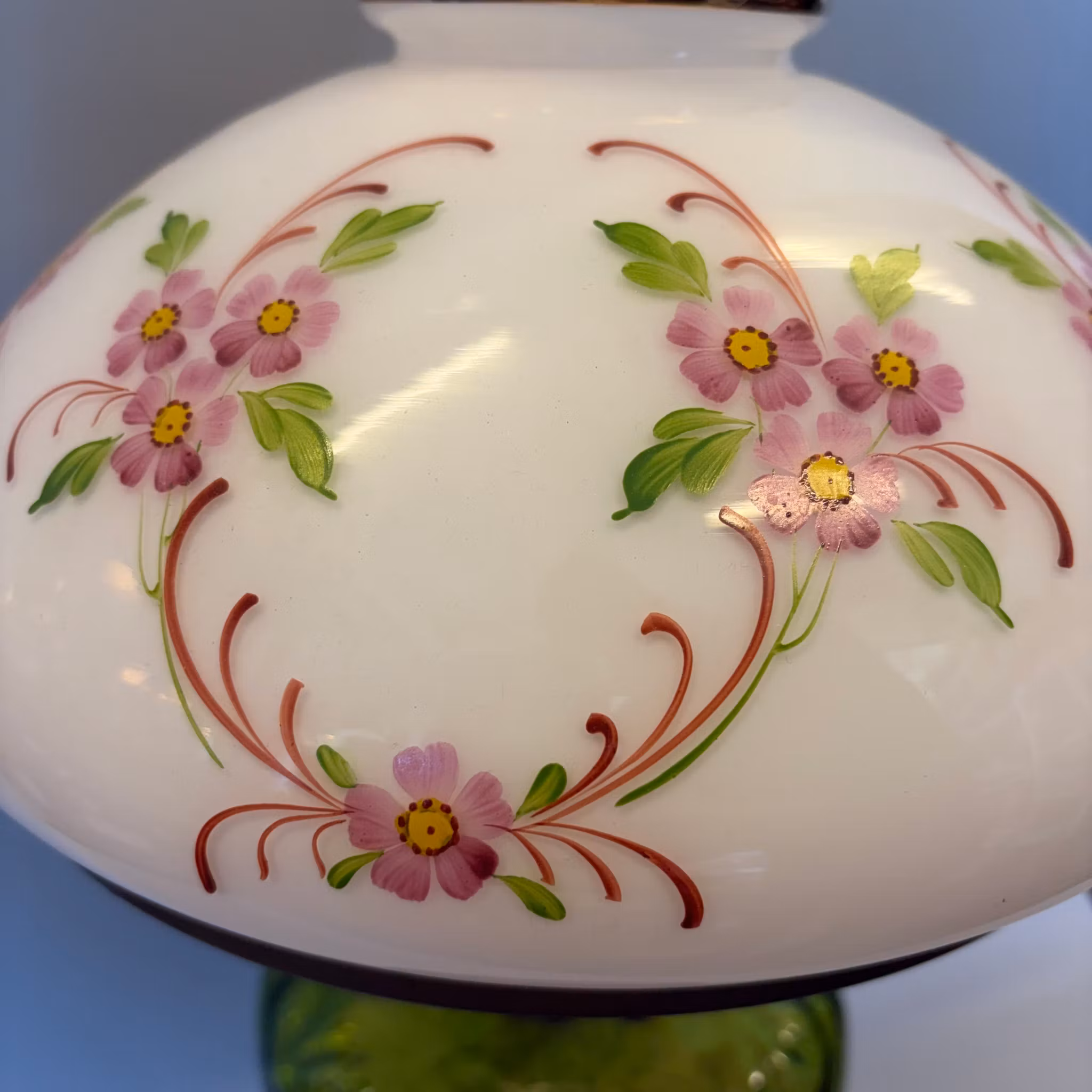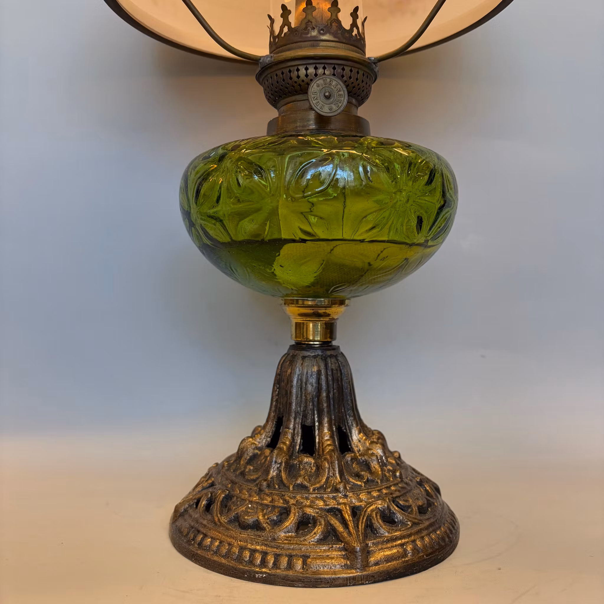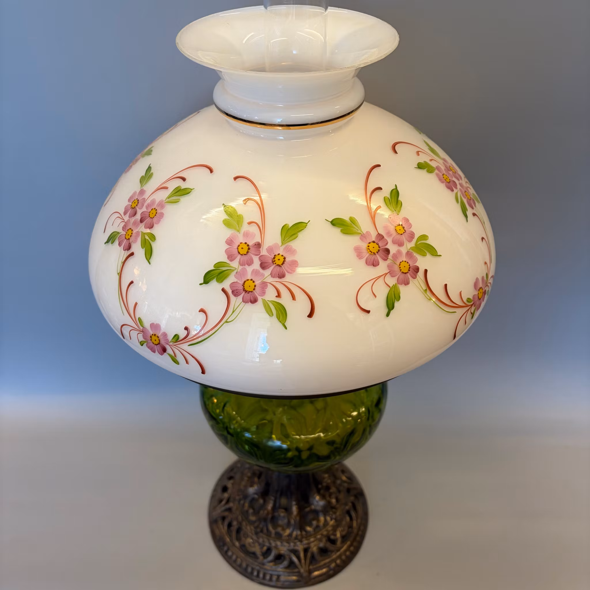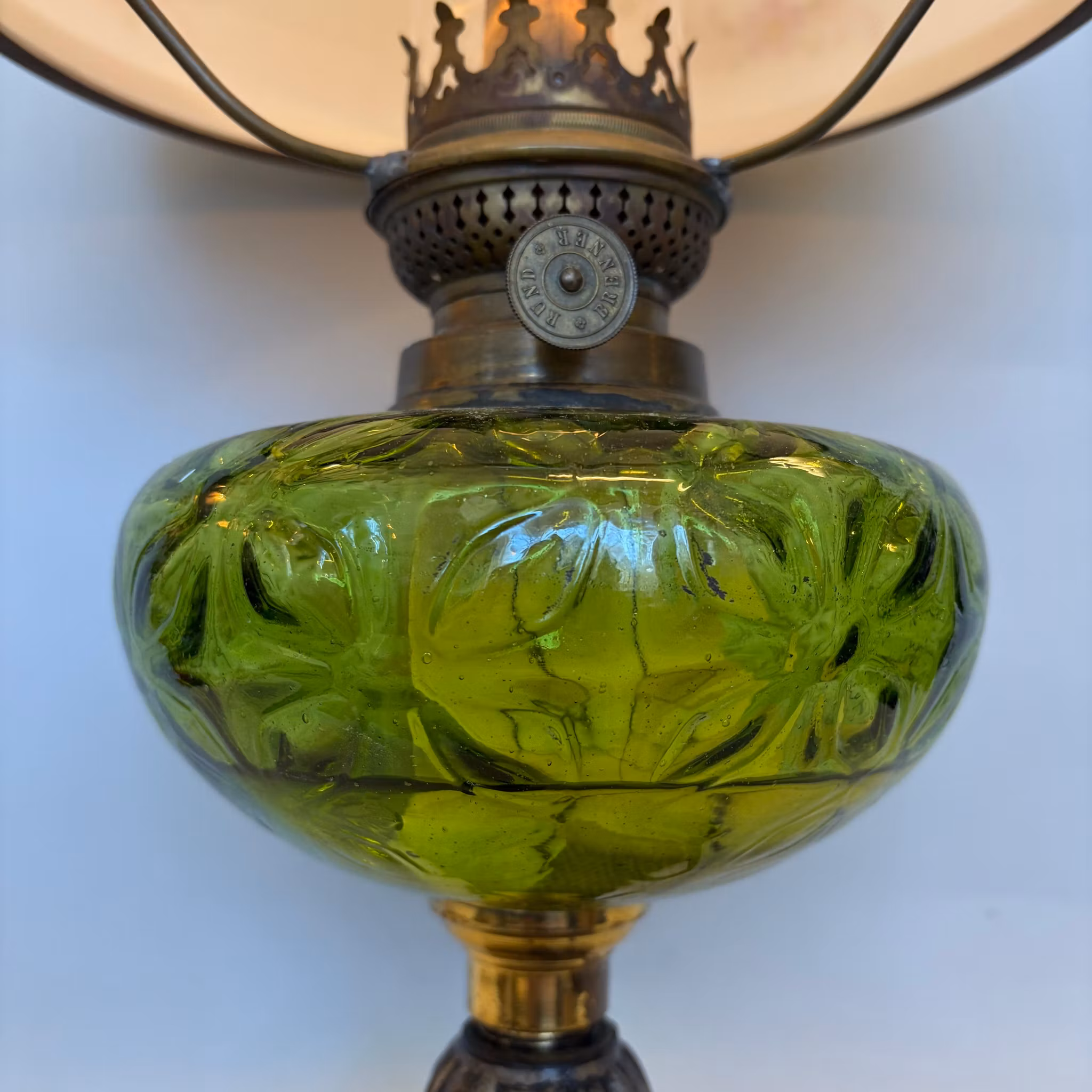 En antik jugendfotogenlampa med grönt glasoljehus och en målad fot samt en mässingsbrännare och skärmring. Elegant handmålad vestaskärm som är 23,5 cm i nedra fattning.