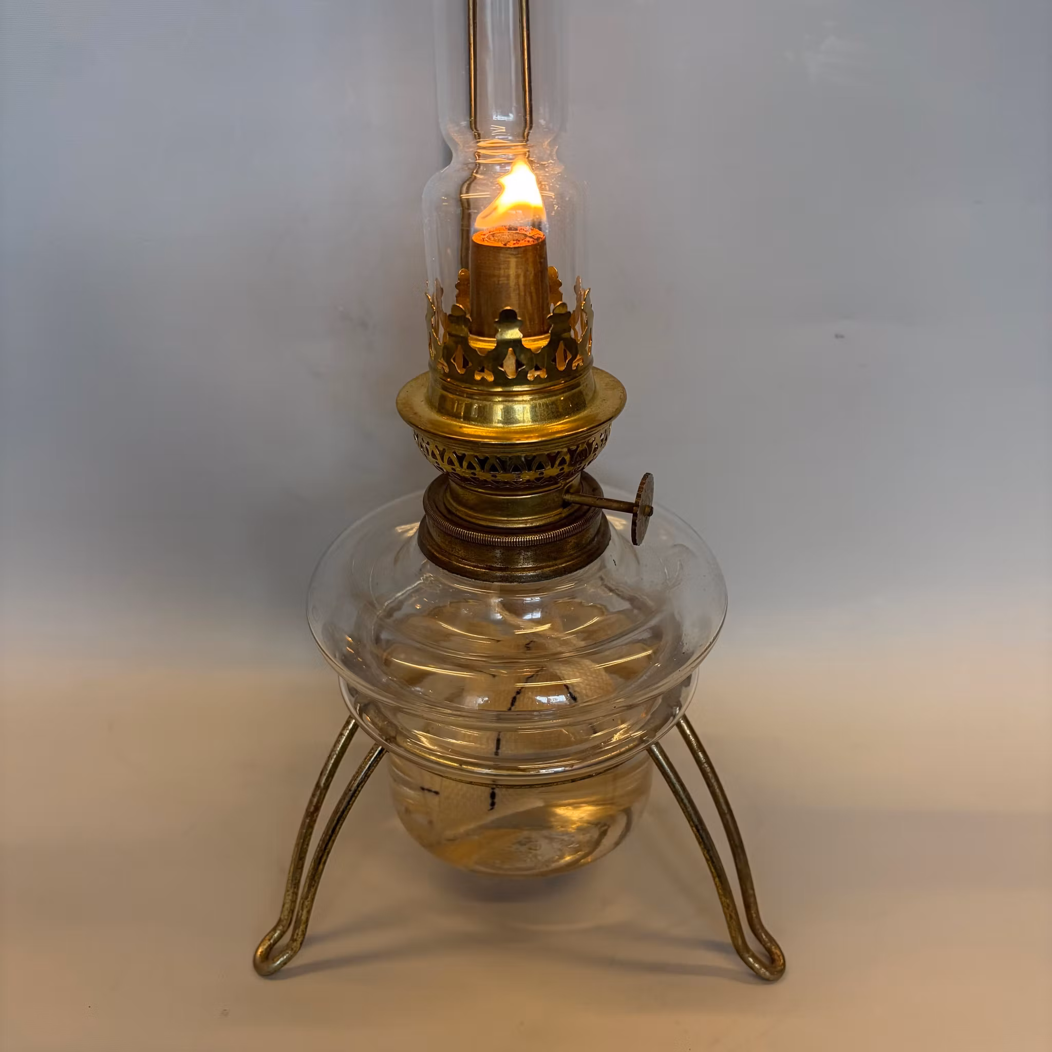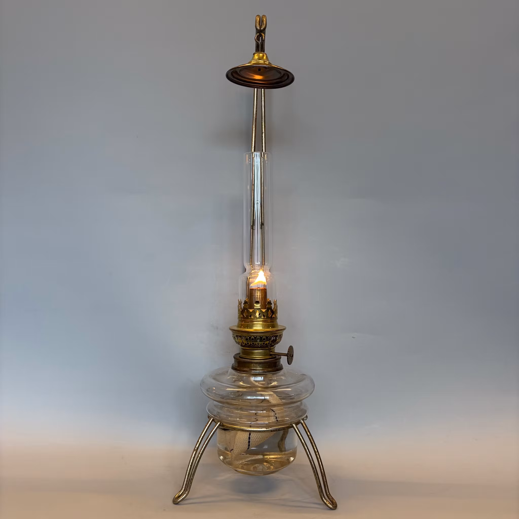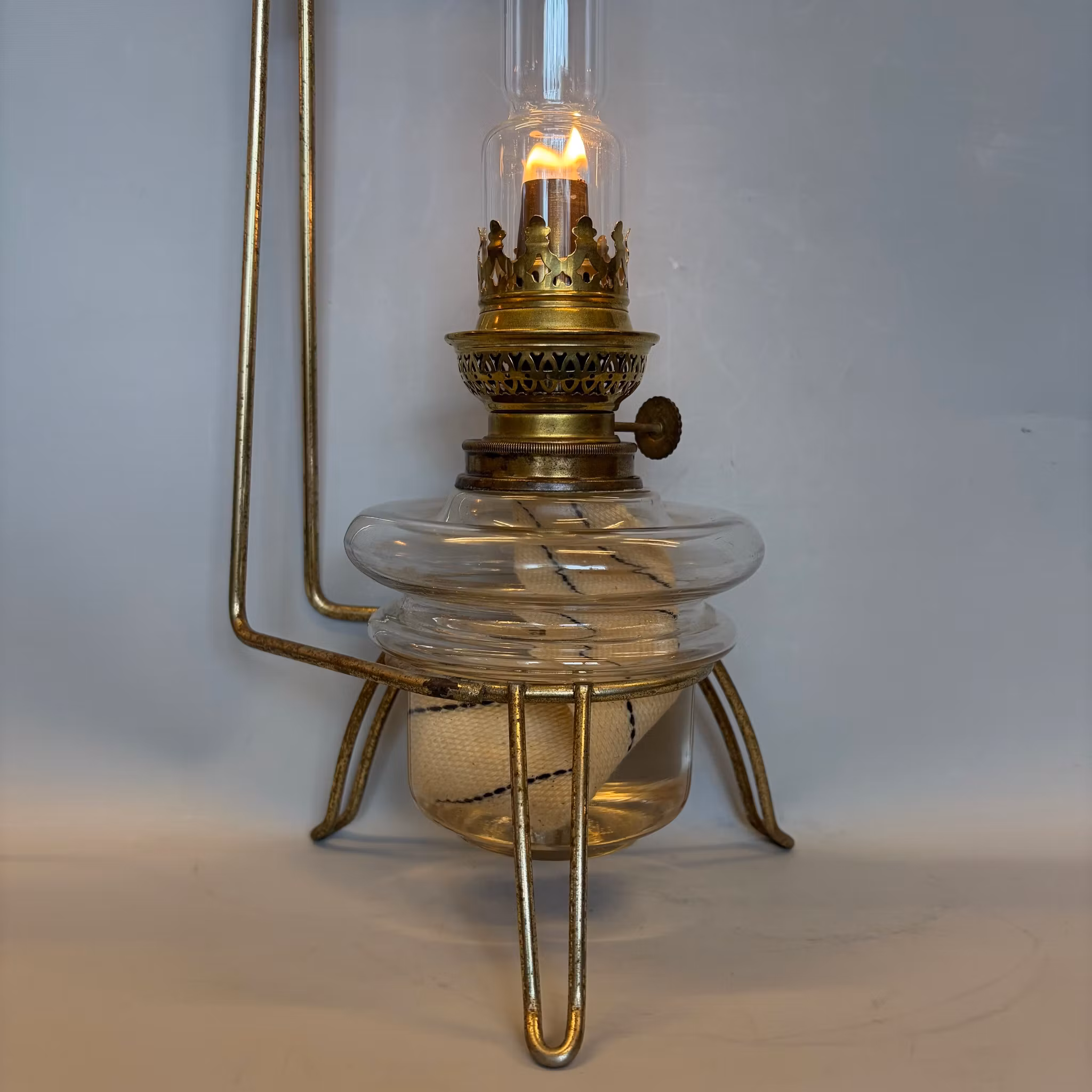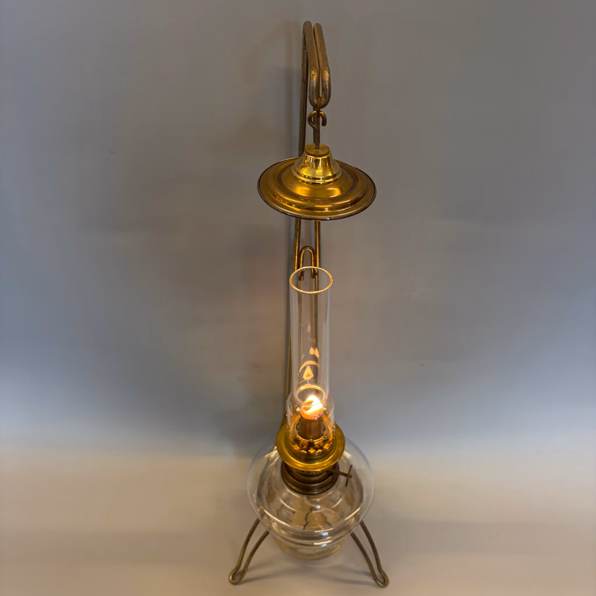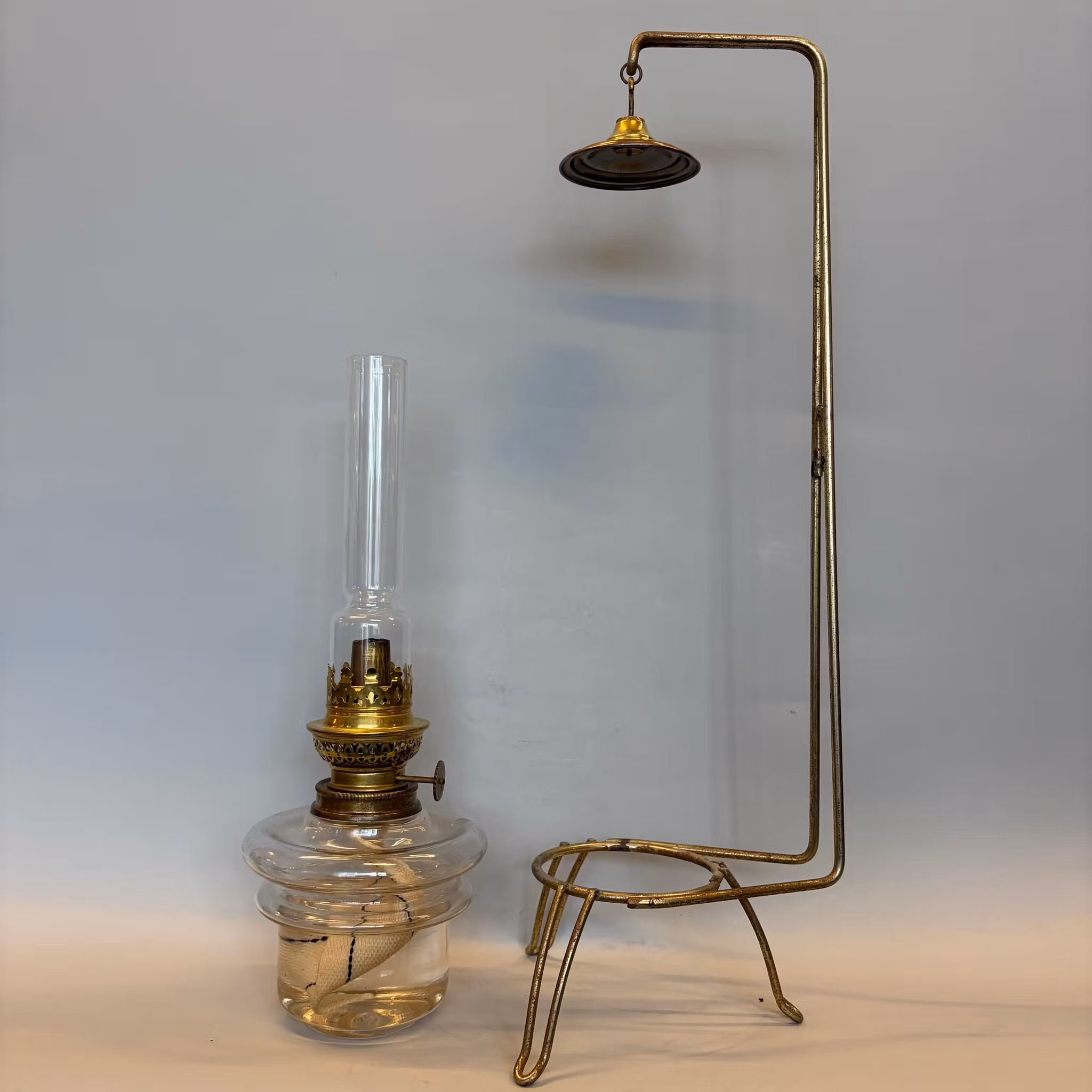 En klassisk bordsfotogenlampa som står i ett trebent stativ med hängande sotskydd ovanför glaset. Hela stativet kan stå på bordet eller med fördel hängas upp på väggen. Så det är en lampa med flera möjligheter.