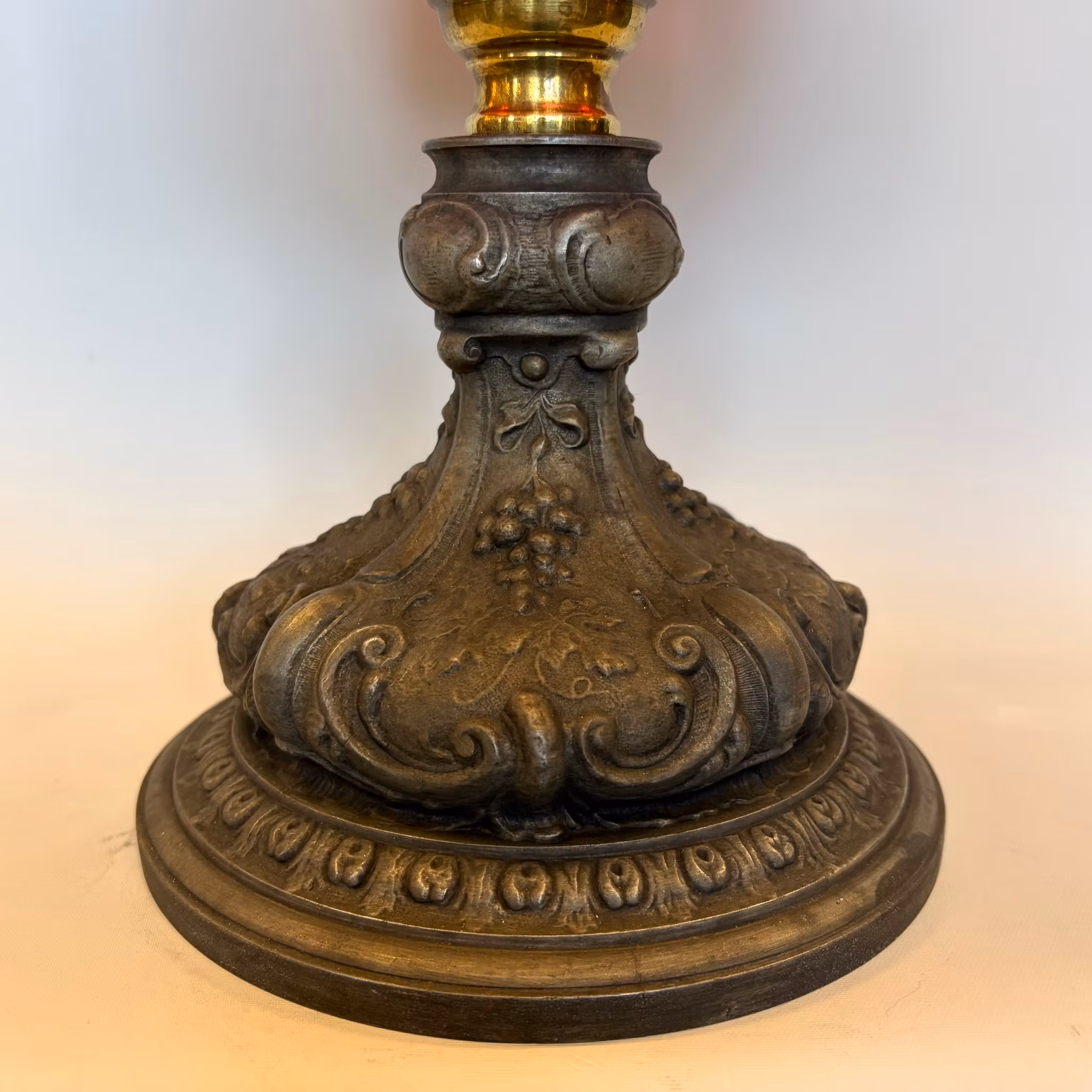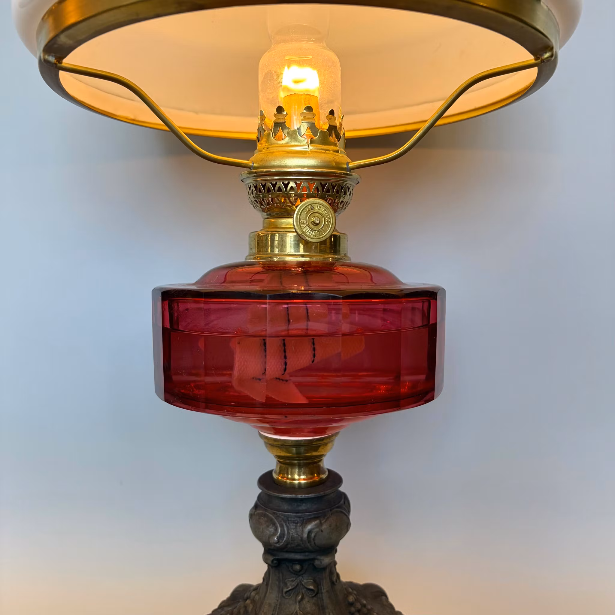 En antik fotogenlampa med vackert mörkrosa glasoljehus och en snygg fot med vindruvor samt en 10''' mässingsbrännare och skärmring. Vestaskärmen är 235 mm i nedre fattningen och har en snyggt veckad krage och lampglaset är stämplat.