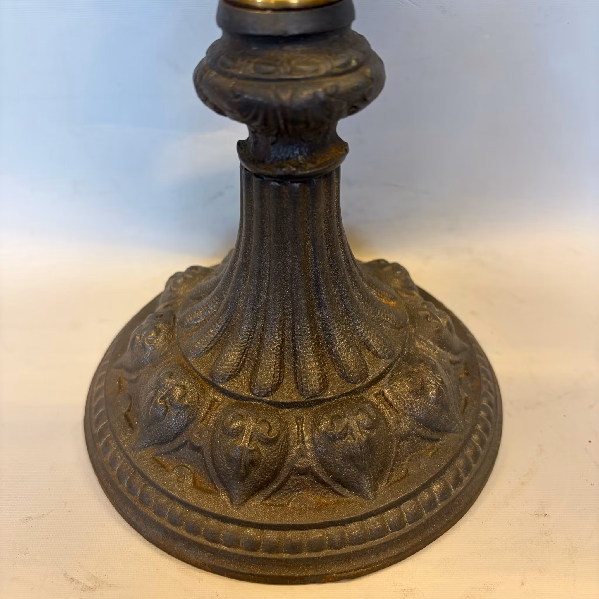 En klassisk mindre bordsfotogenlampa med äldre oljehus i glas och fot i zinkgjutgods.