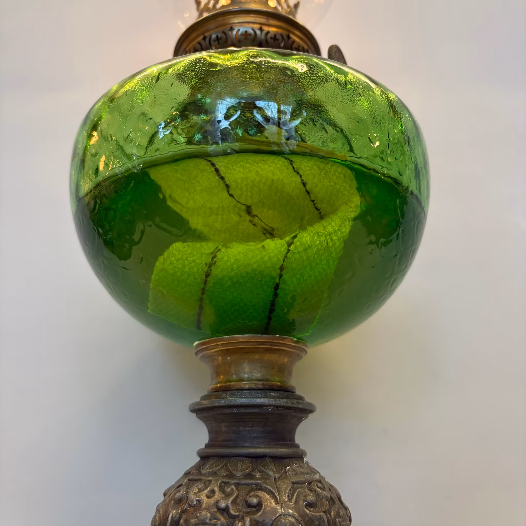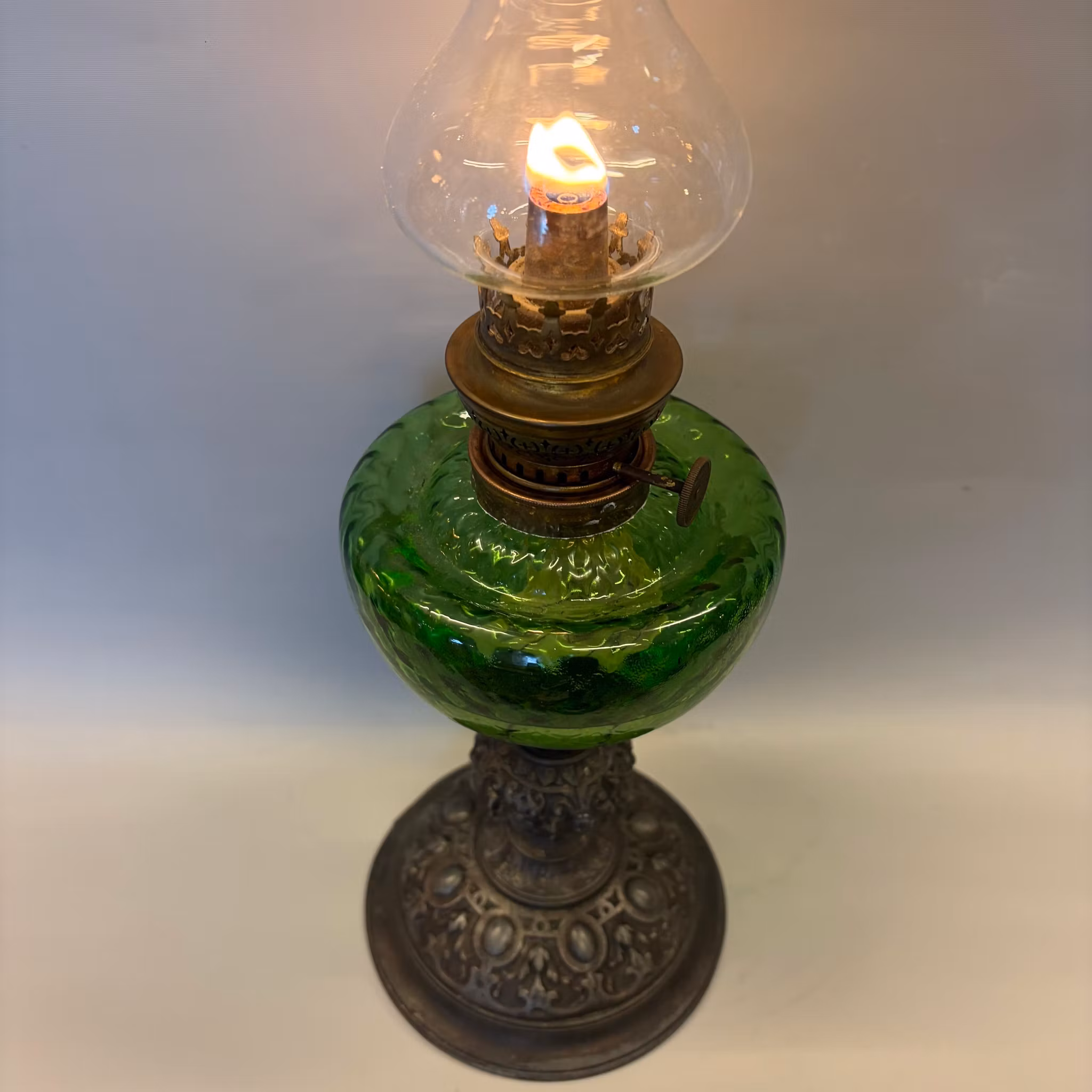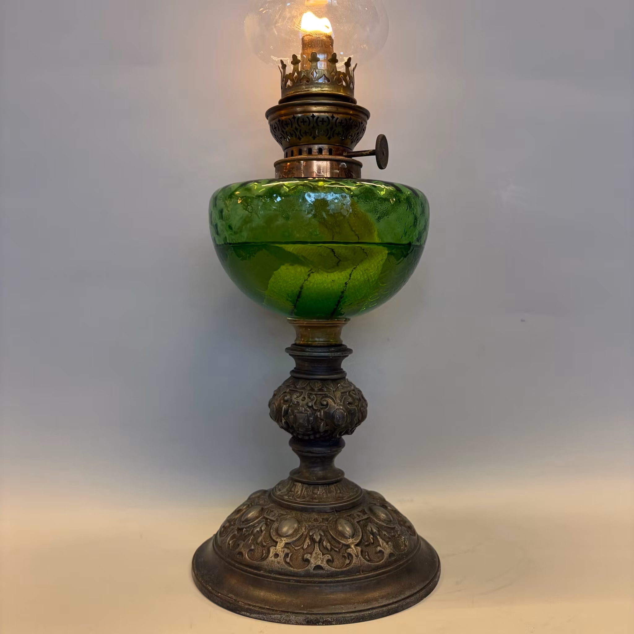 En klassisk bordsfotogenlampa med äldre oljehus i apoteksbrunt glas och lampfot i zinkgjutgods.