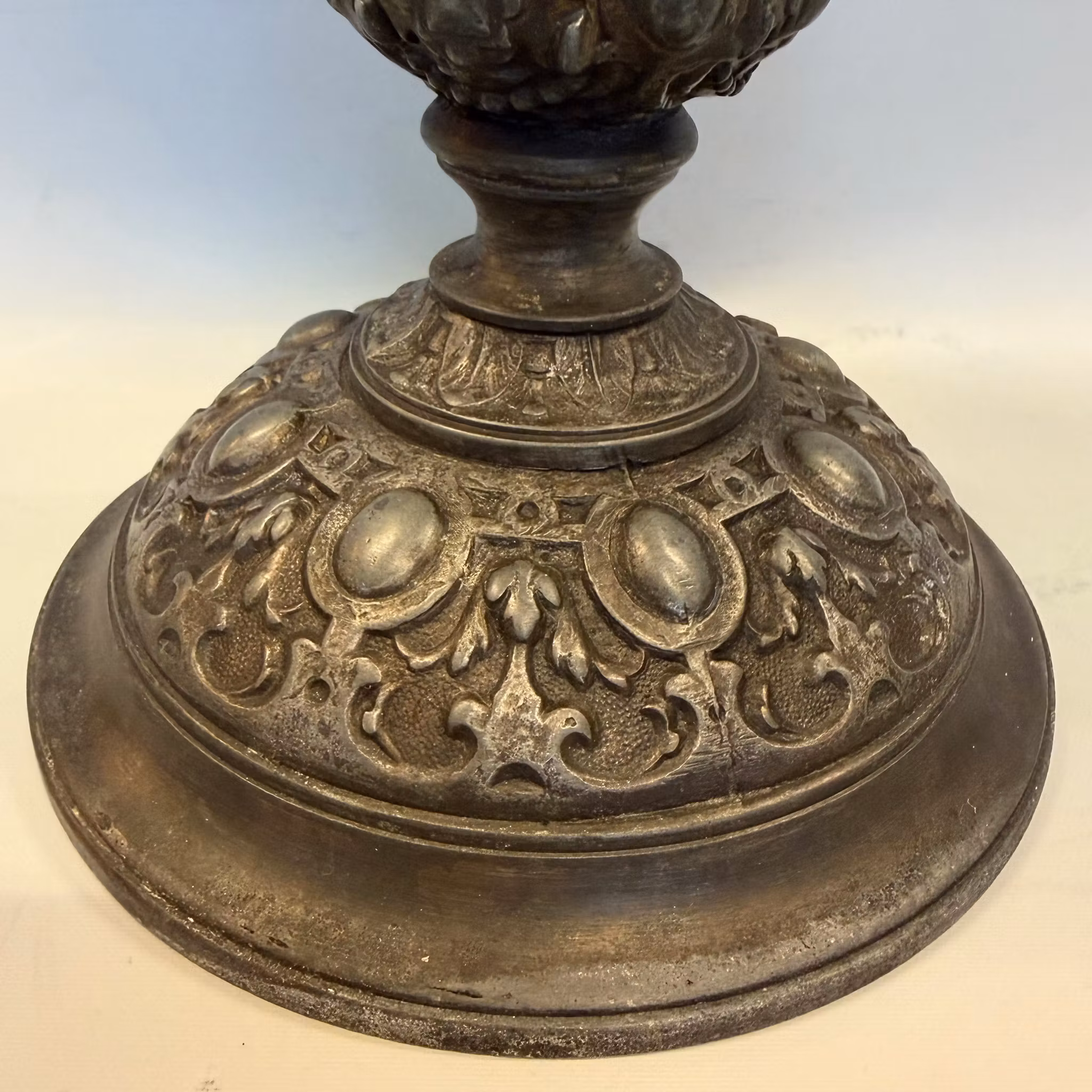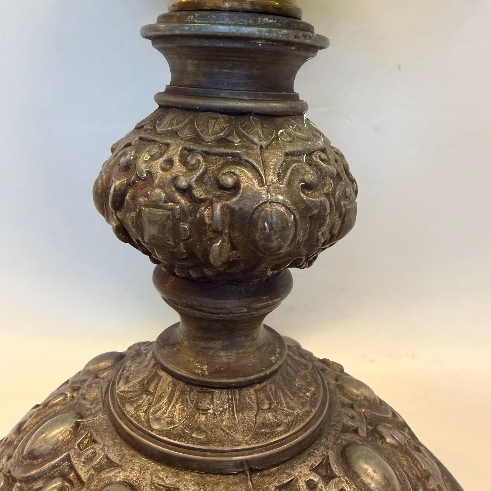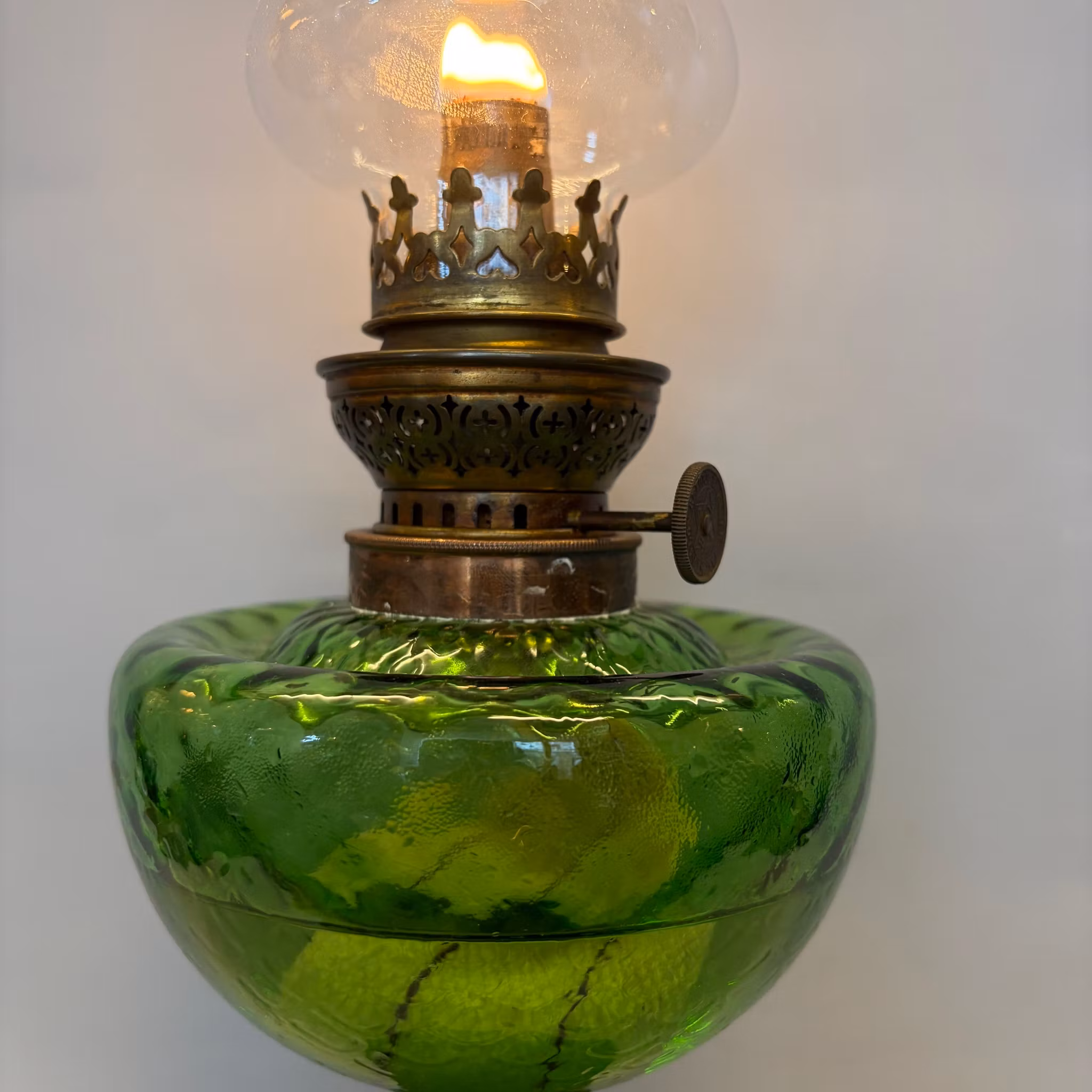 En klassisk bordsfotogenlampa med äldre oljehus i apoteksbrunt glas och lampfot i zinkgjutgods.