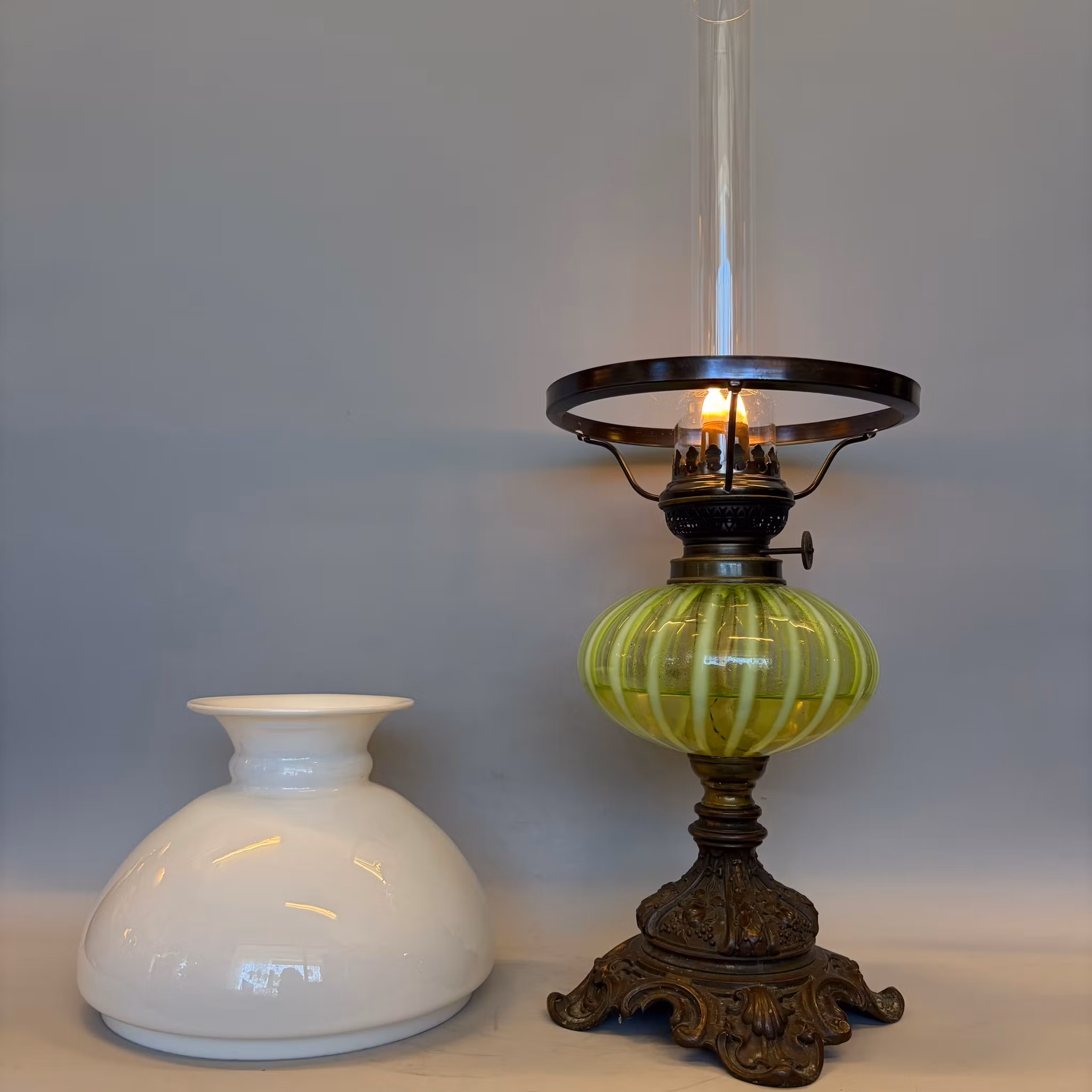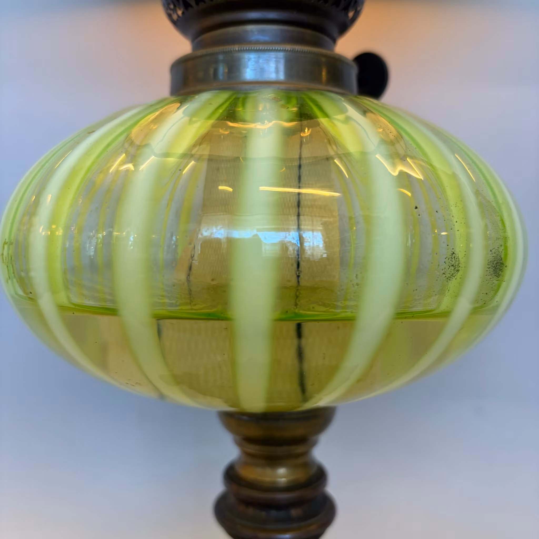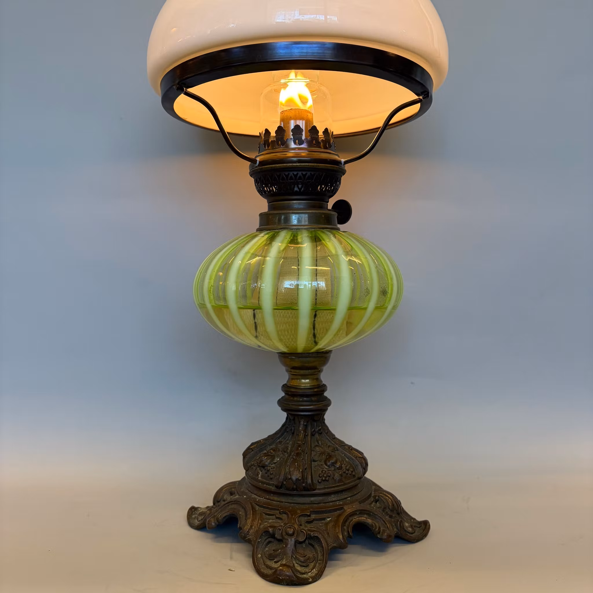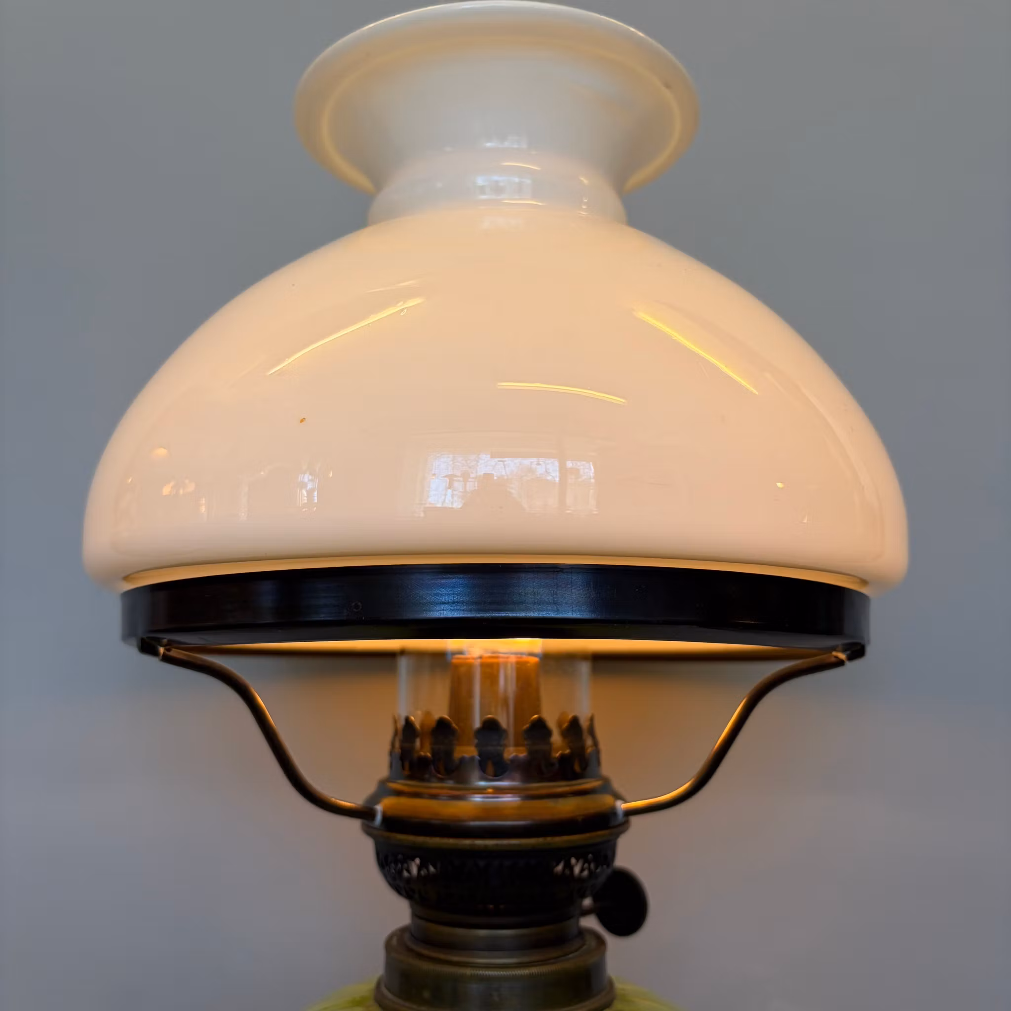 En antik bordsfotogenlampa med gul/grönt glasoljehus i uranglas som lyser i UV-ljus. Elegant antik vestaskärm som är 19 cm i nedre fattning med snygg vikt kragkant.