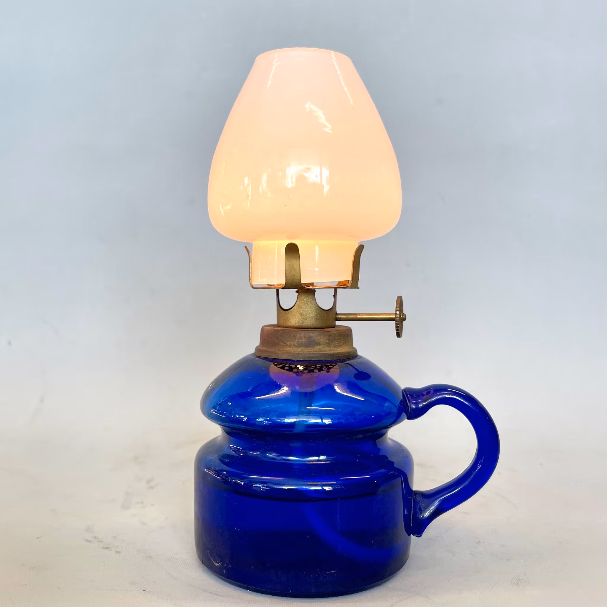 En jättesöt liten fotogenlampa med oljehus i blått glas med opalvitt lampglas.