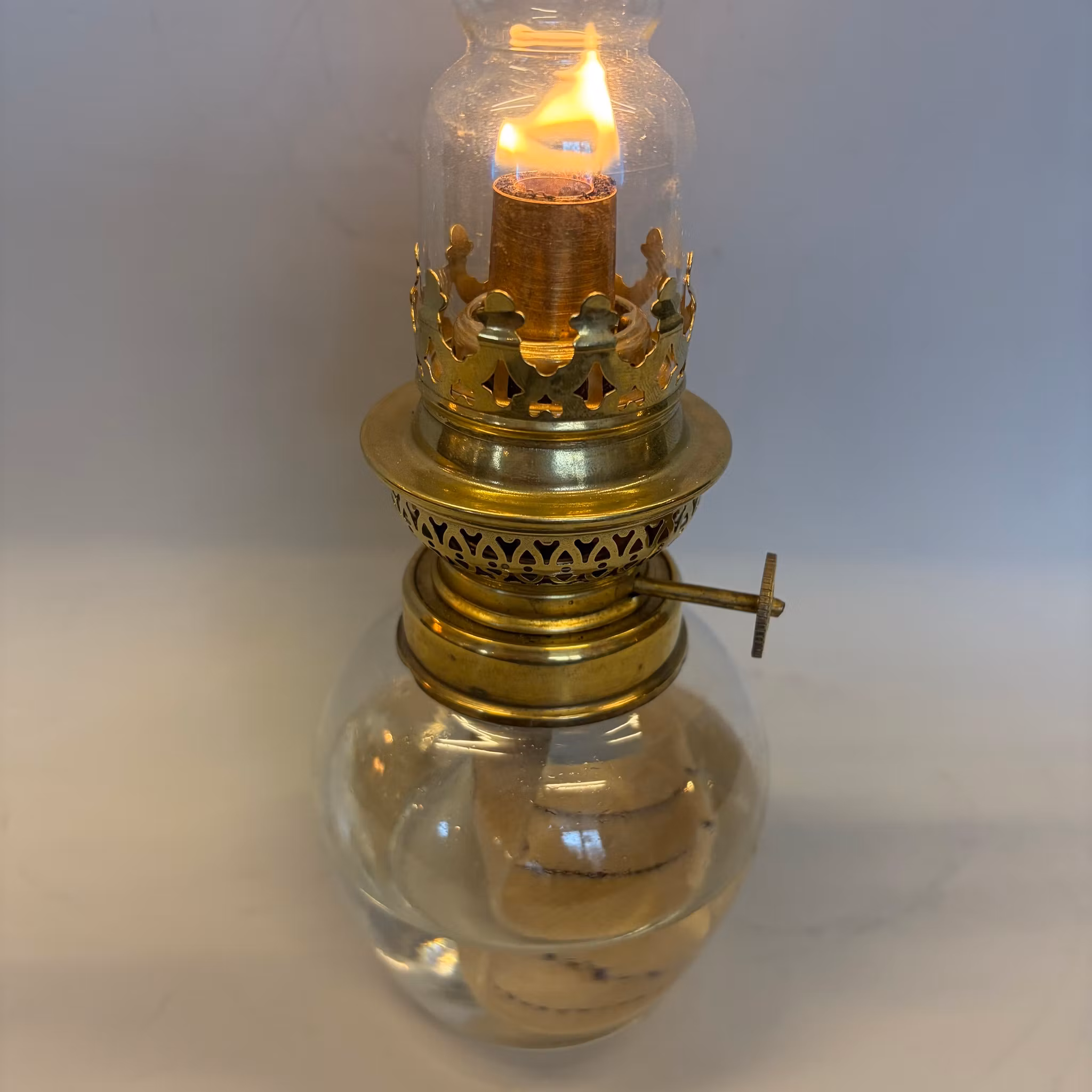 Det här är en äldre riktigt söt fotogenlampa med praktiskt oljehus i glas så man alltid ser när det är dags att fylla på med lampolja.