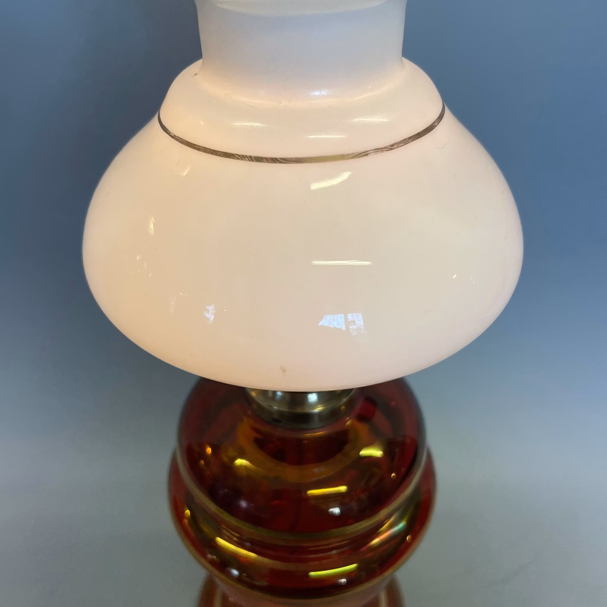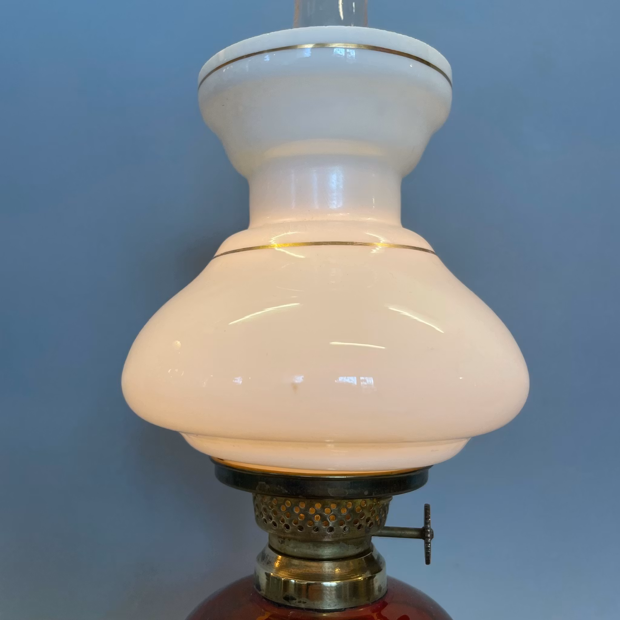 Väldigt söt hallonrosa fotogenlampa med opalvit vestaskärm i miniatyrmodell.