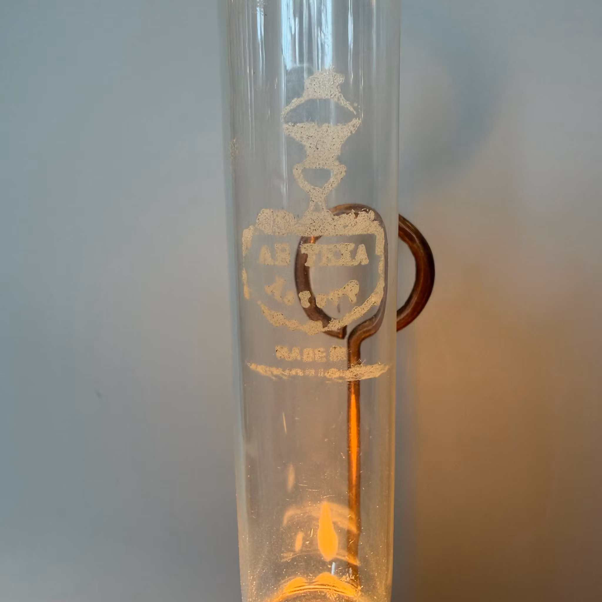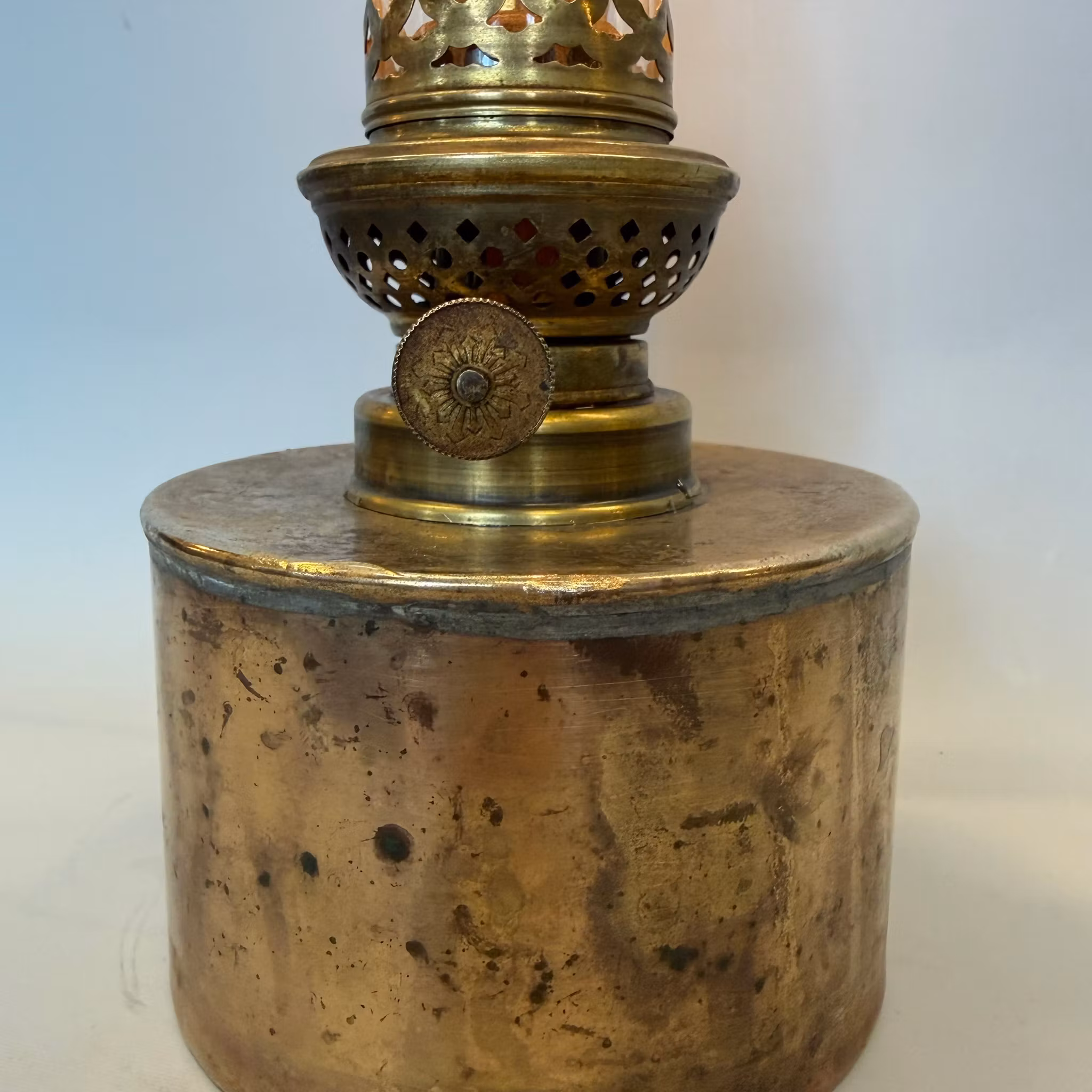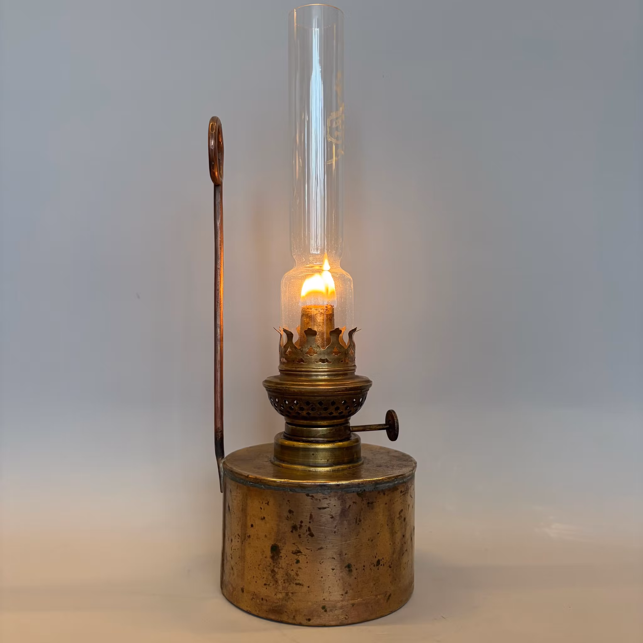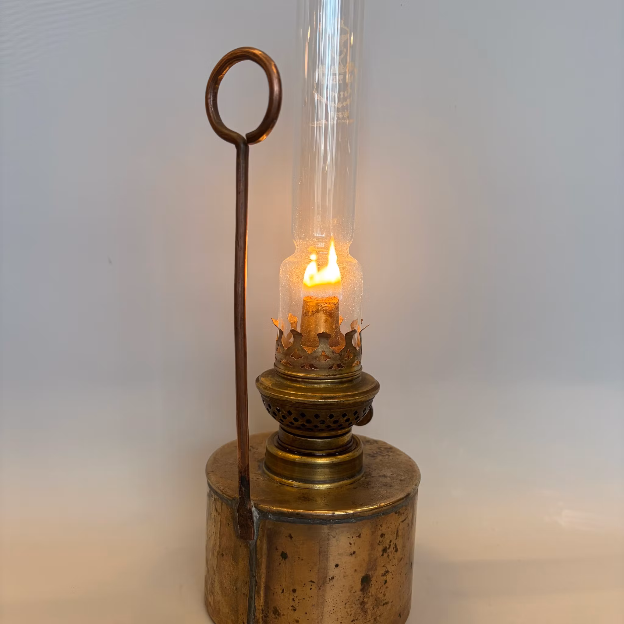 En oxiderad gammal fotogenlampa i mässing och en äldre 8''' flatbrännare med stämplat kosmosglas. Har ett litet handtag så den går att hänga på väggen.