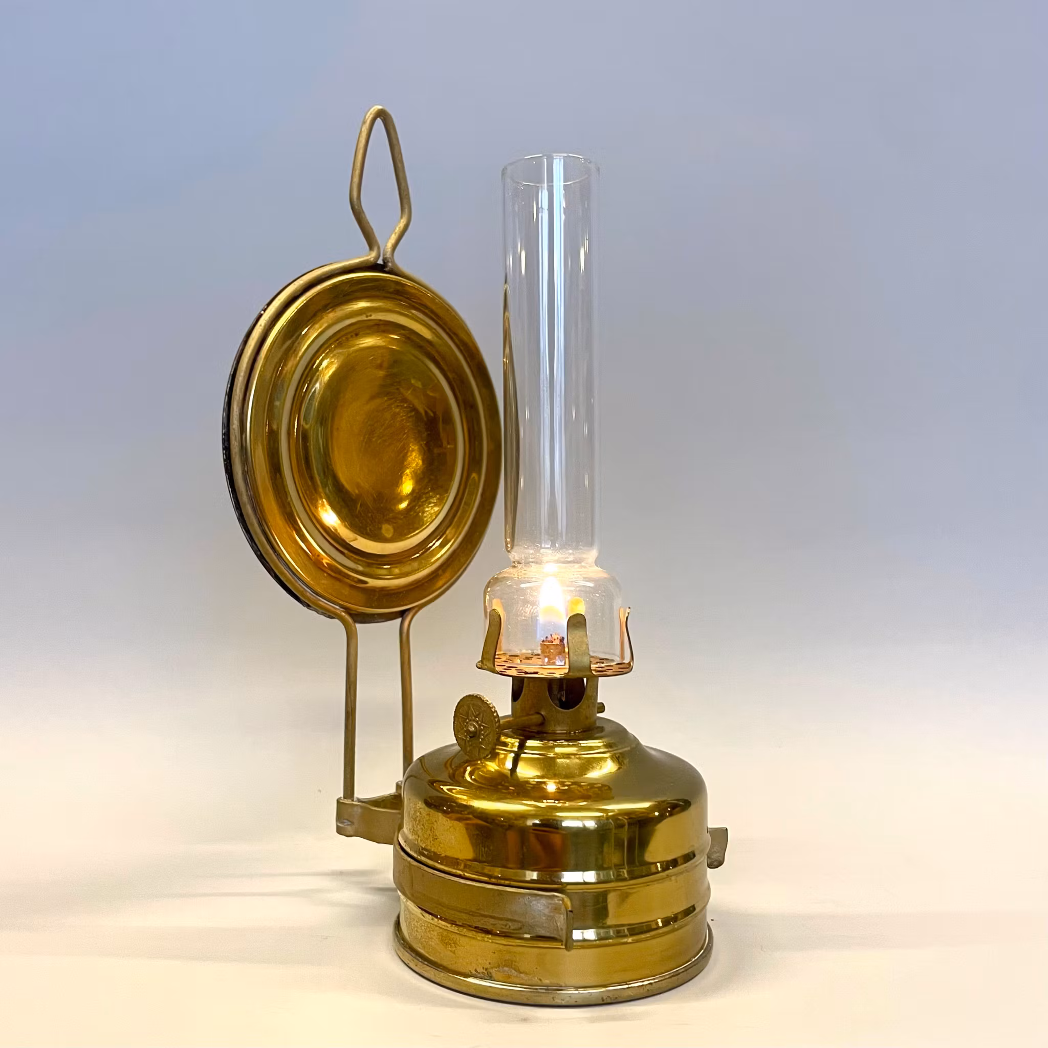 Miniatyrfotogenlampa med stjärnbrännare och oljehus samt väggreflektor i mässing.