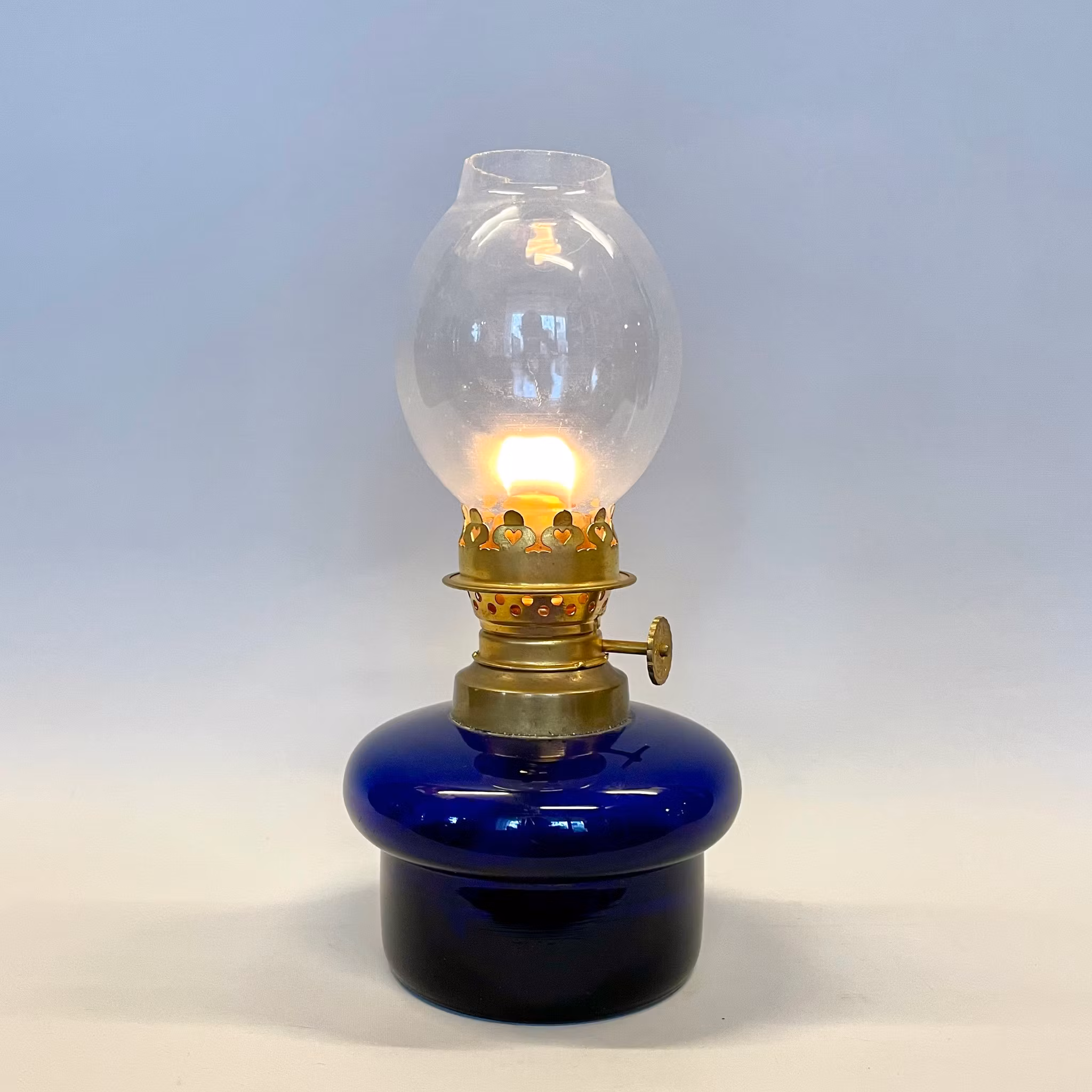 En liten mörkblå fotogenlampa med 5''' flatbrännare och äggformat lampglas.
