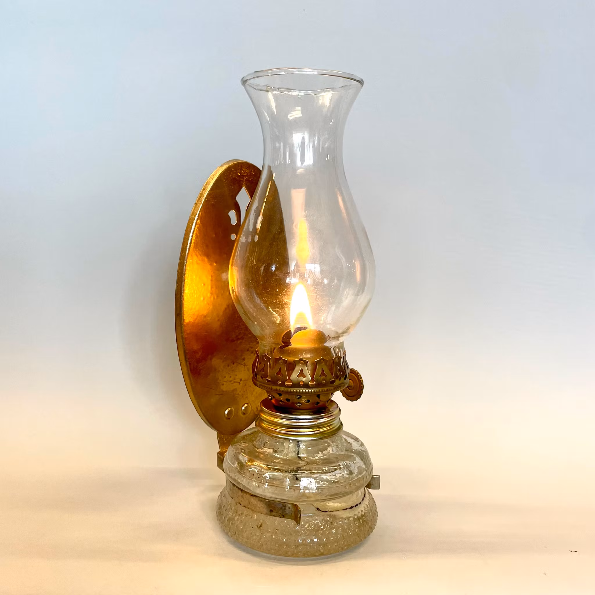 En udda liten väggfotogenlampa. Lökformat glas och guldmålad väggreflektor.