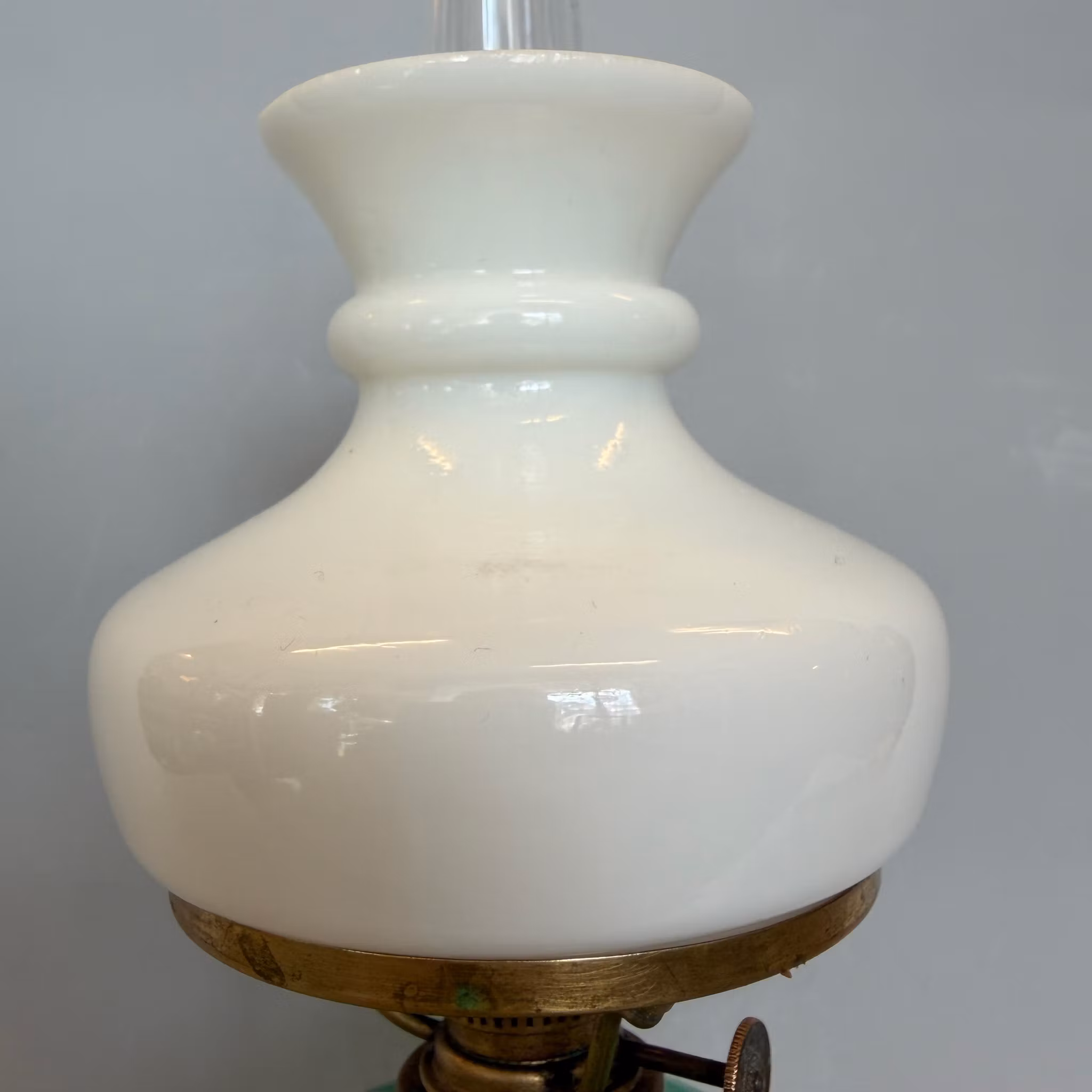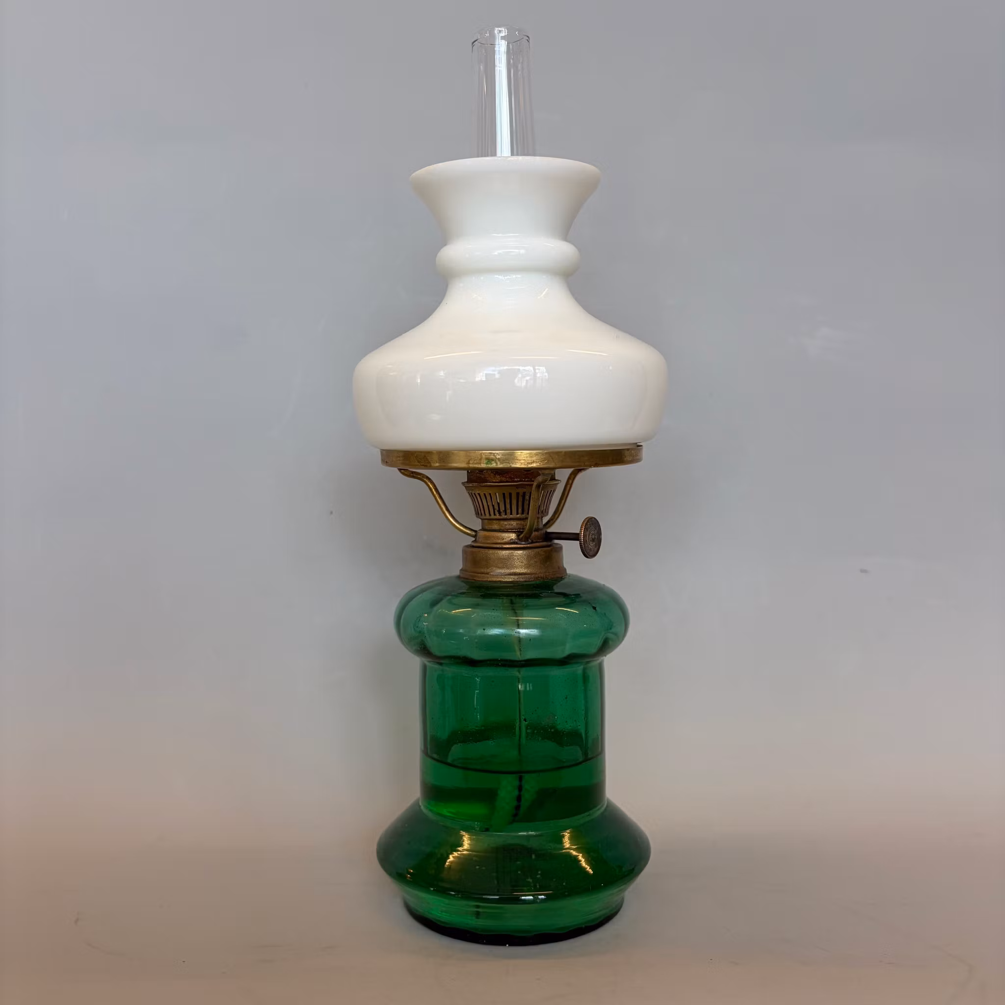Superläcker liten fotogenlampa med 2''' flatbrännare och oljehus i grönt glas. Ovanlig liten skärmring för 75 mm vestaskärmar - denna lampa har antik skärm också. Lökformat glas.