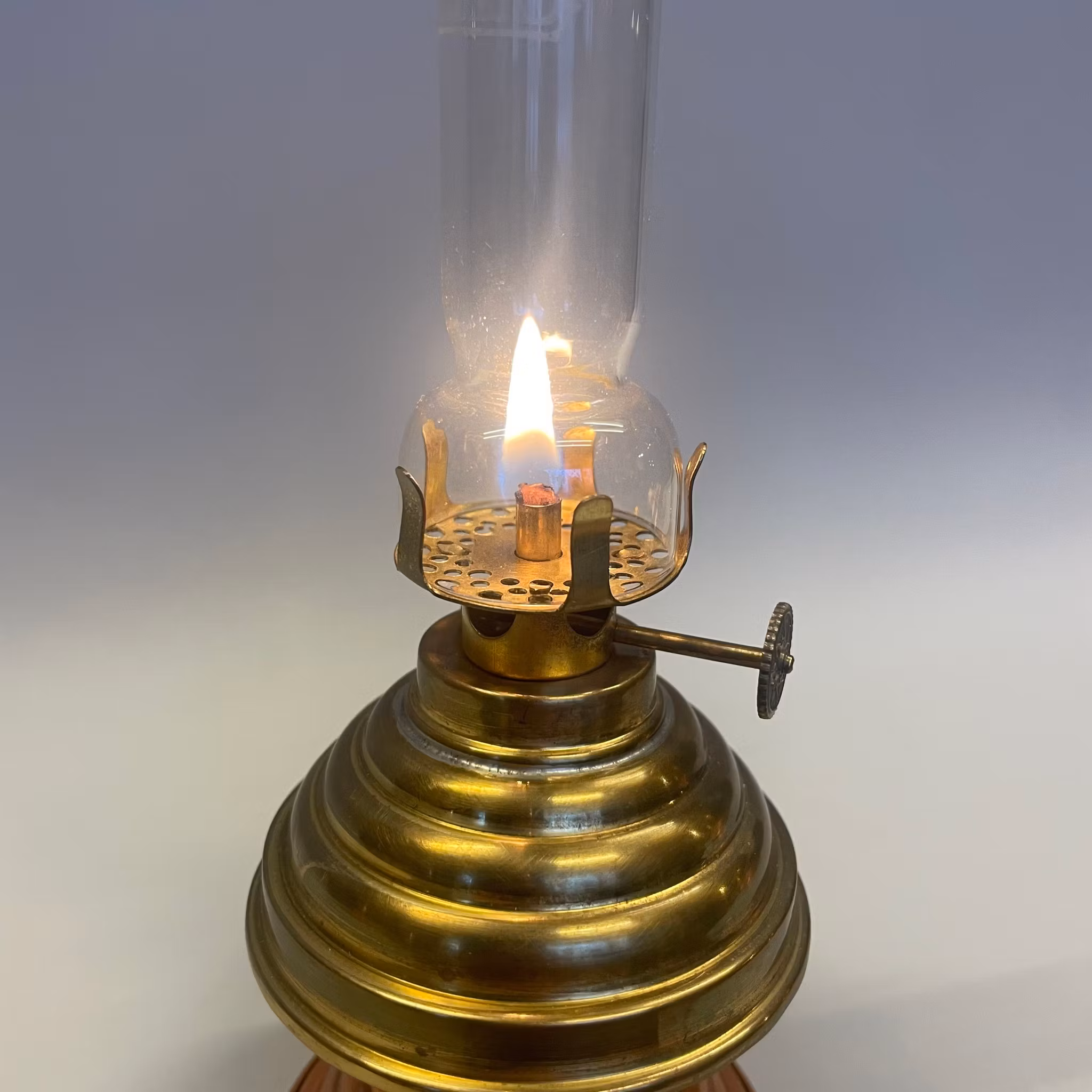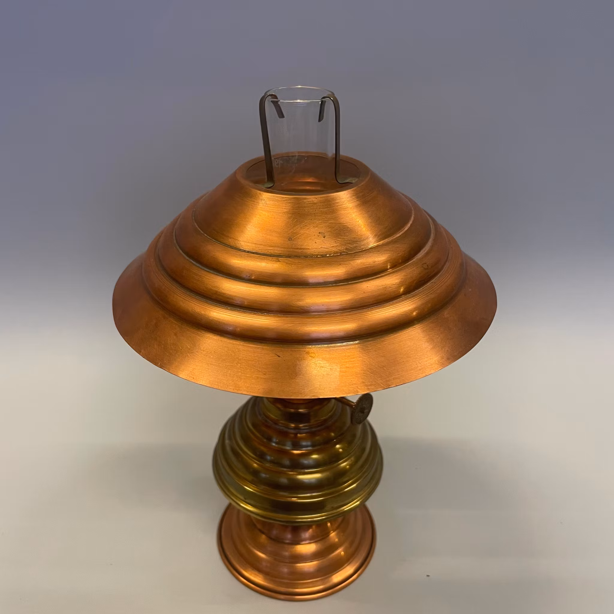 En gullig liten fotogenlampa med stjärnbrännare och en liten kopparskärm som hänger på glaset.