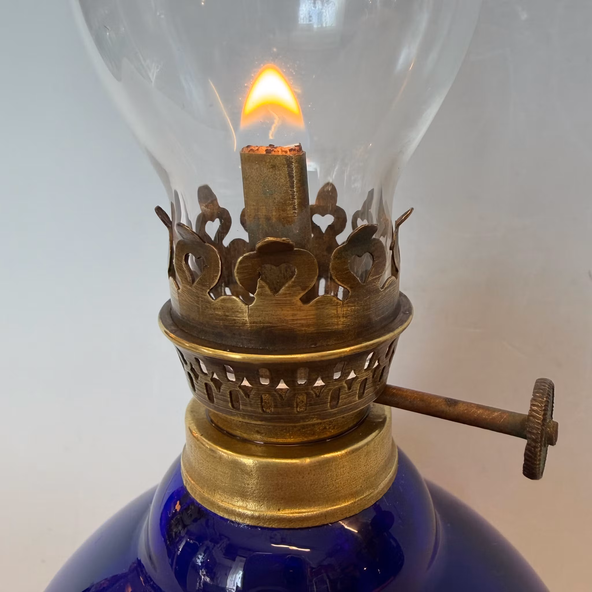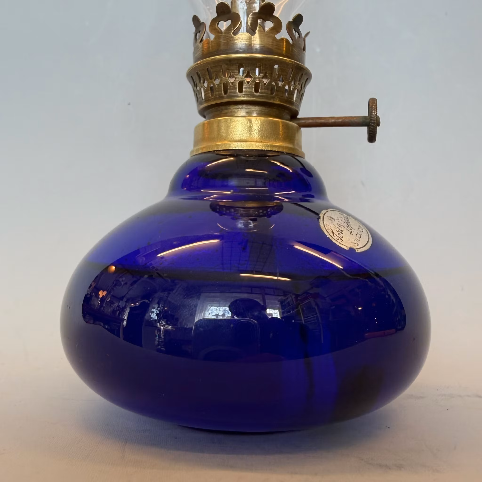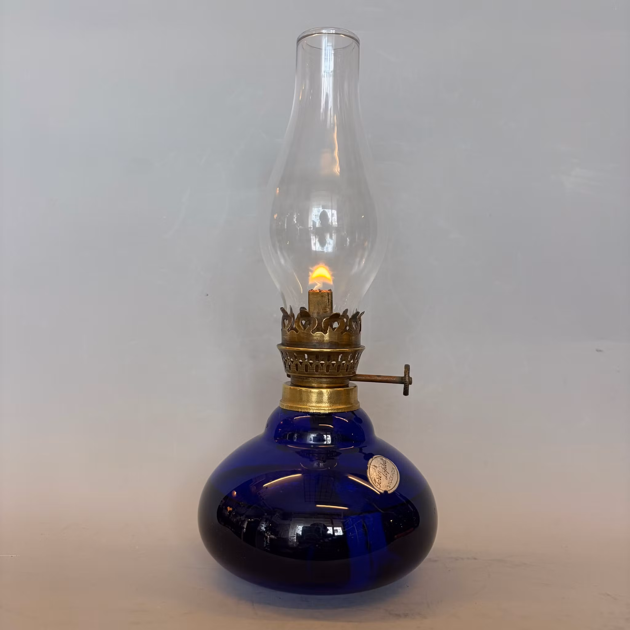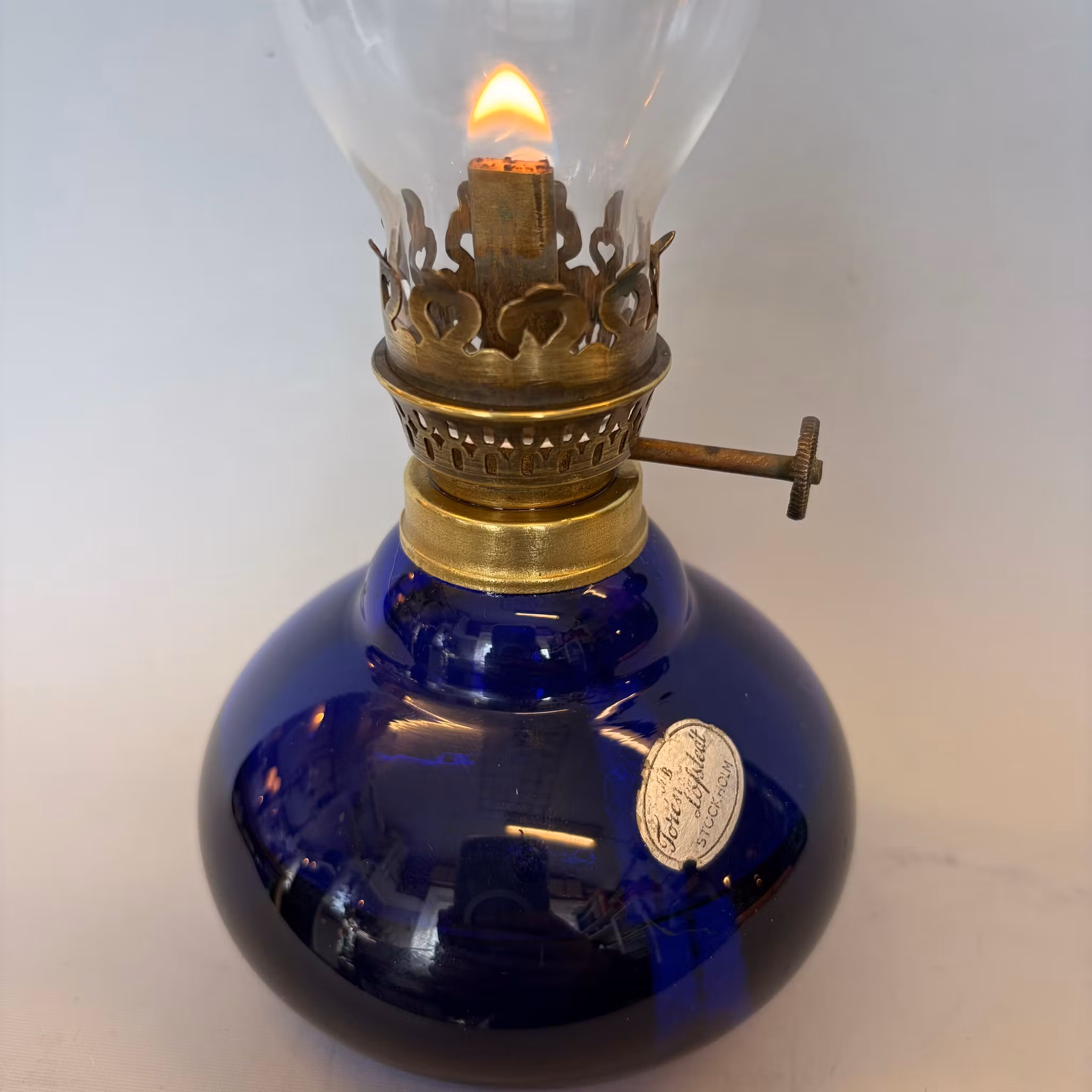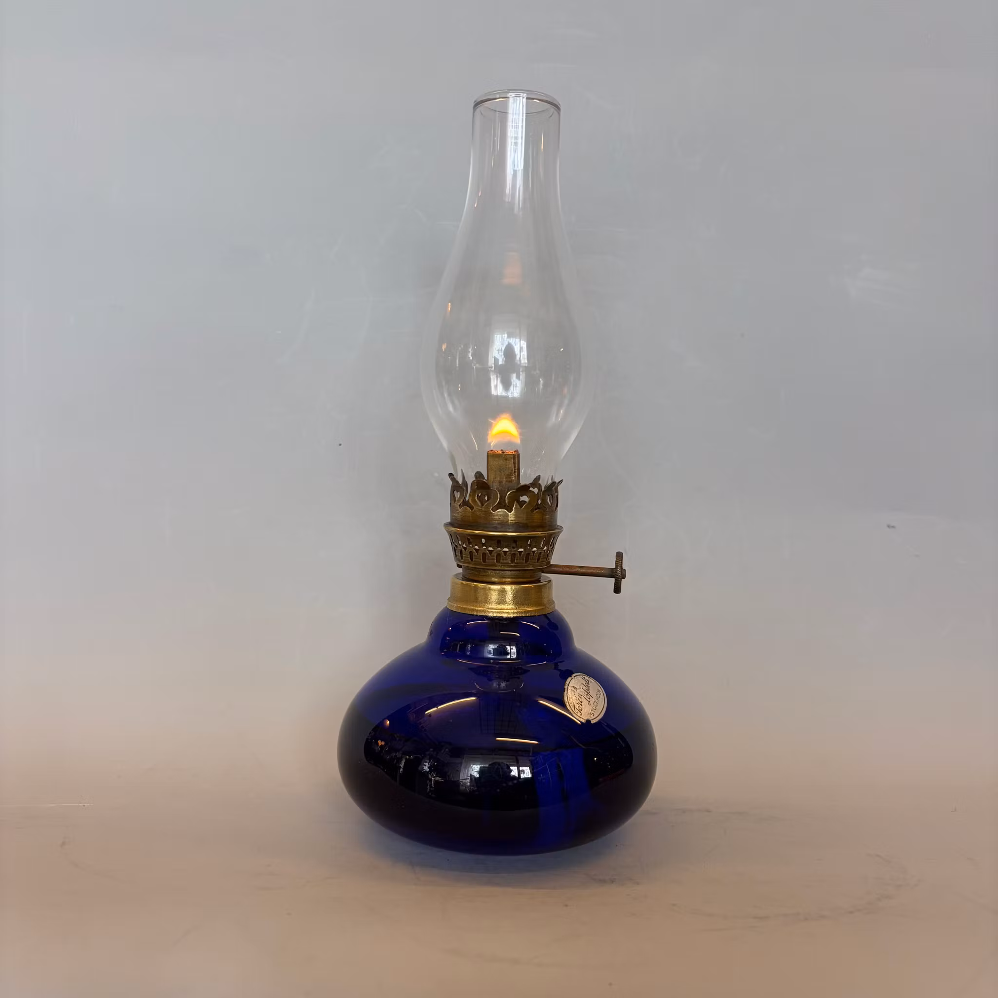 En söt liten fotogenlampa med marinblått oljehus i glas.