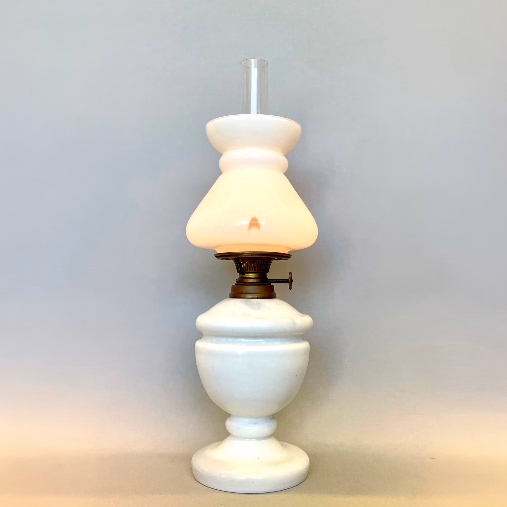 Väldigt vacker antik fotogenlampa med opalvit glasfot och miniskärm i opalglas.