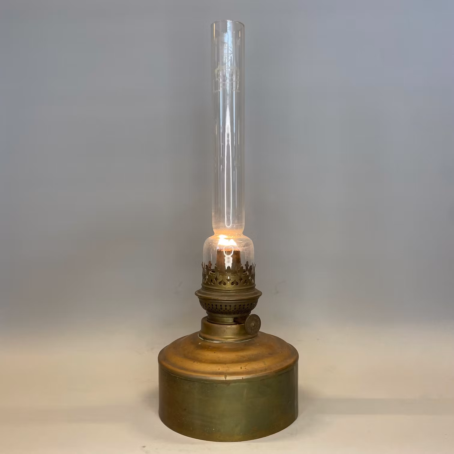 Det här är en äldre mässingsfotogenlampa med snygg patina och stort oljehus.